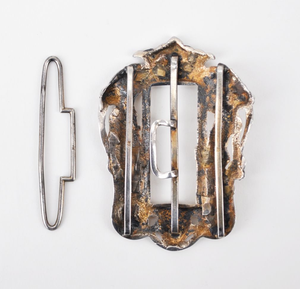 velká secesní stříbrná spona k textilnímu opasku, použitelná na šátek nebo šál, výrazně plasticky zdobená, kvalitní stříbrnická práce, Ag 36,55g/800/000, kolem roku 1900, západní Evropa; atest Puncovního úřadu; délka 7,5 cm, šířka 5,5 cm