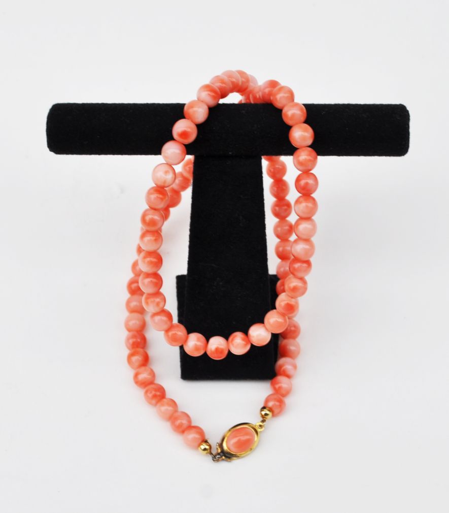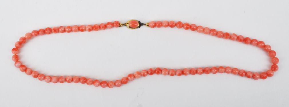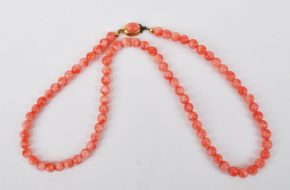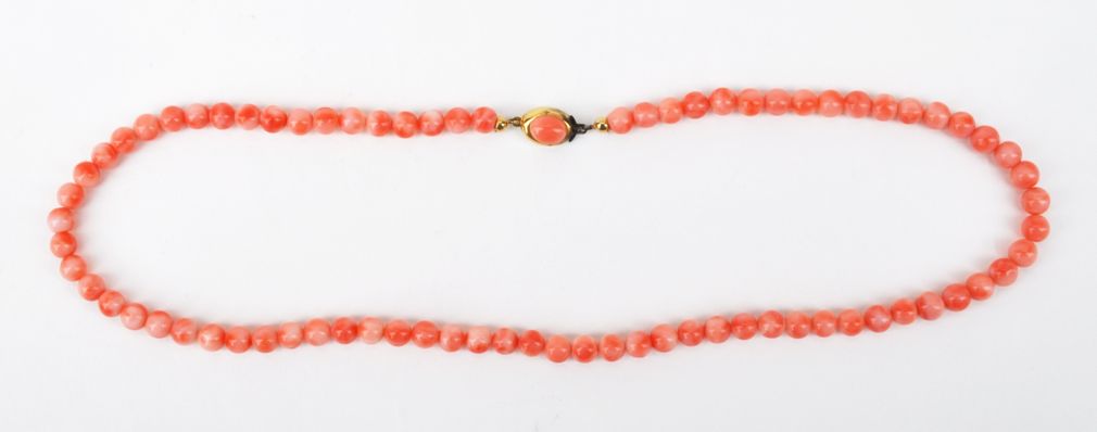 náhrdelník z růžových středomořských korálů, zapínání z obecného kovu, 60. léta 20. století, západní Evropa; délka 49 cm
