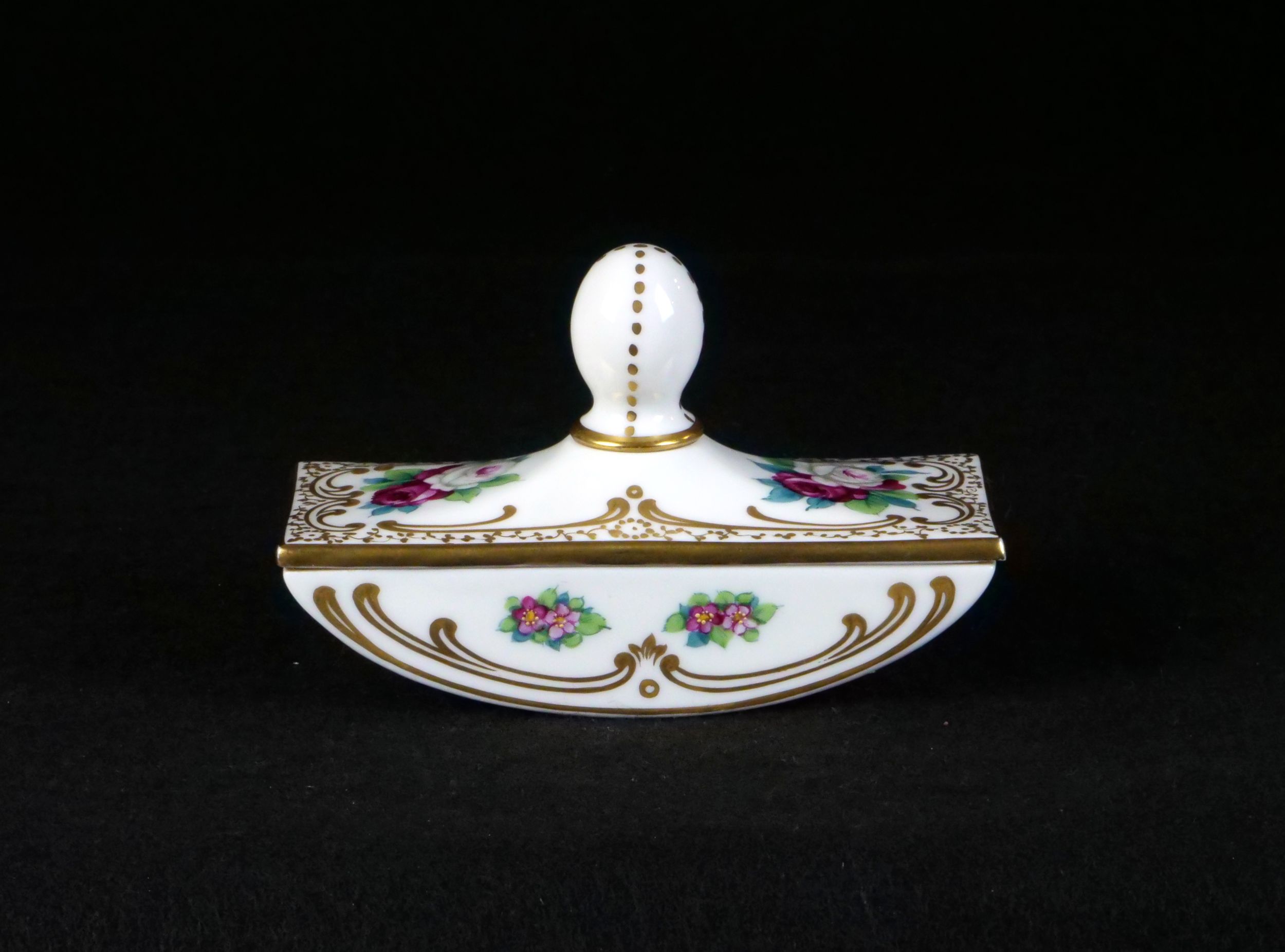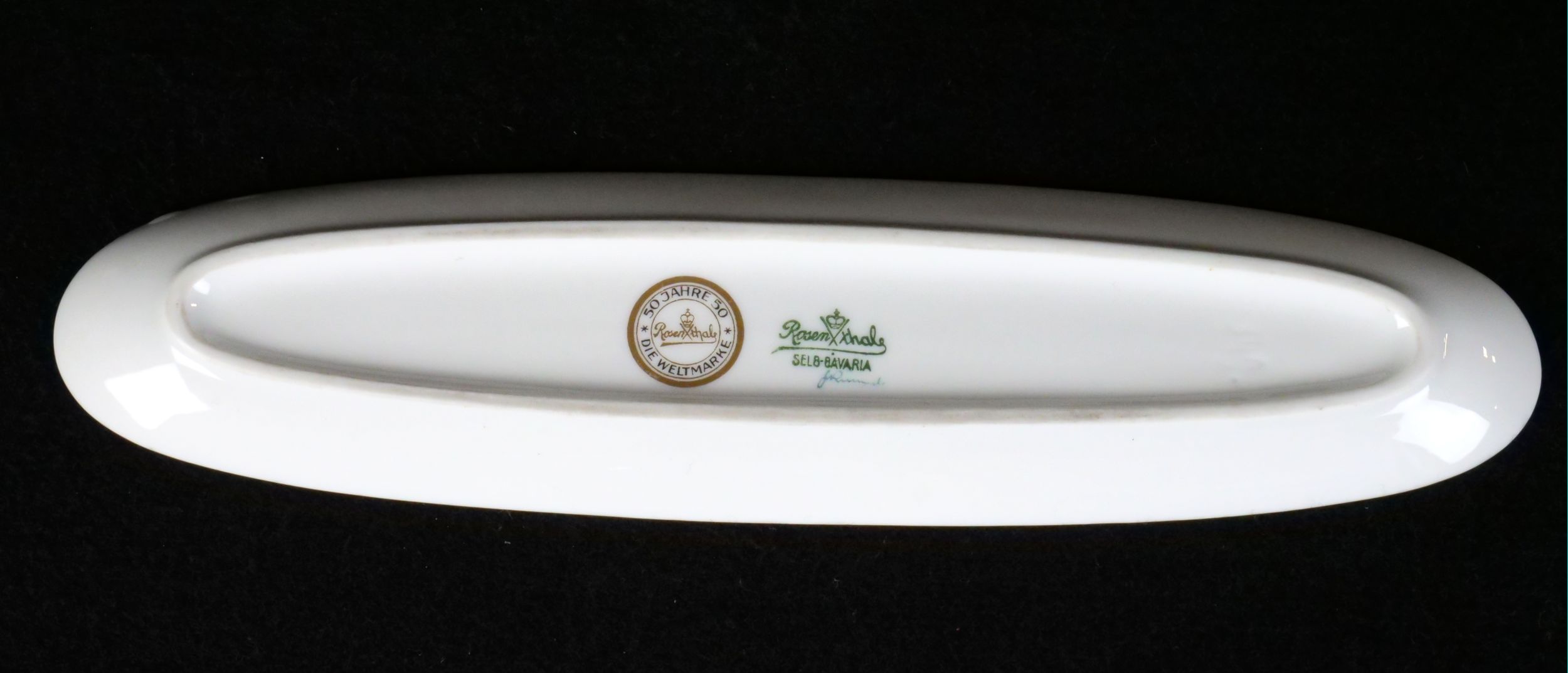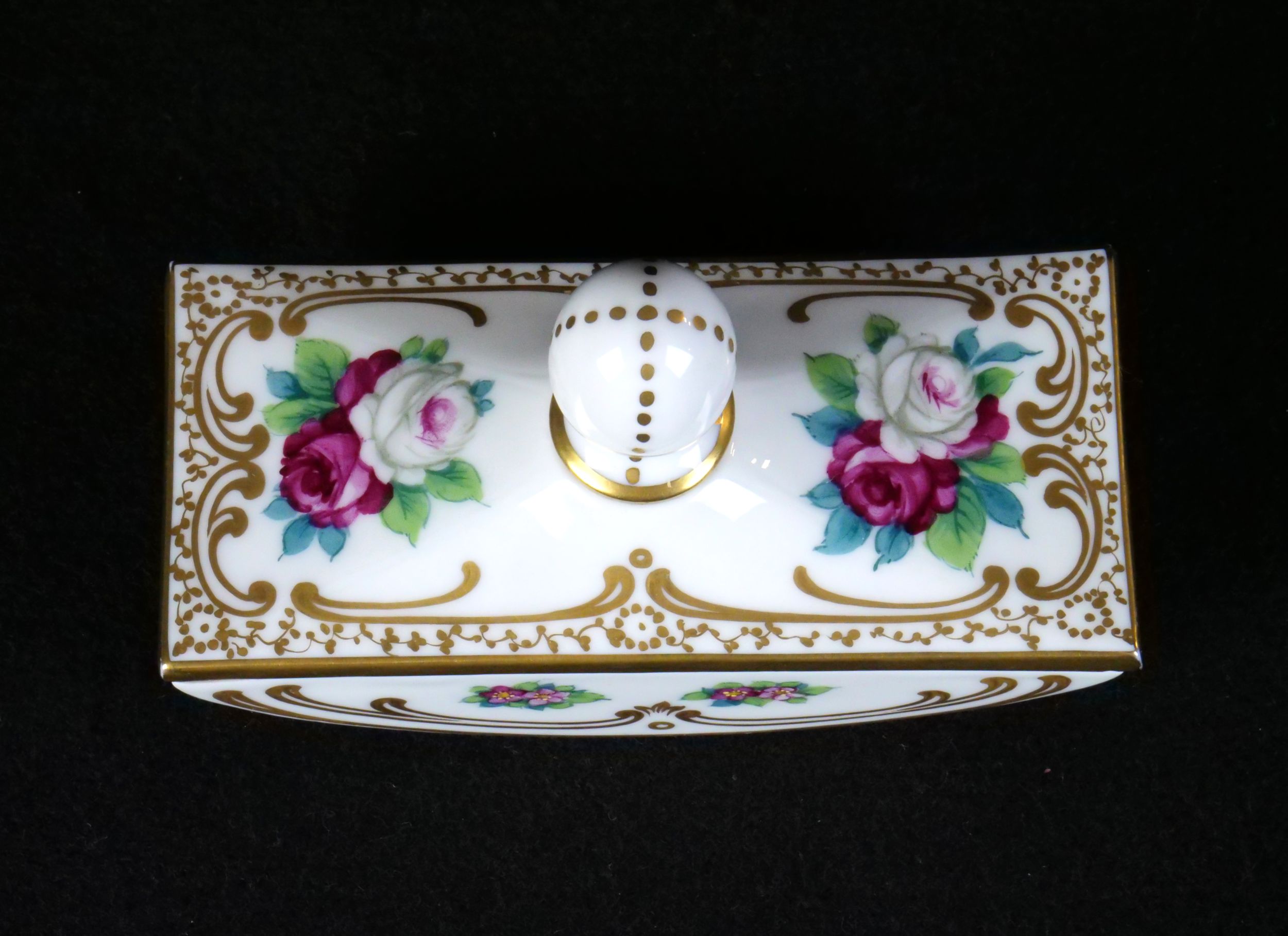 dámská stolní psací souprava značky Rosenthal, 4 kusy - kalamář s podmiskou, miska na pera, miska na drobnosti a kolíbka na vysoušení inkoustu, výroční značení k 50. výročí vzniku porcelánky, Německo 1929; délka misky na pera 24,5 cm, výška vysoušecí kolíbky 6,5 cm; sběratelsky zajímavé