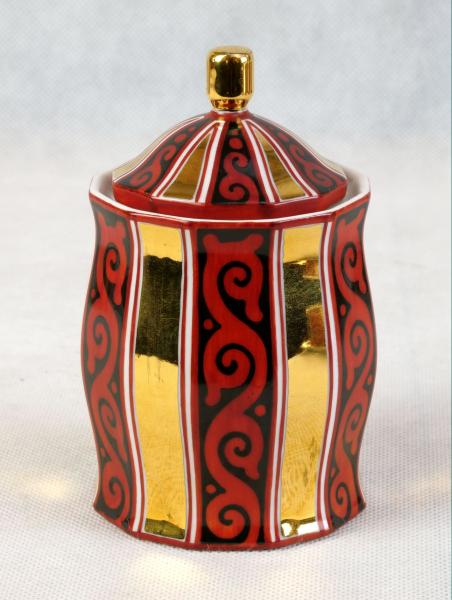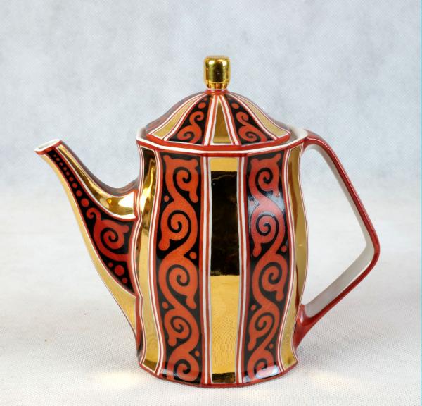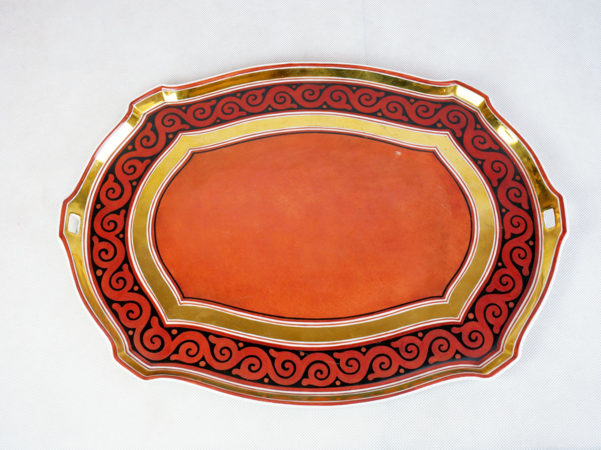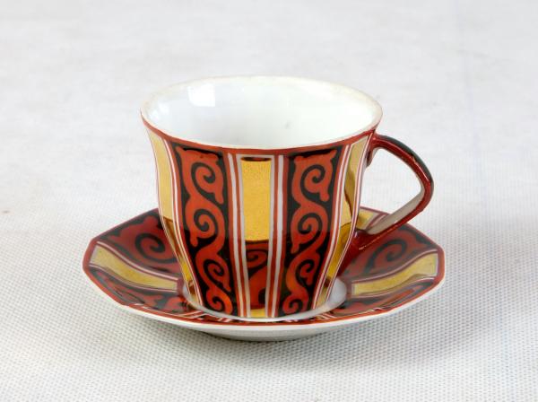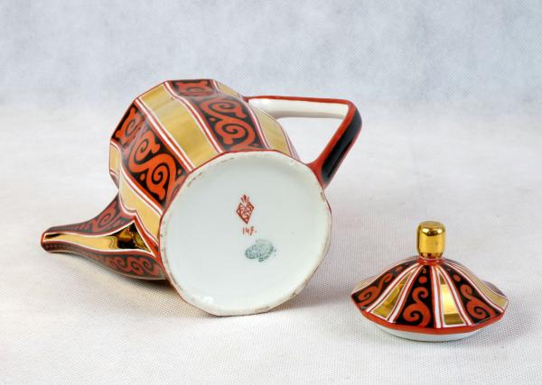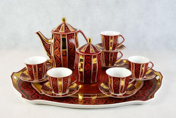 dekorativní servis z jemného porcelánu o 9 kusech, tvar podle návrhu Pavla Janáka, výrazný barevný a bohatě zlacený dekor, vyrobila fa Schnabel & Sohn ve spolupráci s malírnou Flekna & Strádal ze Semil; Československo, kolem roku 1925