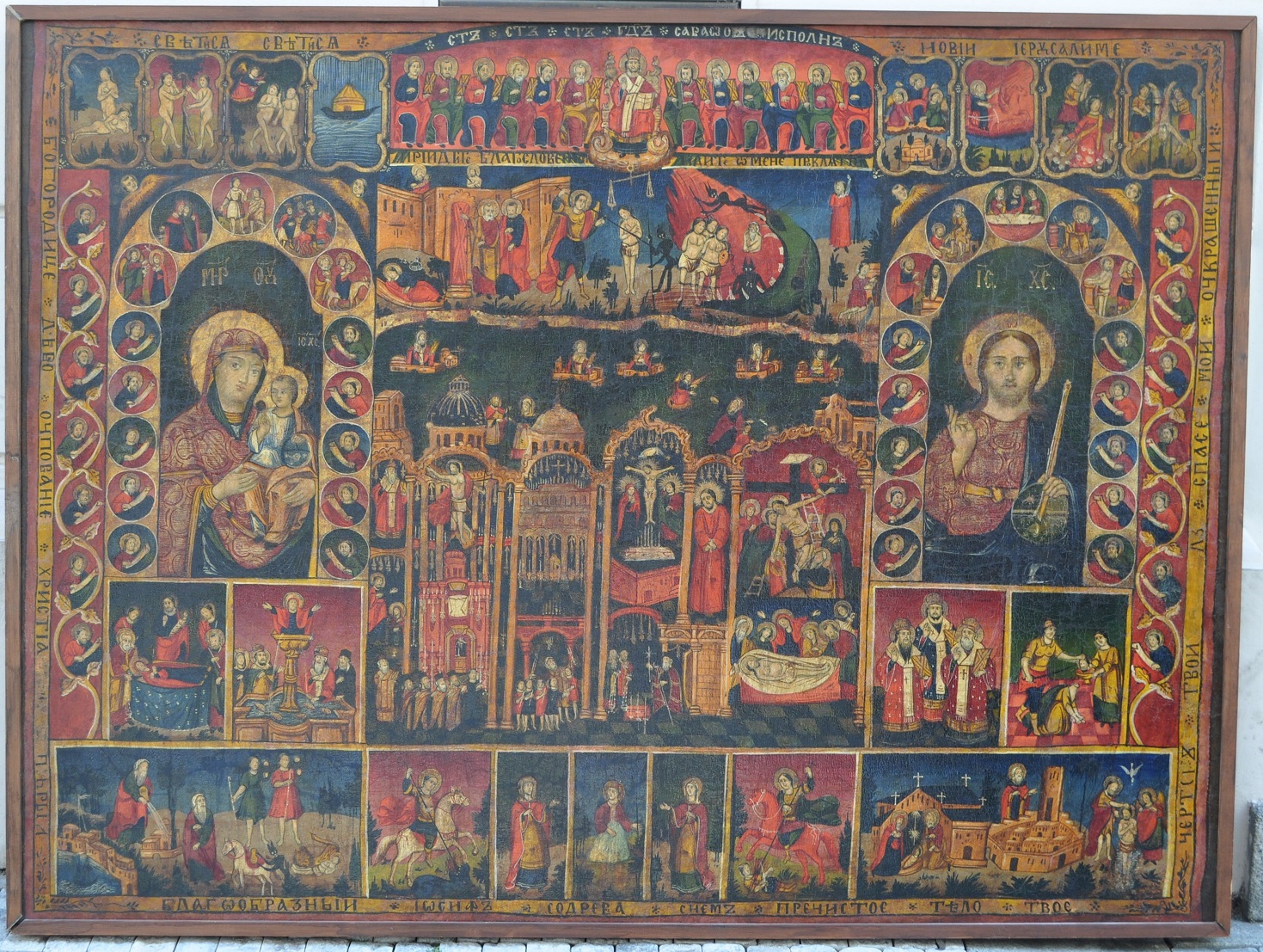 olej na plátně v ikonopisném pojetí, rozdělený jako ikonostas s hlavními postavami Krista Pantokratora (Krista Soudce) a Bohorodičky (Hodégetrie), s apoštoly a proroky a s výjevy ze Starého a především Nového zákona, rozměrné plátno s šířkou 172 cm a výškou 127 cm, oblast Haliče (západní Ukrajina), 1. polovina 19. století; odborně restaurováno; znalecký posudek, osvědčení NPÚ k trvalému vývozu