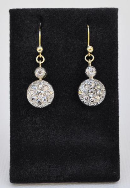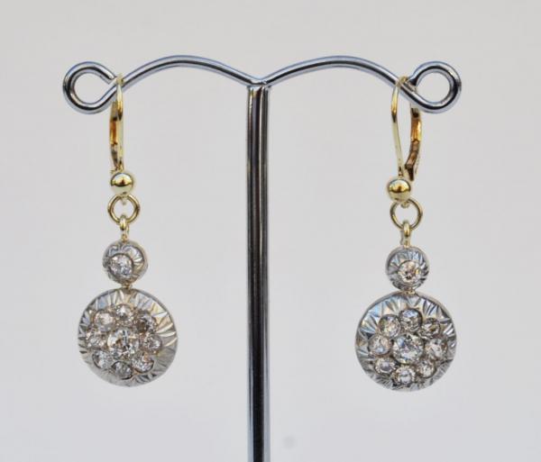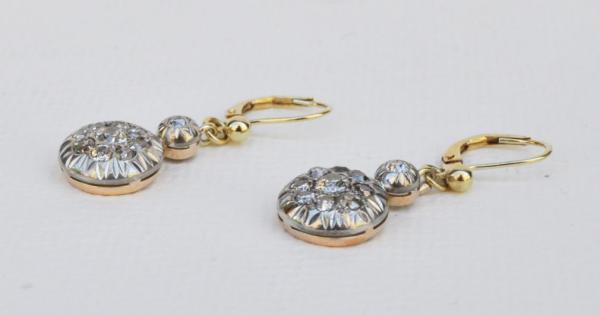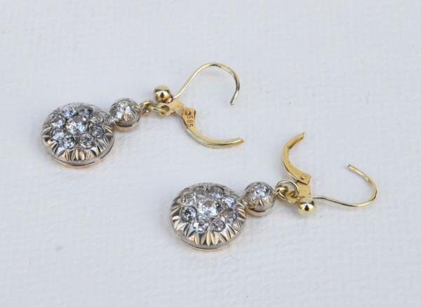 zlaté náušnice s diamanty briliantového brusu, Au btto 4,30g/585/000, diamanty o celkové hmotnosti 1,08 ct, barva F-G, čistota VS-Si, diamanty zasazené do stříbra (Ag 925/000), západní Evropa, pozdější české puncovní značení pro zlato a stříbro, 80. léta 20. století; délka 3,5 cm; přiložen znalecký posudek