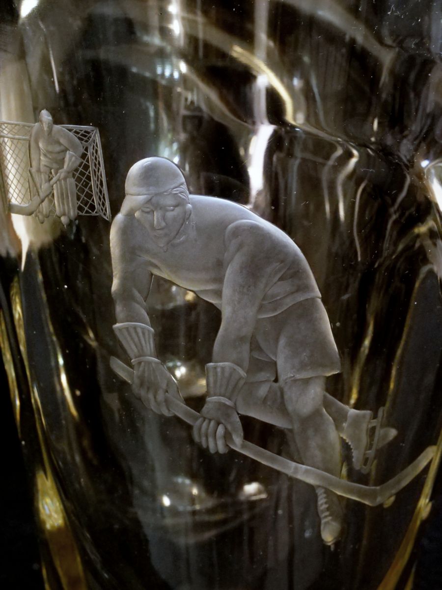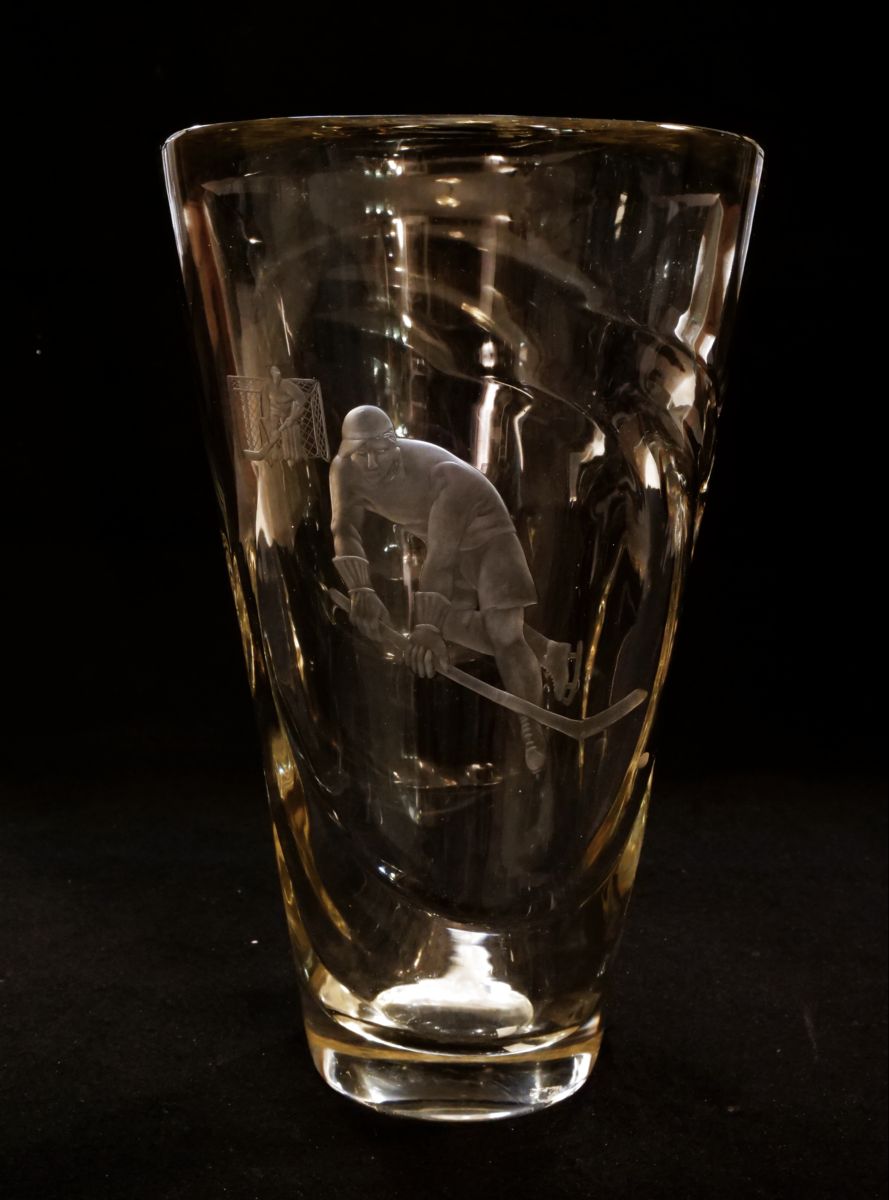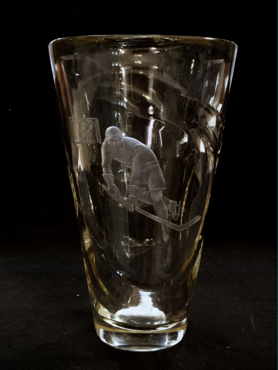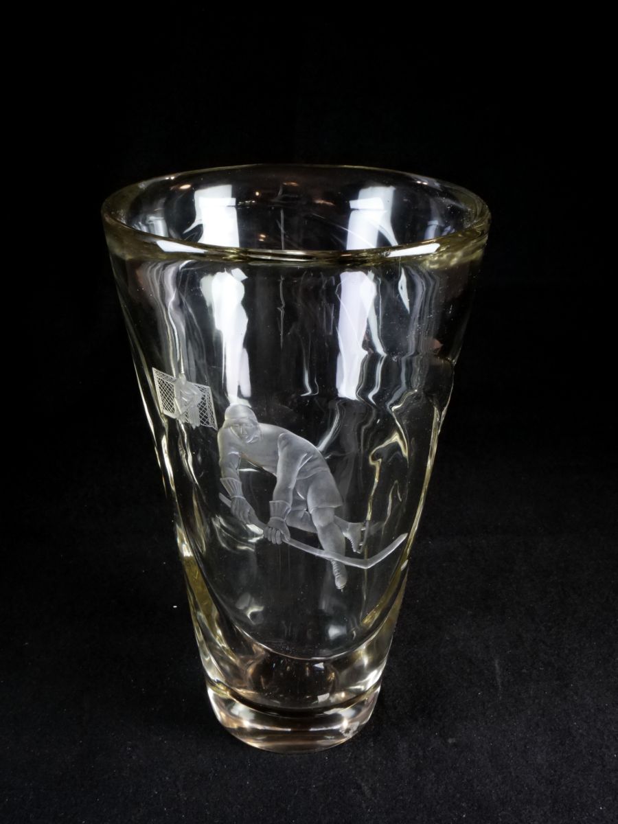 váza z čiré skloviny s řezaným motivem hokejistů, zřejmě sportovní trofej, Československo, kolem roku 1948; výška 29 cm, průměr 17,8 cm; sběratelsky zajímavé