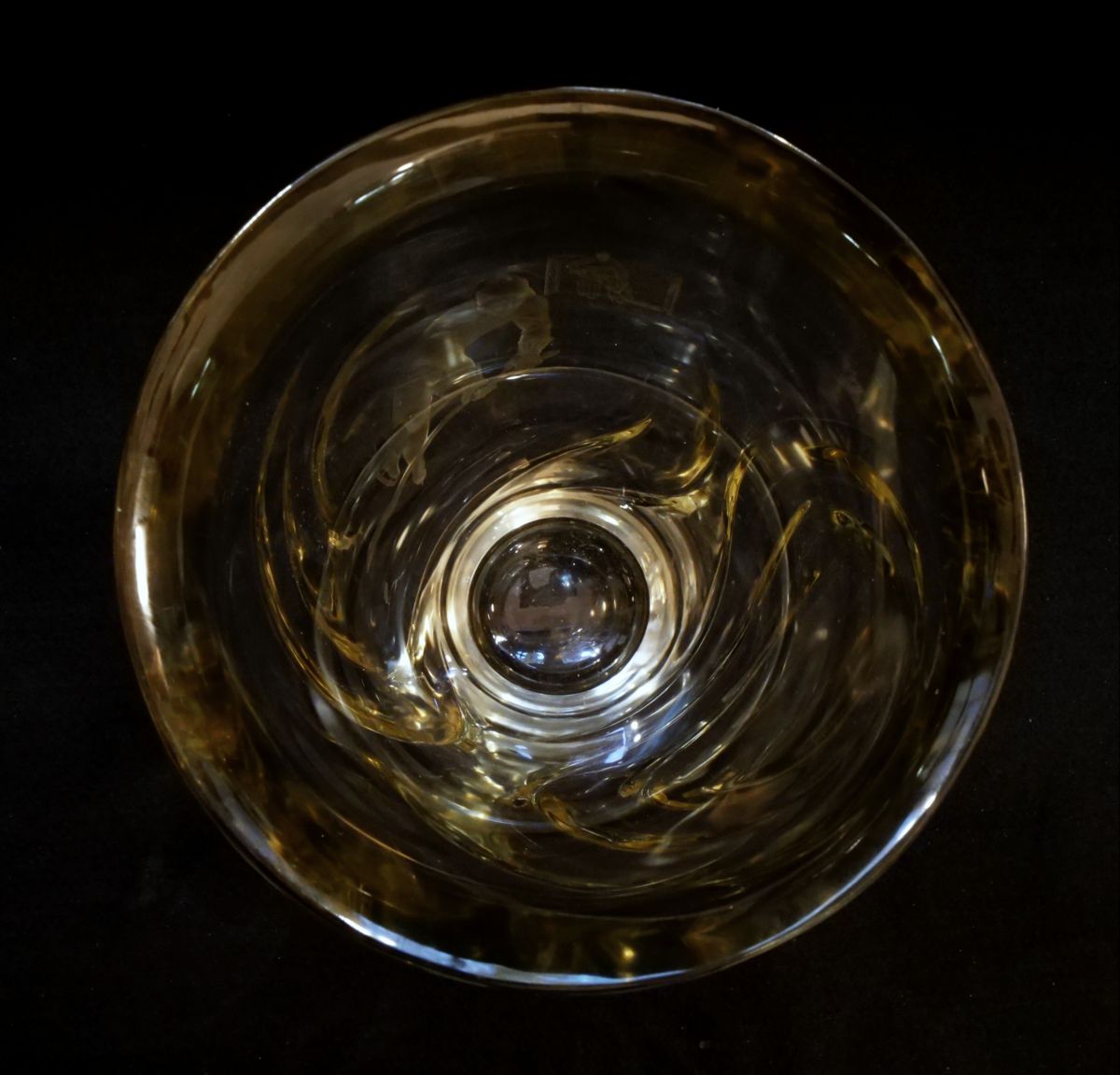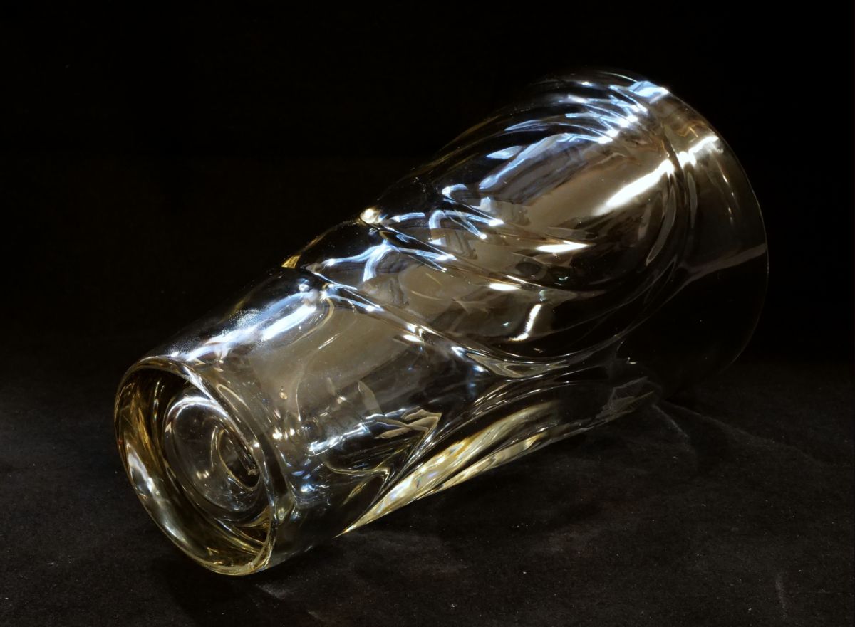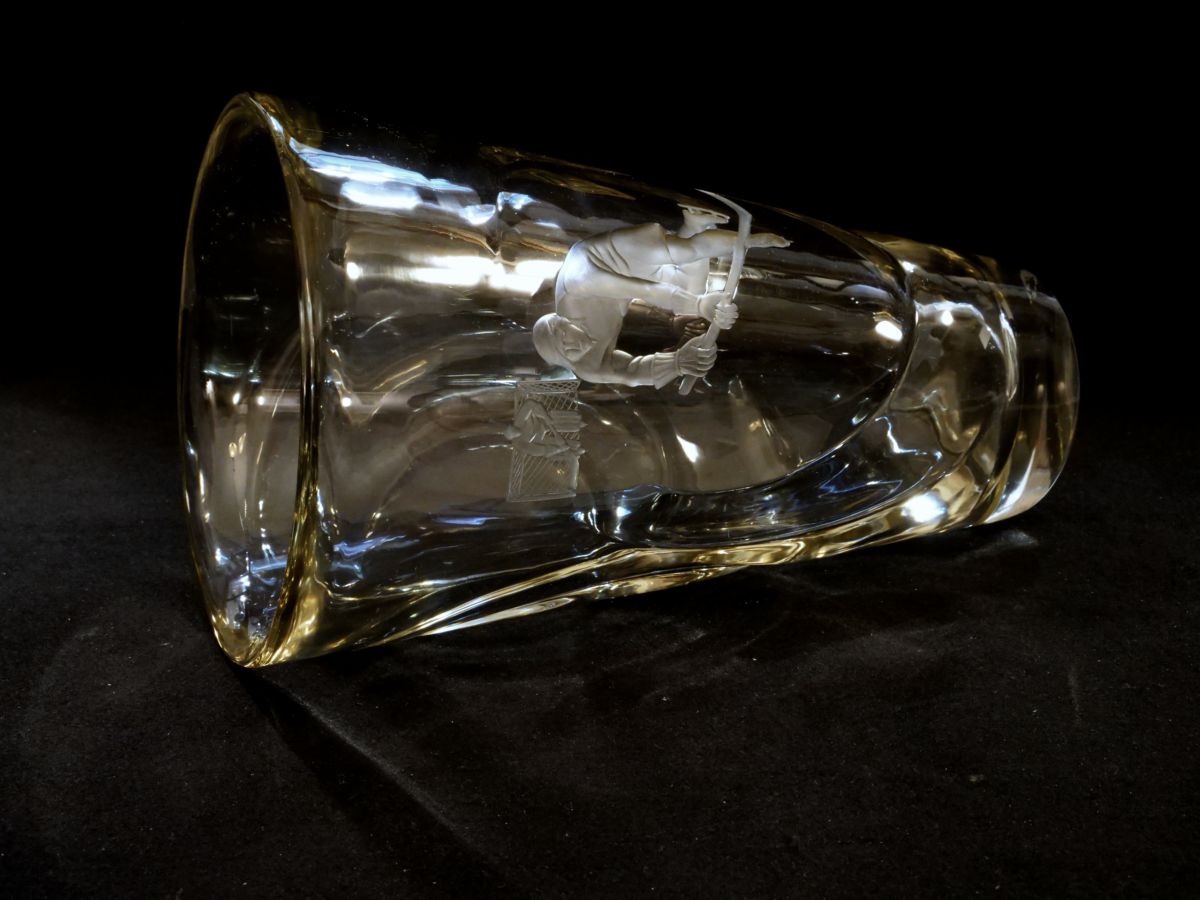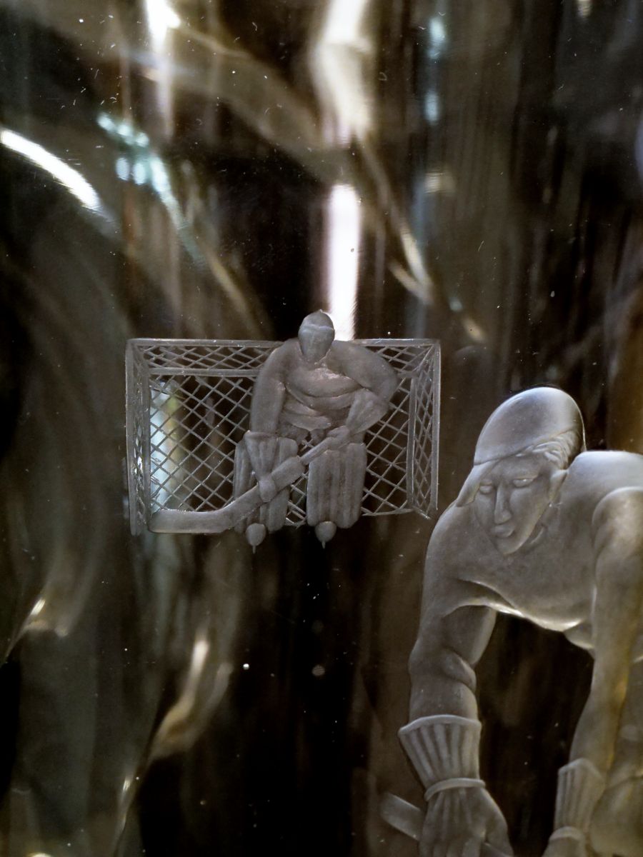 váza z čiré skloviny s řezaným motivem hokejistů, zřejmě sportovní trofej, Československo, kolem roku 1948; výška 29 cm, průměr 17,8 cm; sběratelsky zajímavé