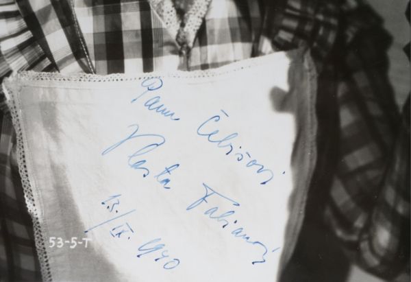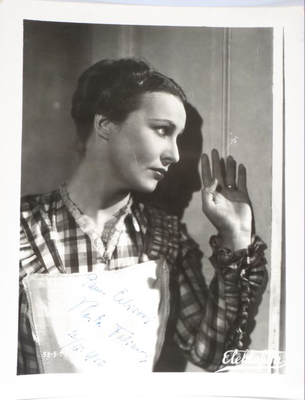 dobová fotografie herečky Vlasty Fabiánové s věnováním, reklamní ateliérová fotografie filmové a produkční společnosti Elektafilm, Protektorát Čechy a Morava, rok 1940, rozměry 30 x 24 cm; sběratelsky zajímavé