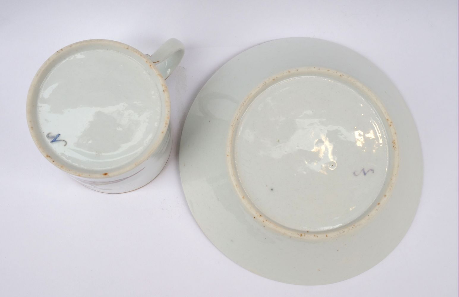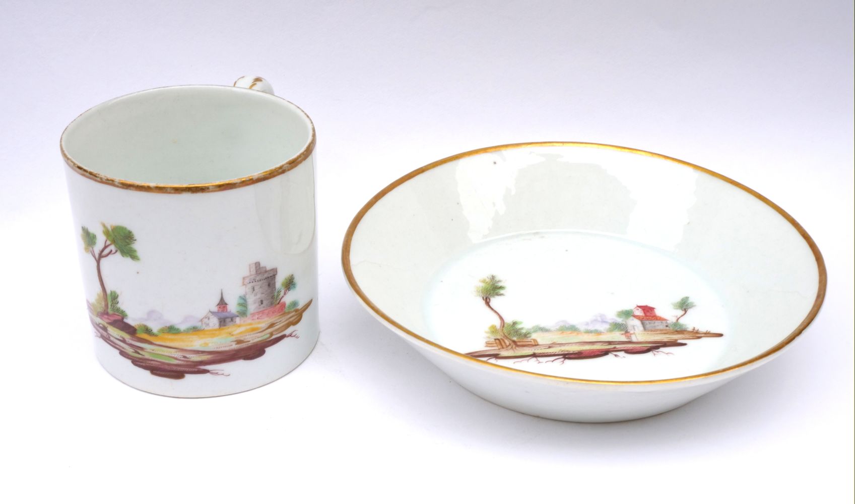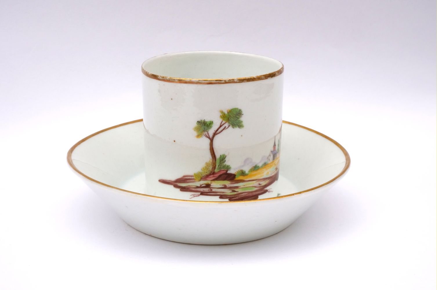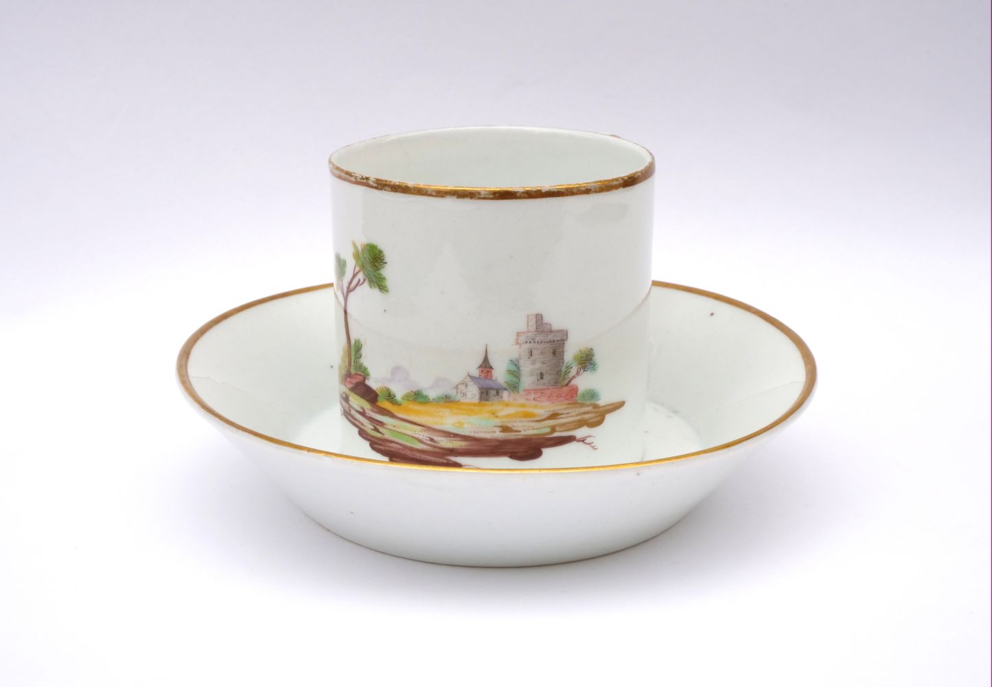 porcelánový šálek s podšálkem, zlacené okraje, malovaný motiv romantické krajiny, francouzská porcelánka Niderviller, kolem roku 1815, značeno; výška 7 cm, průměr podšálku 13 cm