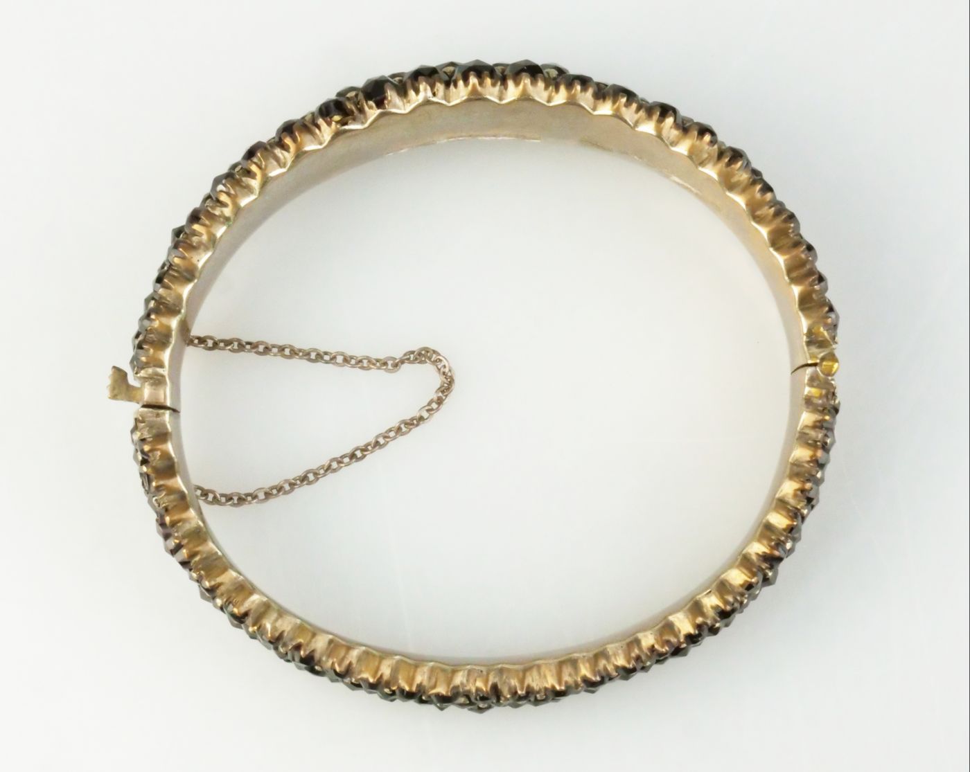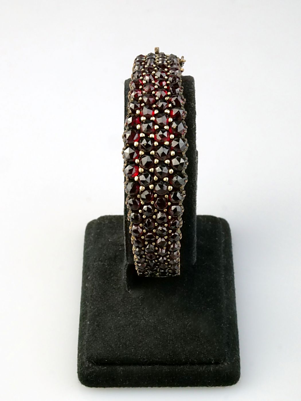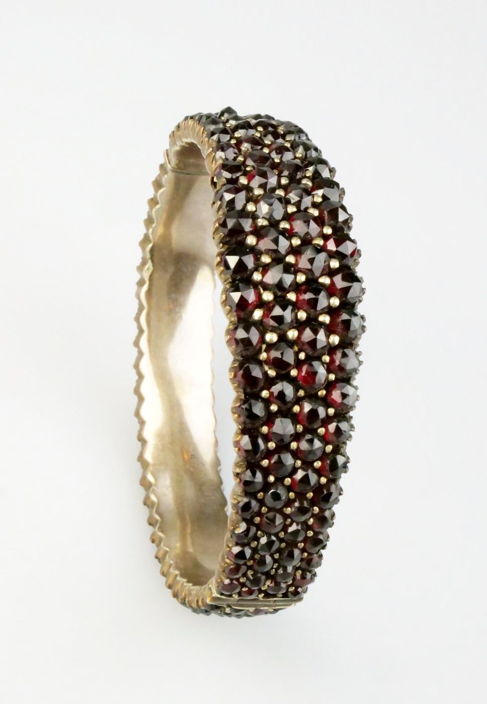kruhový (elipsový) otvírací náramek s českými granáty ve čtyřech rozšiřujících se řadách v duchu pozdní secese, kameny fasované v tombaku, Čechy, kolem roku 1915; pojistný řetízek, hmotnost 29,75g, průměr 5,5 cm, šířka nejširšího místa 1,8 cm