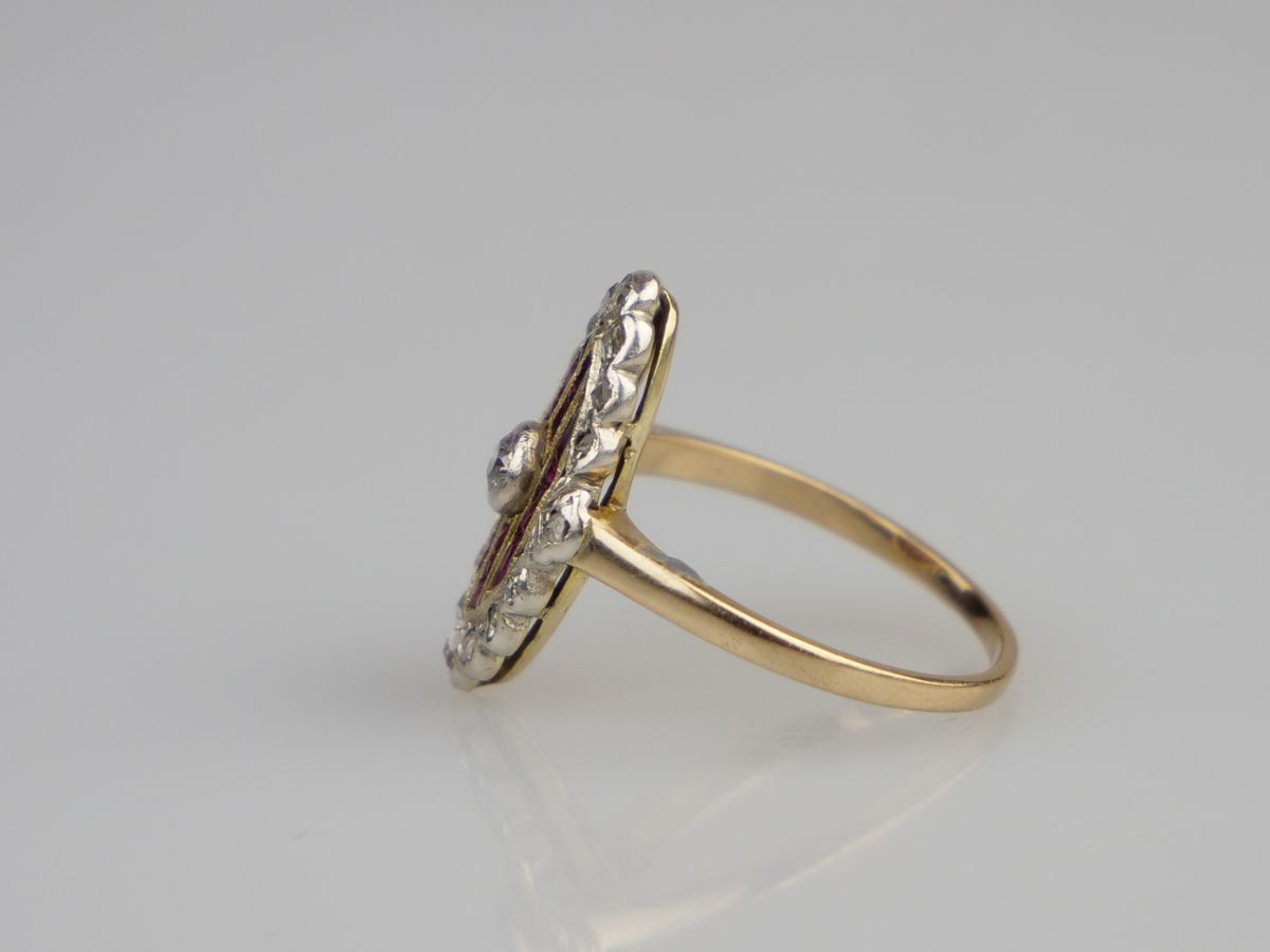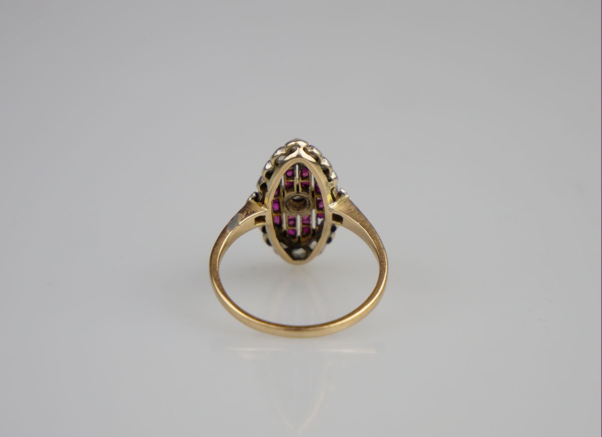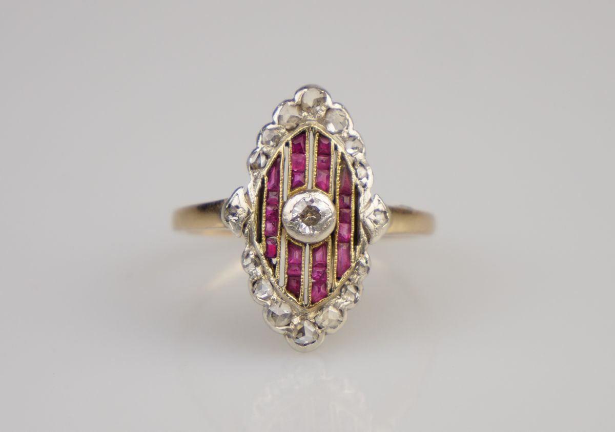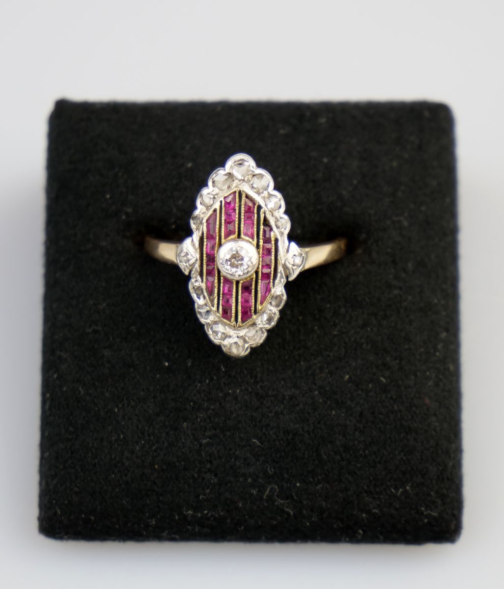 art deco (postsecesní) dámský zlatý prsten s rubíny a diamanty, Au btto 3,20 g/580/1000, kameny vsazené ve stříbře, centrální diamant briliantového brusu o hmotnosti cca 0,075 ct, ostatní diamanty brusu routa; délka hlavy prstenu 2 cm, rakousko-uherský punc se značkou vídeňského Puncovního úřadu (liška - punc platný do r. 1921), Rakousko, kolem r. 1920; drobné poškození rubínku; velikost prstenu 56