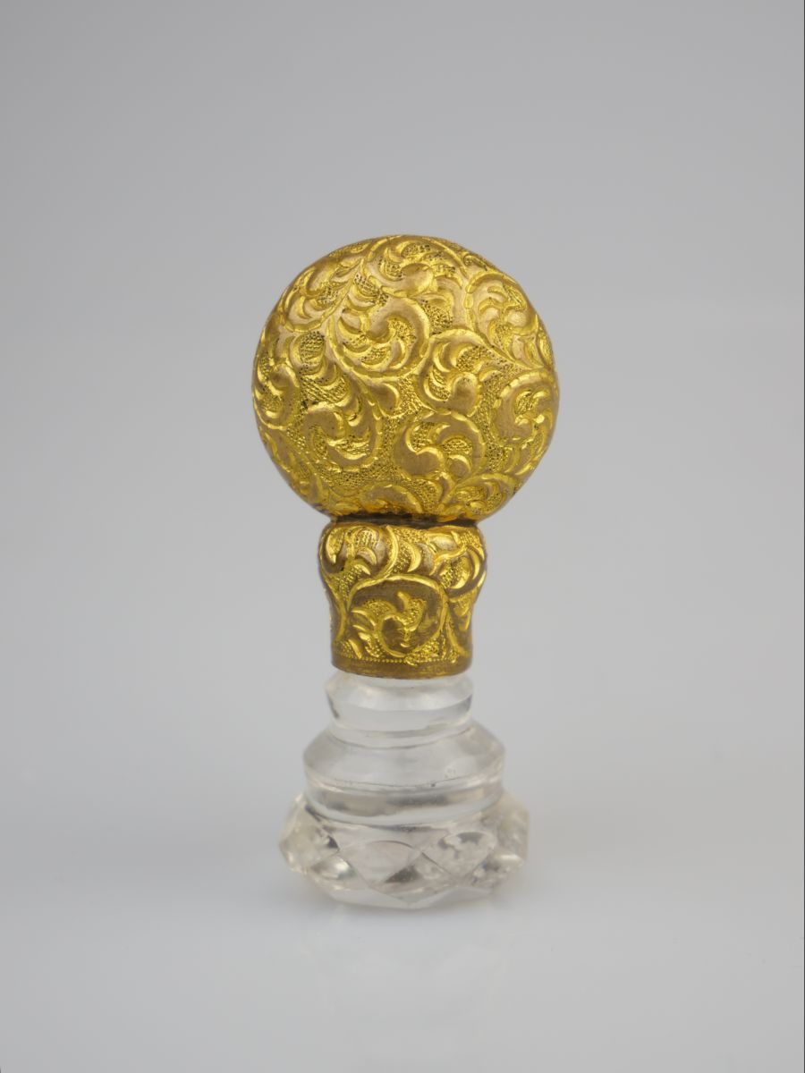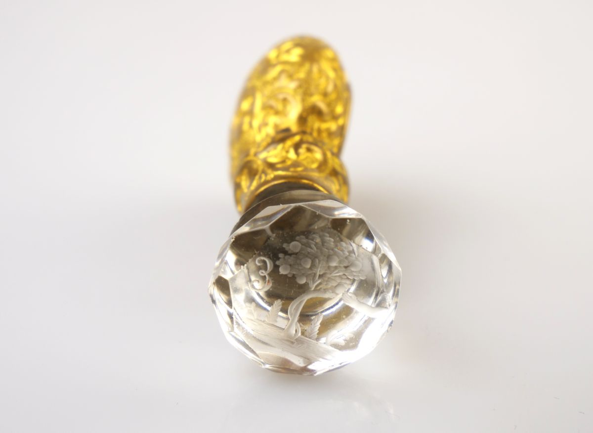 rukojeť ze zlacené mosazi, na porcelánovém medailonku malovaný dívčí portrét, na pečetním typáři z horského křišťálu rytá parafráze biblického motivu, kdy Evina ruka trhá jablko ze zakázaného stromu s hadem pokušitelem; střední Evropa, kolem r. 1860, výška 6,5 cm; sběratelsky zajímavé