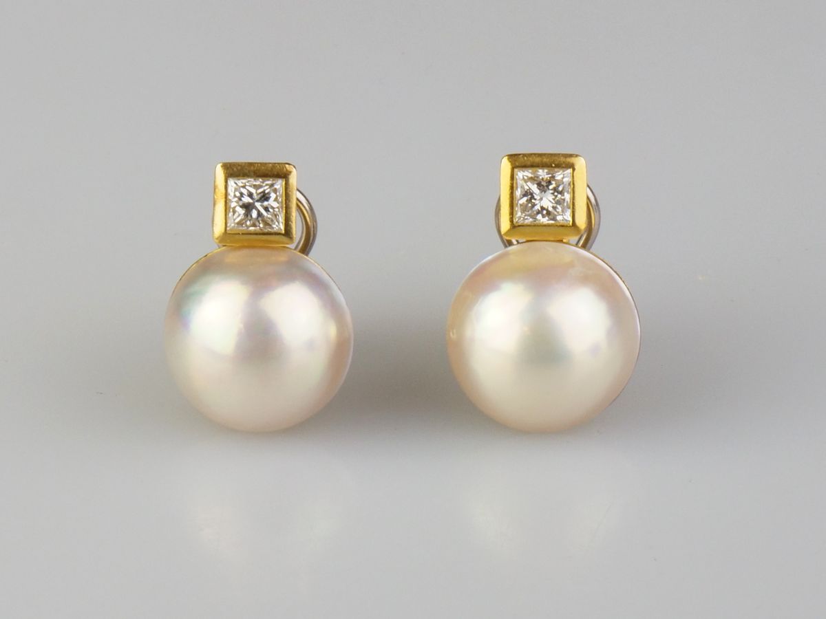 zlaté náušnice s kultivovanými perlami a diamanty, Au btto 12,29 g/750/1000, dva diamanty brusu princess o celkové hmotnosti asi 0,97 ct, barva J-K, čistota VS1, dvě kulaté půlperly velmi dobré kvality, západní Evropa, kolem r. 1990; atest Puncovního úřadu, znalecký posudek; rozměry 20,5 x 14 x 19 mm