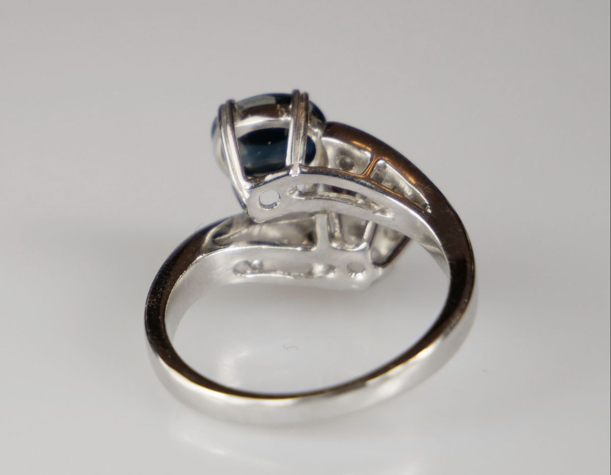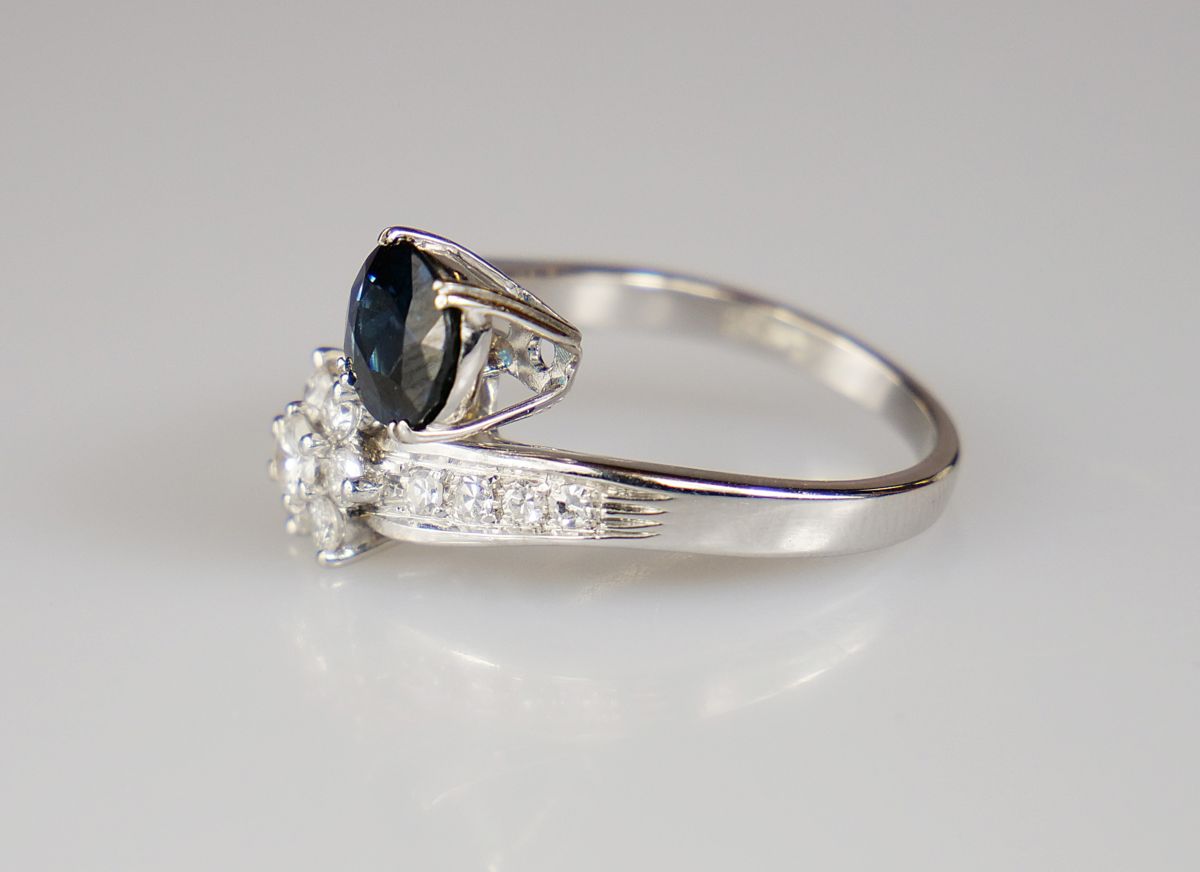 zlatý prsten s diamanty a s přírodním modrozeleným safírem, safír o hmotnosti cca 1,2 ct, diamanty briliantového brusu o celkové hmotnosti cca 0,35 ct, Au 5,72g/750/1000, západní Evropa, kolem r. 1995, pozdější český punc; velikost prstenu 53
