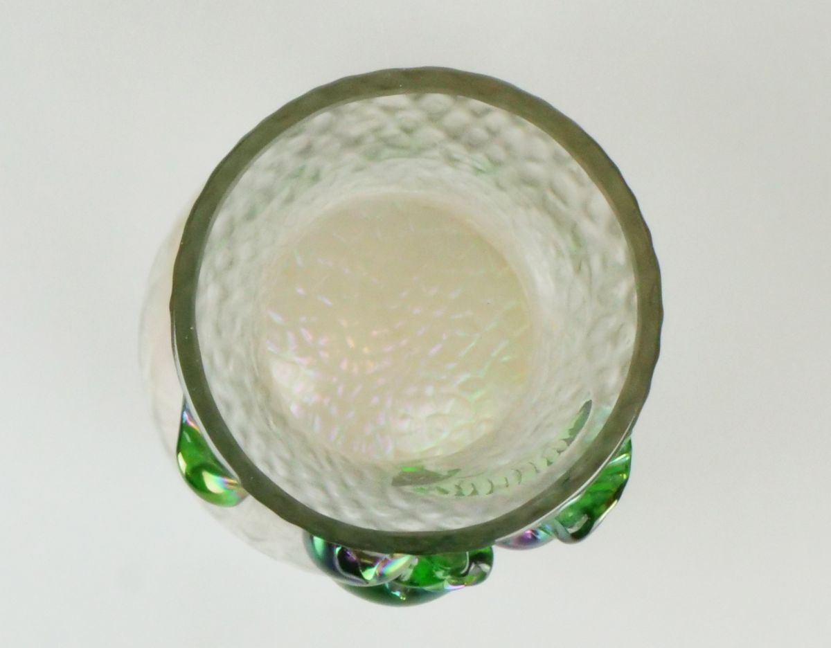 secesní váza v dekoru martelé, sytě barevné irisované florální nálepy s bobulemi švestkovitého tvaru, šumavská sklárna Lenora - Wilhelm Kralik, Rakousko-Uhersko, Čechy, kolem r. 1910; výška 25 cm, průměr 10 cm