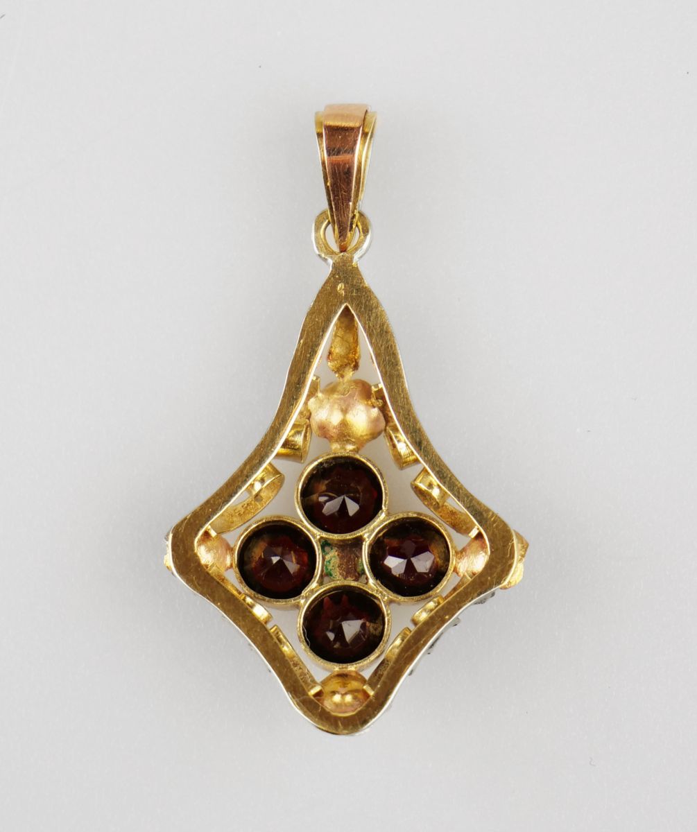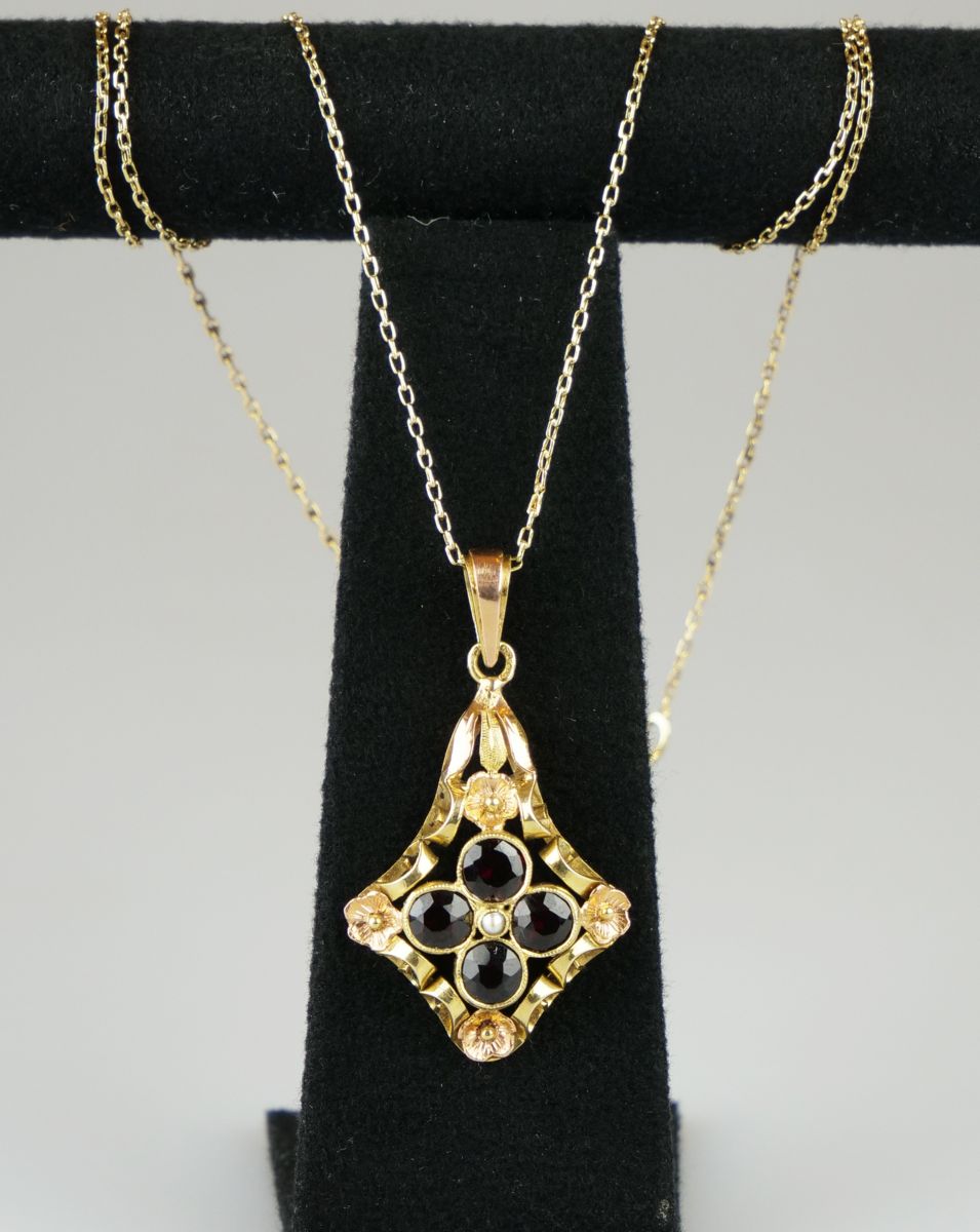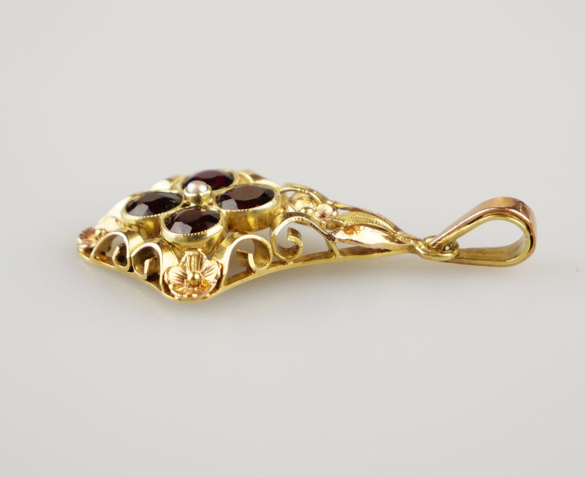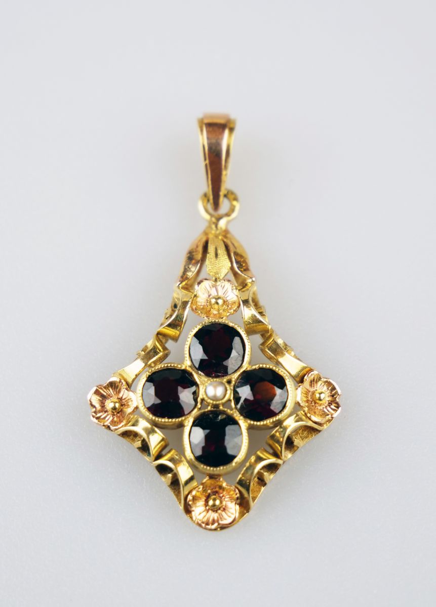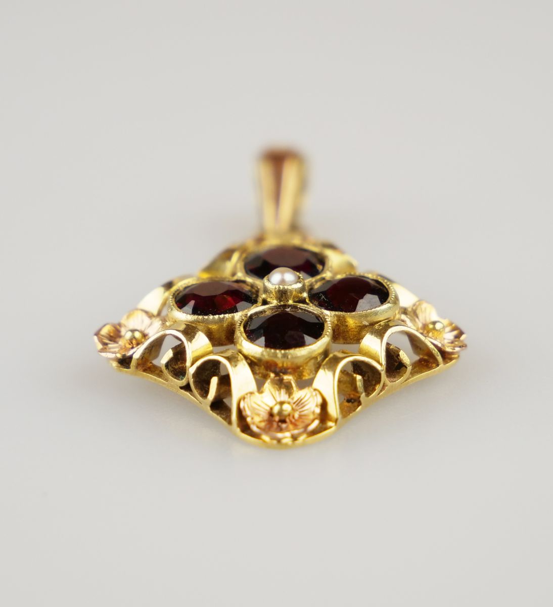 zlatý přívěsek se čtyřmi českými granáty (pyropy) a říční perličkou, Au btto 3,15 g/585/1000, Československo, kolem r. 1935, dobový punc (lvíček); rozměr 3,7 x 2,1 cm