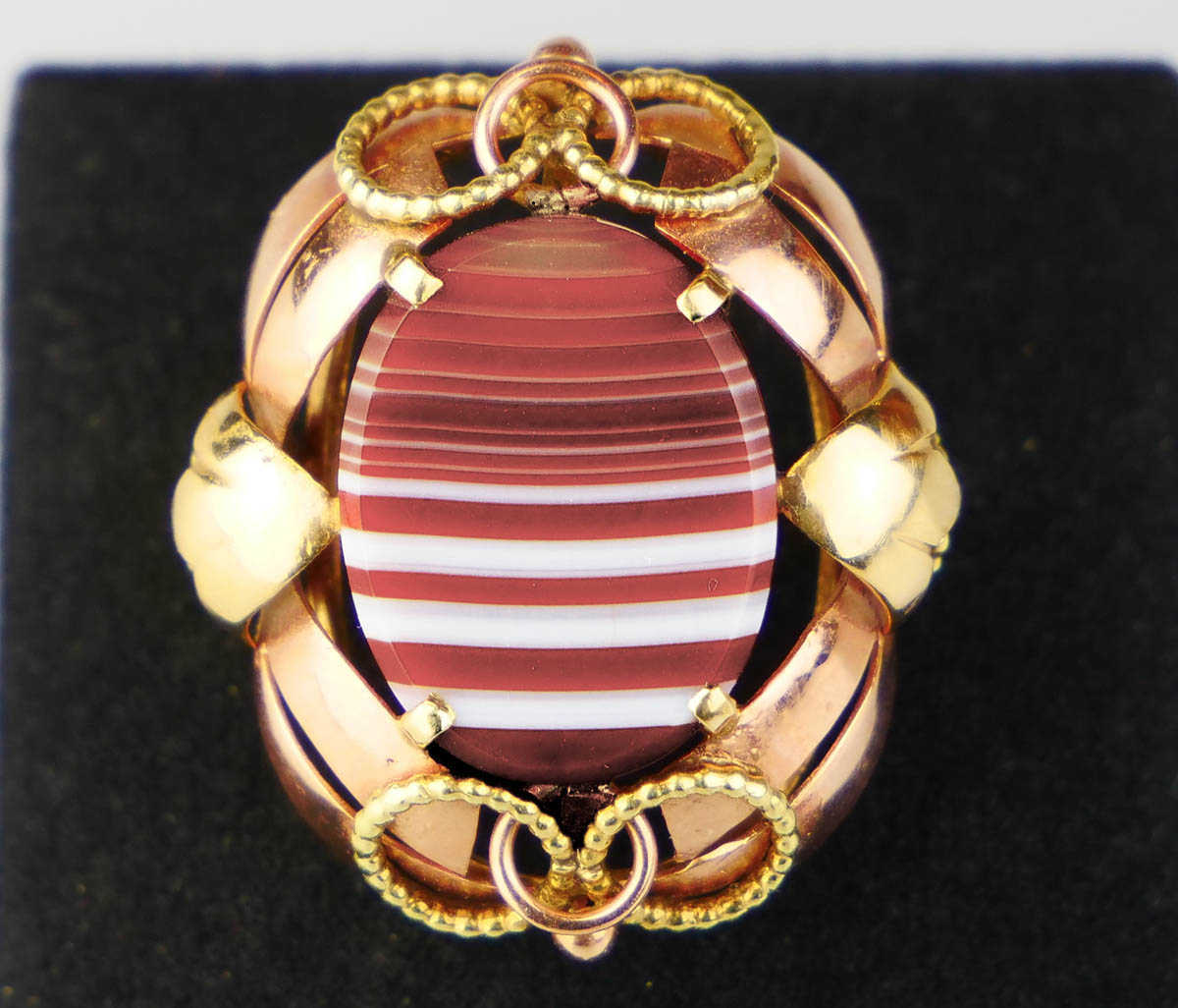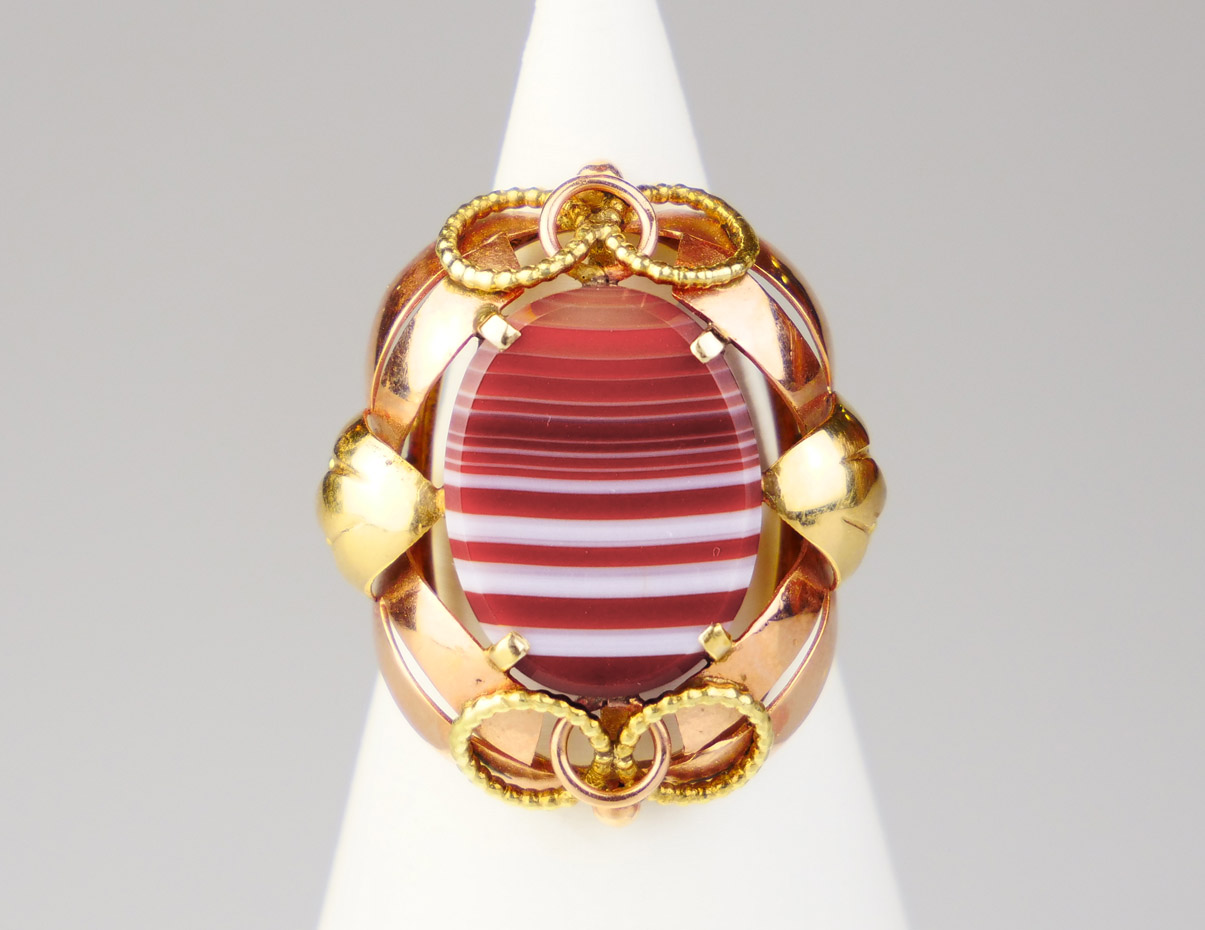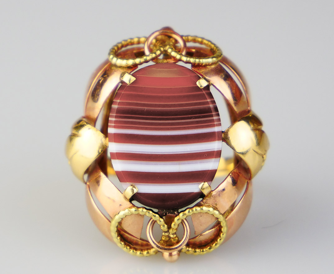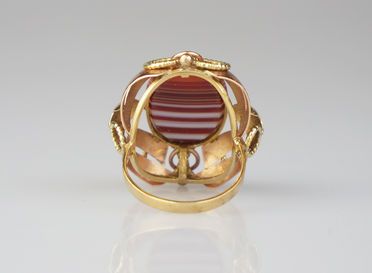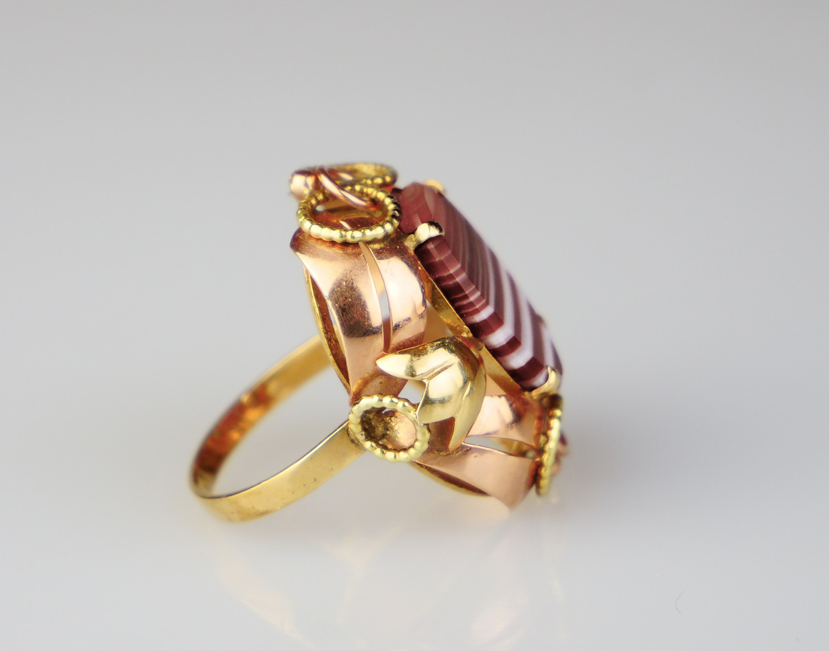 prsten ze žlutého a růžového zlata s přírodním achátem, Au 7,35 g/585/1000, Rakousko, kolem r. 1960, dobový rakouský punc, rozměr hlavy 2,6 x 3 cm, velikost prstenu 58,5; atest Puncovního úřadu
