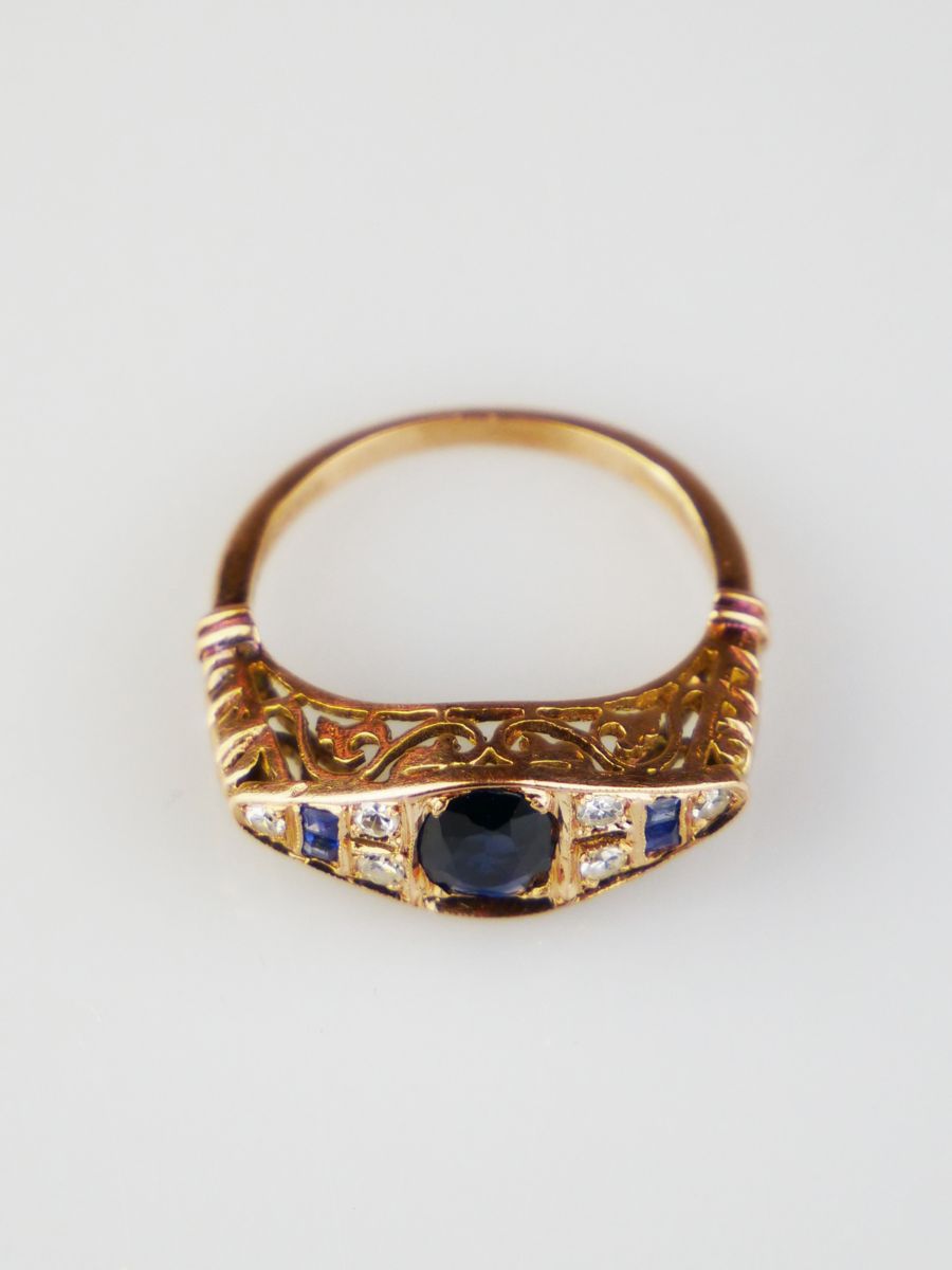 zlatý prsten s přírodními safíry a diamanty jednoduchého briliantového brusu o hmotnosti cca 0,12 ct, Au btto 2,81 g/500/1000, hlava prstenu lodičkového tvaru ozdobně prořezávaná, západní Evropa, kolem r 1935, atest Puncovního úřadu; rozměr hlavy 2 x 0,9 cm, velikost prstenu 53,5
