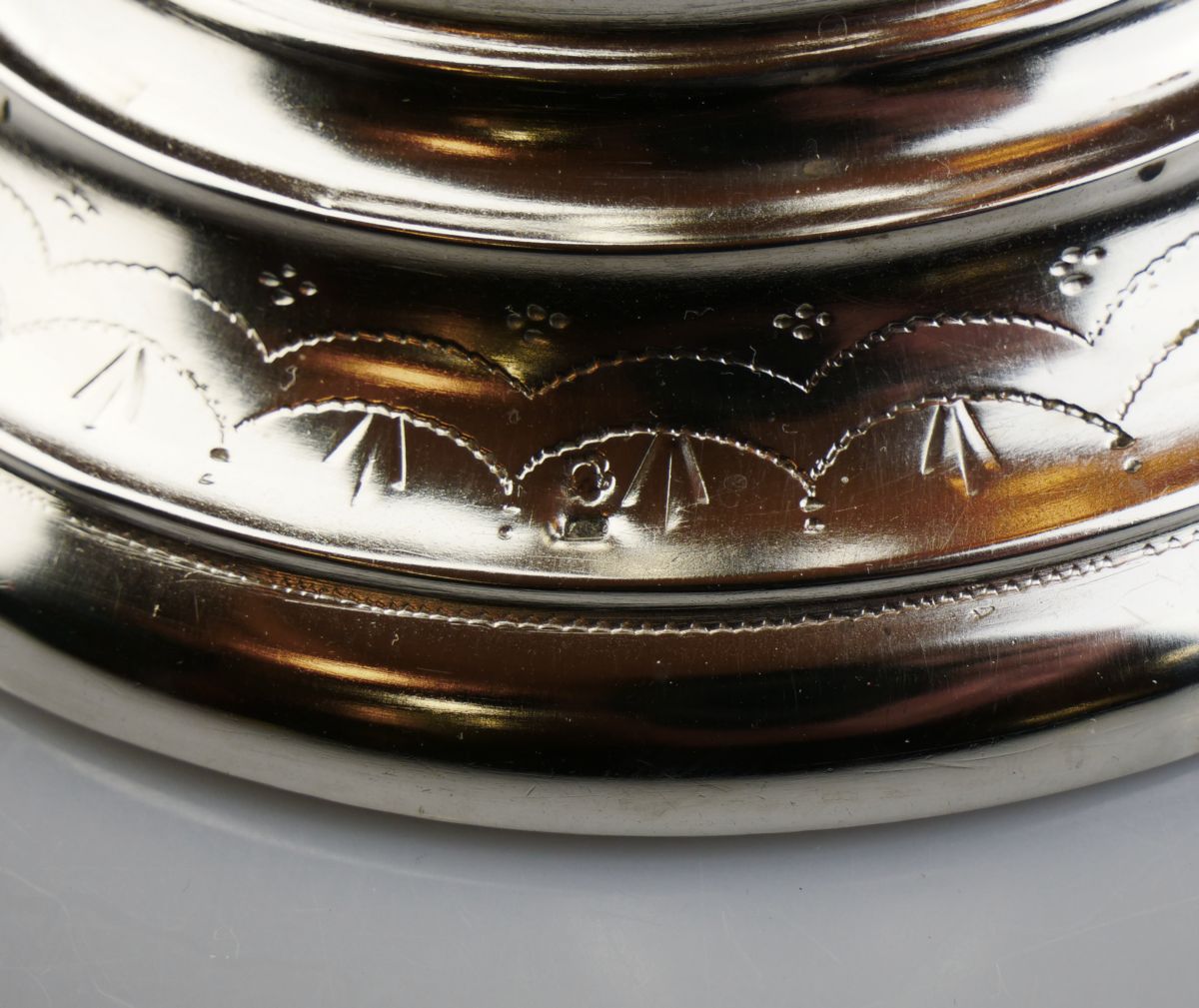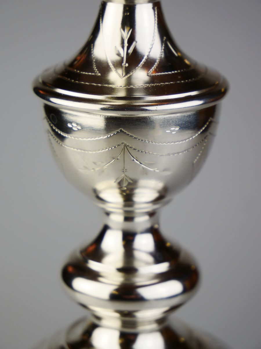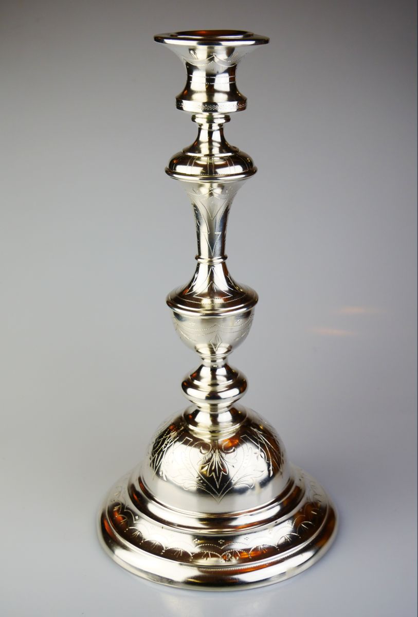 stříbrný svícen z období historismu, zdobený gravírováním, Ag 258 g/800/1000. Rakousko-Uhersko, kolem r. 1890, dobový punc (Diana) se značkou vídeňského Puncovního úřadu; výška 29 cm, průměr 15 cm