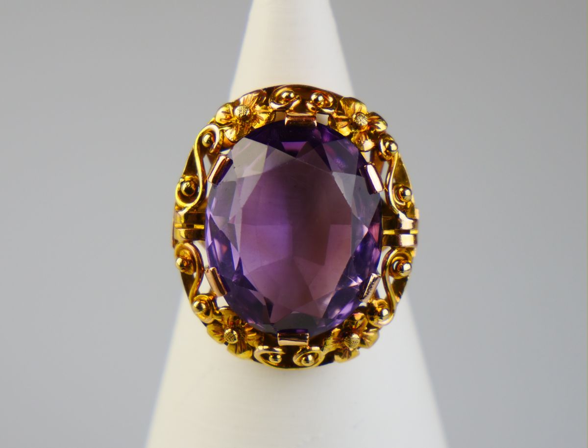 zlatý prsten s velkým ametystem, Au 10,41 g/585/1000, Československo, kolem r. 1935, dobová puncovní značka (lvíček), velikost hlavy 2,5 x 2,2 cm; velikost prstenu 56