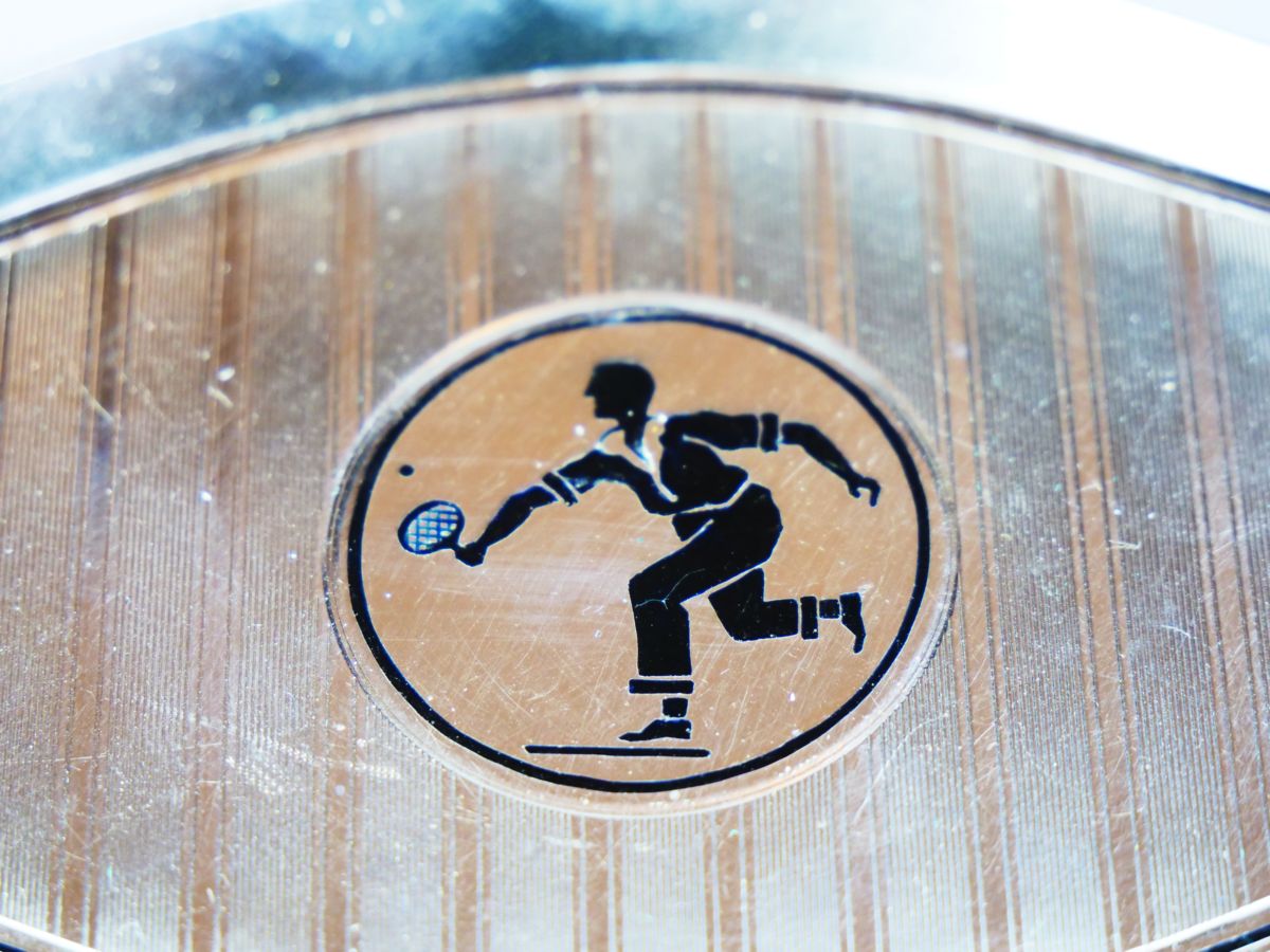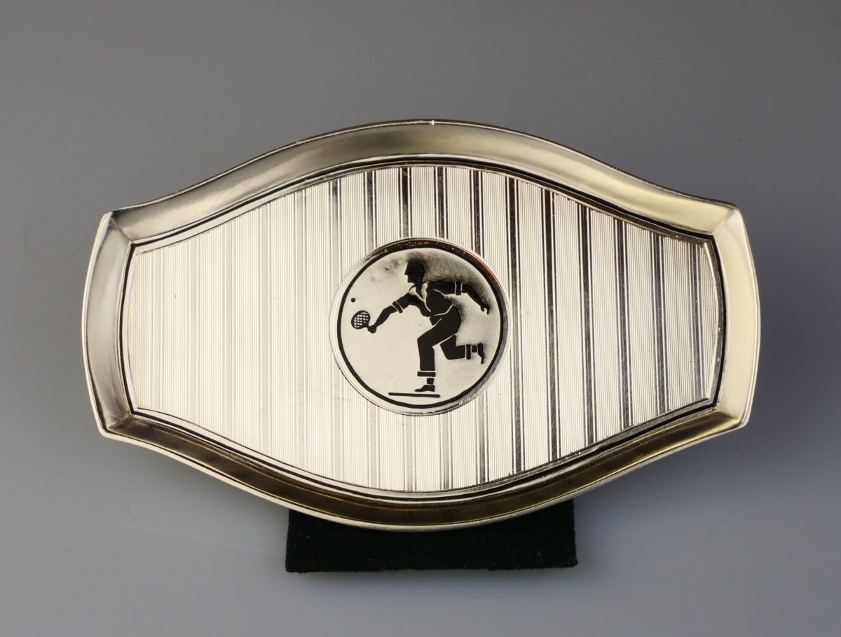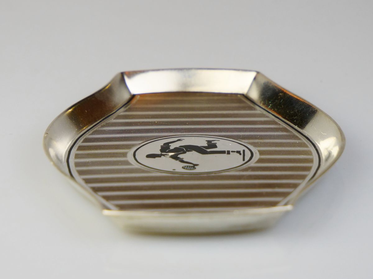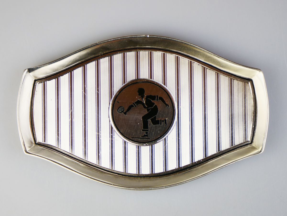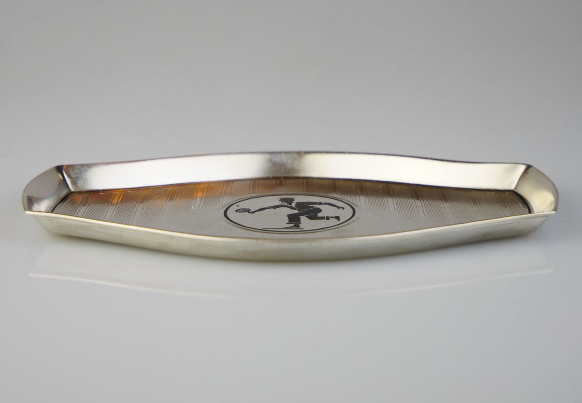 drobný art deco stříbrný tácek se siluetou tenisty v černém smaltu, zdobený gilošováním, Ag 52,20 g/935/1000, západní Evropa, kolem r. 1925; atest Puncovního úřadu; rozměr 11,5 x 7 cm