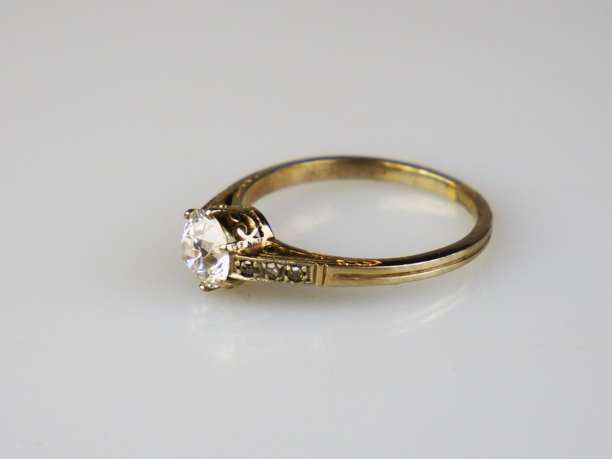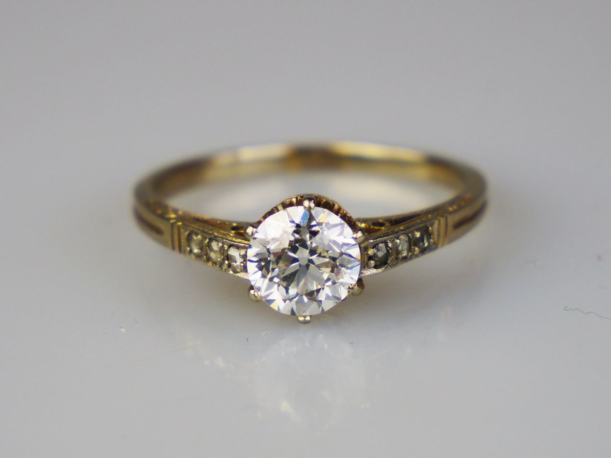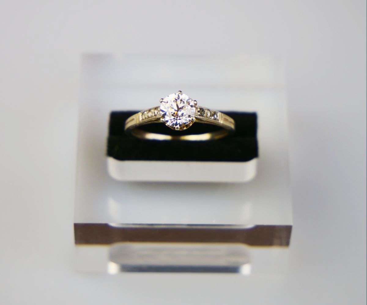 art deco prsten z bílého zlata s diamanty, centrální diamant starého briliantového brusu o hmotnosti 0,97 ct, čistota VS1, výjimečně bílá až vzácně bílá barva E-F (!), dále je na prstenu 6 ks diamantových rout, celkem je na prstenu cca 1,02 ct diamantů, Au 2,40 g/585/1000, střední Evropa, kolem r. 1925; atest Puncovního úřadu, znalecký posudek; velikost prstenu 56; kvalitní pěkný šperk