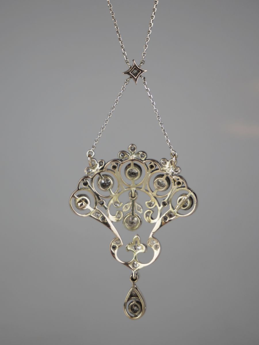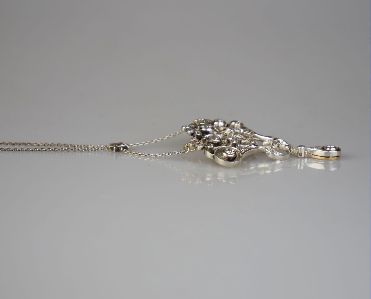 zlatý secesní koliér se stříbrným řetízkem, na koliéru je celkem cca 1,42 ct diamantů starého briliantového brusu, kameny vsazené ve stříbře, Au+Ag 13,40 g/580+925/1000, západní Evropa, kolem r. 1900, dobový dovozový rakousko-uherský punc se značkou budapešťského Puncovního úřadu; rozměr závěsu 5,1 x 3,9 cm, délka řetízku 48 cm