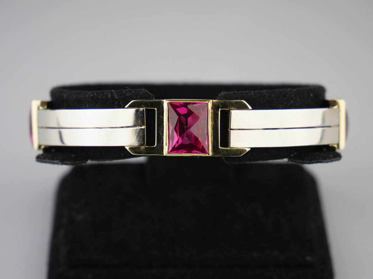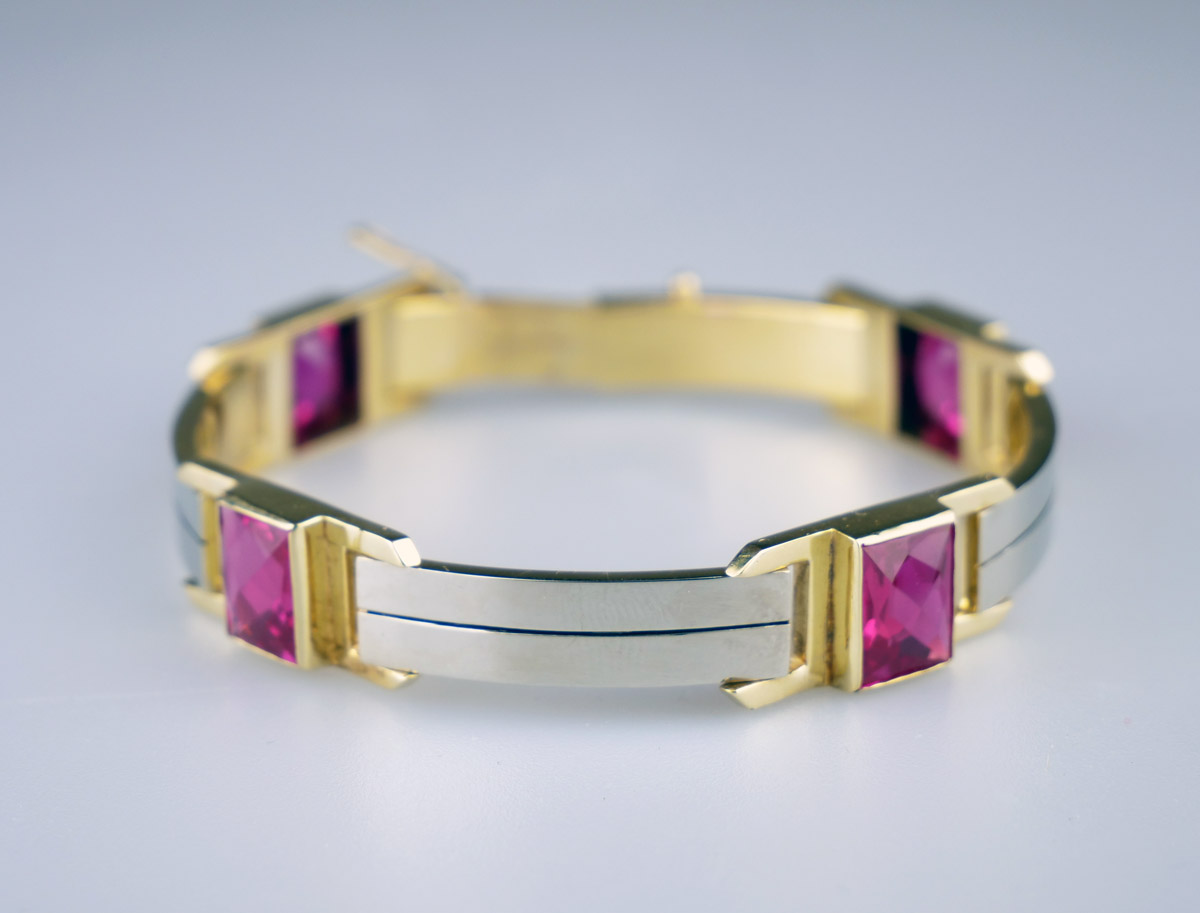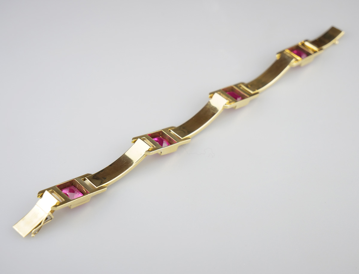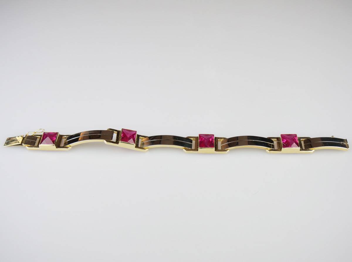 art deco článkový zlatý náramek se syntetickými rubíny kosočtverečně oboustranně broušenými, žluté a bílé zlato, Au btto 22,04 g/585/1000, Československo, kolem r. 1935, dobová puncovní značka (lvíček); délka náramku 20 cm, šířka 1,1 cm