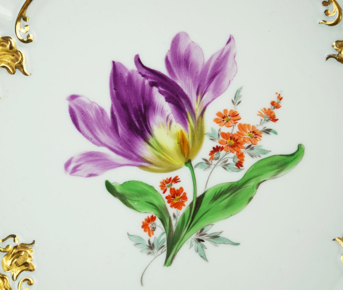 velký závěsný porcelánový talíř pro slavnostní účely, ve stylu druhého rokoka, resp. míšeňského historismu, zřejmě podle původního návrhu Ernsta Augusta Leuteritze, ručně malovaný květinový motiv s výrazným zlacením reliéfních ozdob a rokajových kartuší, německá porcelánka Meissen, kolem r. 1940; průměr 29 cm