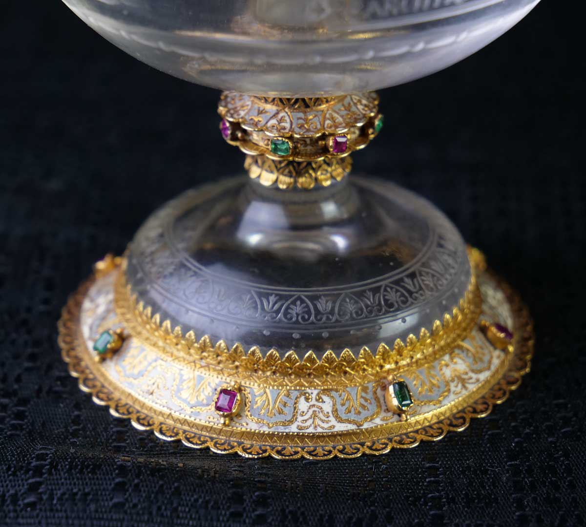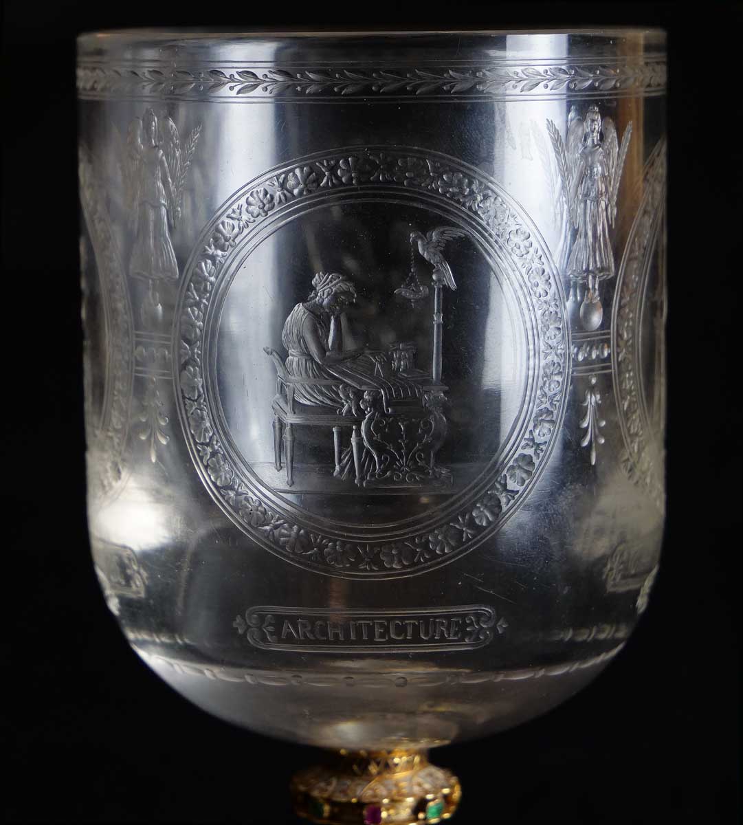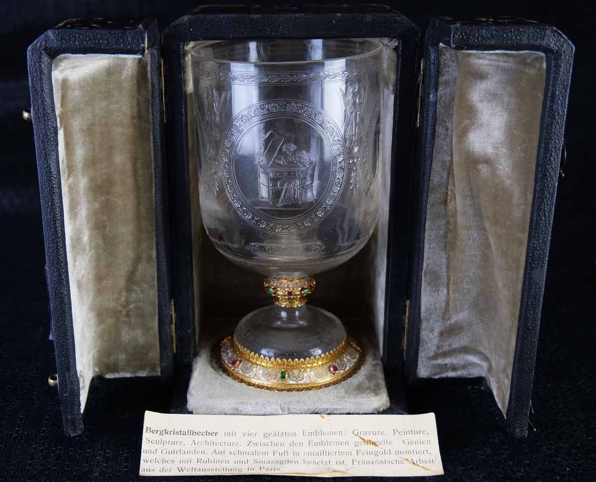 mimořádný reprezentativní pohár muzeální hodnoty z poloviny 19. století, Au btto 313,60g/750/000, kupa a patka z velkého dokonale čirého krystalu horského křišťálu, zlatý dřík a široké lemování patky jsou zdobené barevnými smalty, kolumbijskými smaragdy a barmskými přírodními rubíny z významných nalezišť v Mogoku, kupa je mimo jiné zdobená mistrovskými glyptikami znázorňujícími alegorie uměleckých směrů - sochařství, malířství, rytectví, a architektury (s francouzskými názvy SCUPLTURE, PEINTURE, GRAVURE, ARCHITECTURE), zlatnická práce může pocházet z vídeňské dílny Jakoba Wasserbergera, zpracování horského křišťálu spadá zřejmě pod dílnu významného vídeňského glyptika Hermanna Ratzensdorfera; pohár byl vystavený na světové výstavě v Paříži v roce 1855; originální etuje se značkou vídeňského výrobce dva znalecké posudky, atest Puncovního úřadu; rozměr 13,5 x 7,8 cm; etuje