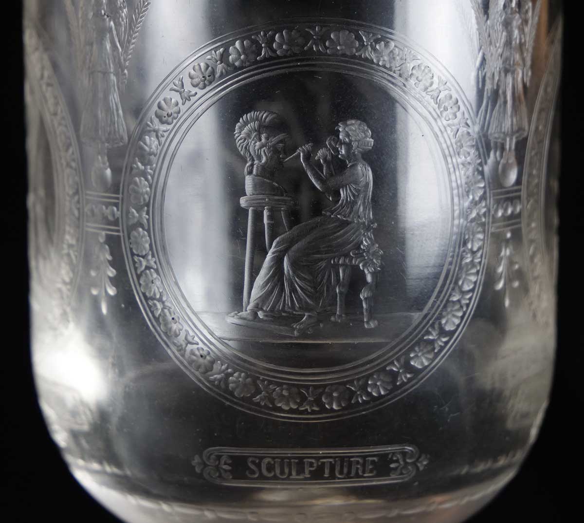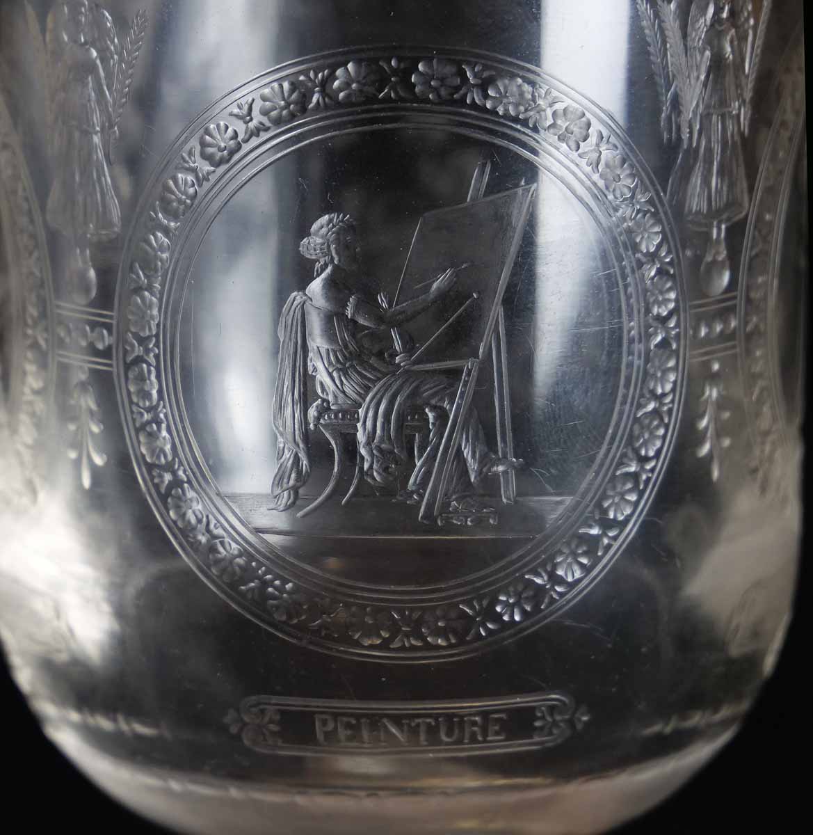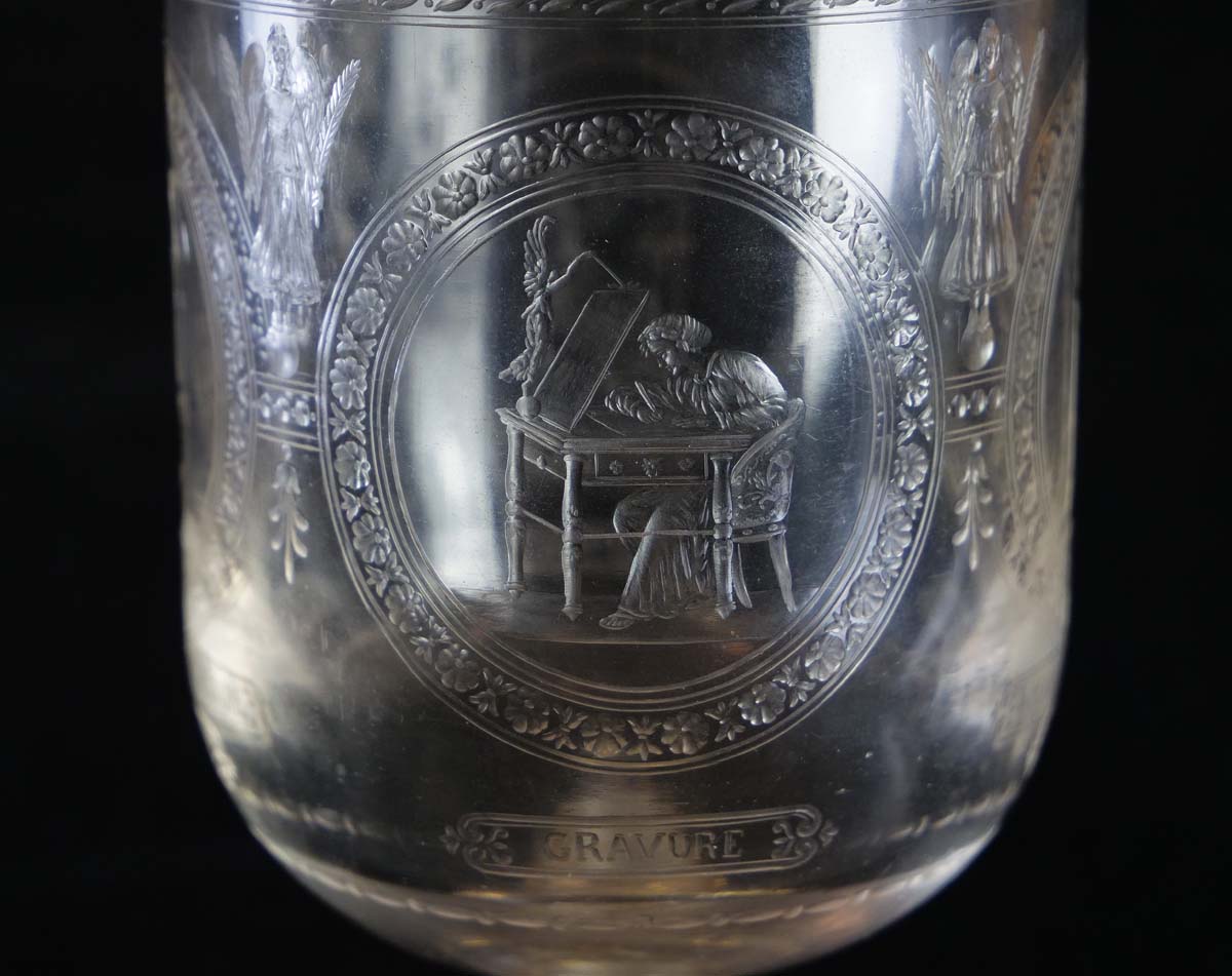 mimořádný reprezentativní pohár muzeální hodnoty z poloviny 19. století, Au btto 313,60g/750/000, kupa a patka z velkého dokonale čirého krystalu horského křišťálu, zlatý dřík a široké lemování patky jsou zdobené barevnými smalty, kolumbijskými smaragdy a barmskými přírodními rubíny z významných nalezišť v Mogoku, kupa je mimo jiné zdobená mistrovskými glyptikami znázorňujícími alegorie uměleckých směrů - sochařství, malířství, rytectví, a architektury (s francouzskými názvy SCUPLTURE, PEINTURE, GRAVURE, ARCHITECTURE), zlatnická práce může pocházet z vídeňské dílny Jakoba Wasserbergera, zpracování horského křišťálu spadá zřejmě pod dílnu významného vídeňského glyptika Hermanna Ratzensdorfera; pohár byl vystavený na světové výstavě v Paříži v roce 1855; originální etuje se značkou vídeňského výrobce dva znalecké posudky, atest Puncovního úřadu; rozměr 13,5 x 7,8 cm; etuje