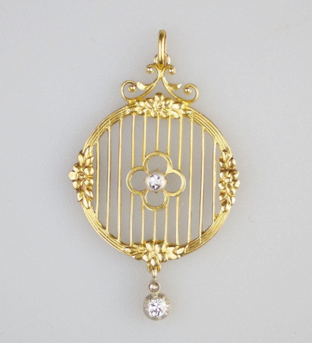 zlatý secesní přívěsek se 2 diamanty starého briliantového brusu o hmotnosti cca 0,15 ct a s 1 diamantovou routou, Au 3,35 g/580/1000, střední Evropa, kolem r. 1910; atest Puncovního úřadu, rozměr 4,8 x 2,8 cm
