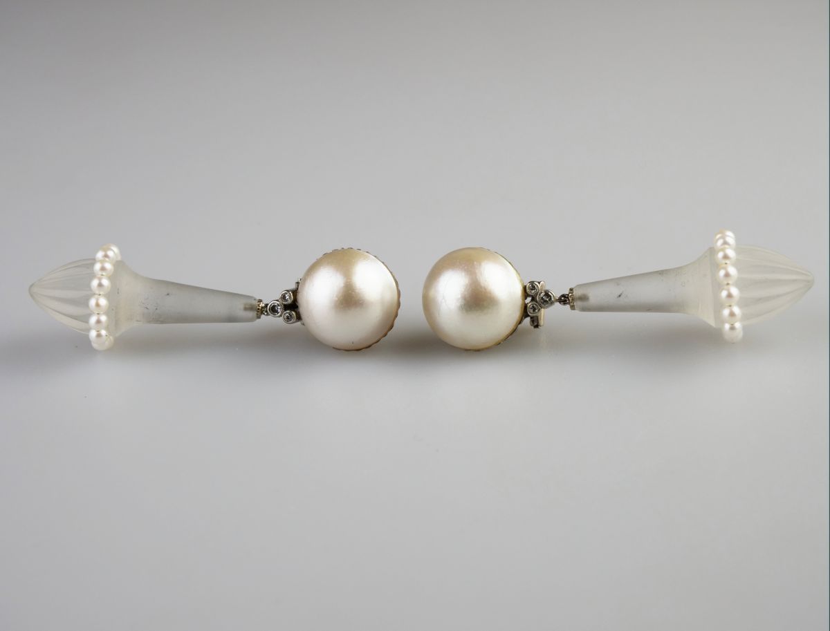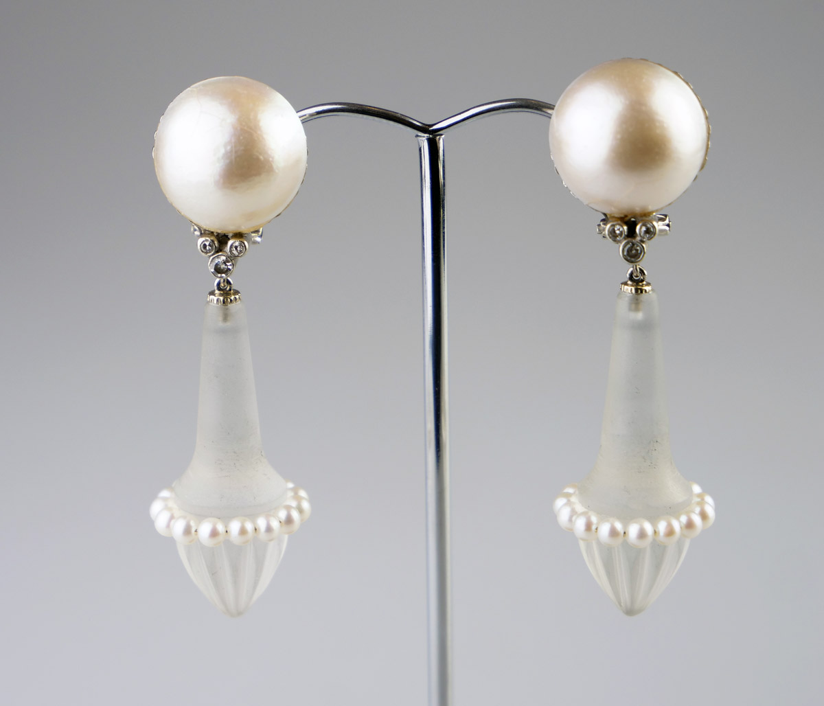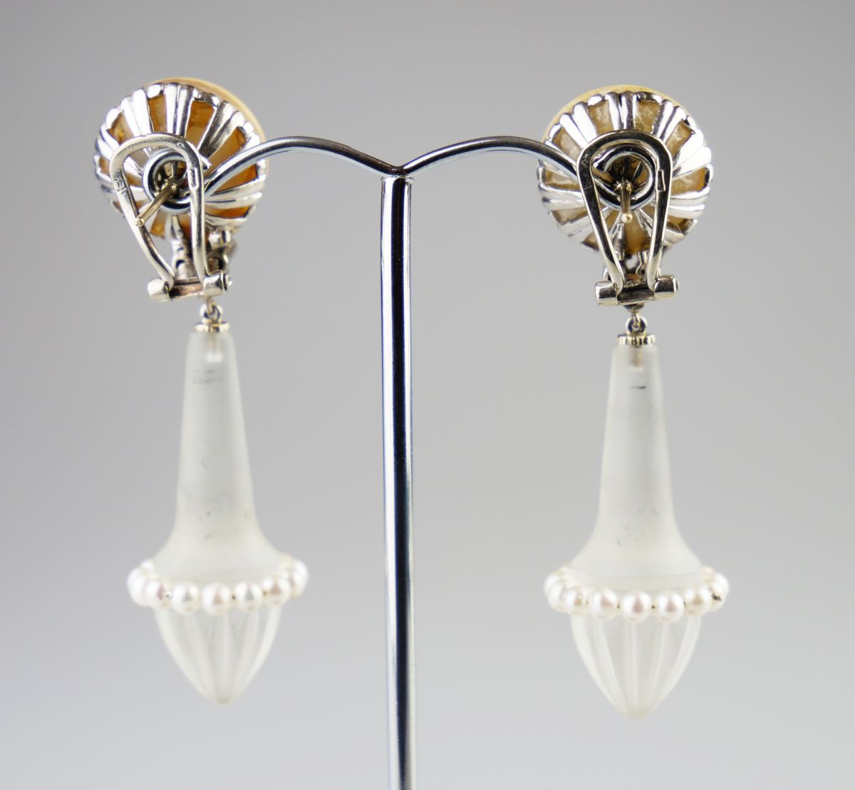 neobvyklé náušnice z bílého zlata a z matovaného přírodního horského křišťálu s perlami a diamanty, 6 drobných diamantů briliantového brusu o hmotnosti cca 0,12 ct, Au btto 20,15 g/585/1000, západní Evropa, kolem r. 1990; atest Puncovního úřadu, rozměry 5,7 x 1,6 cm