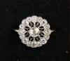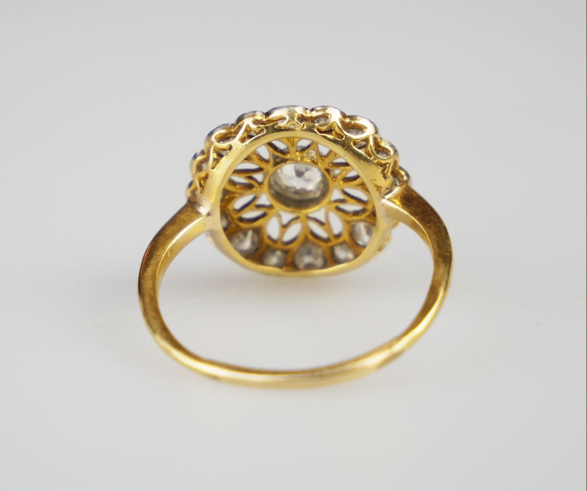 art deco zlatý prsten se 17 diamanty briliantového brusu o hmotnosti cca 1,2 ct, z toho centrální diamant o hmotnosti cca 0,35 ct, kameny v krajkově řešené hlavě zasazené v platině, Au+Pt btto 3,03 g/720+950/1000, západní Evropa, kolem r. 1935; atest Puncovního úřadu; velikost prstenu 59
