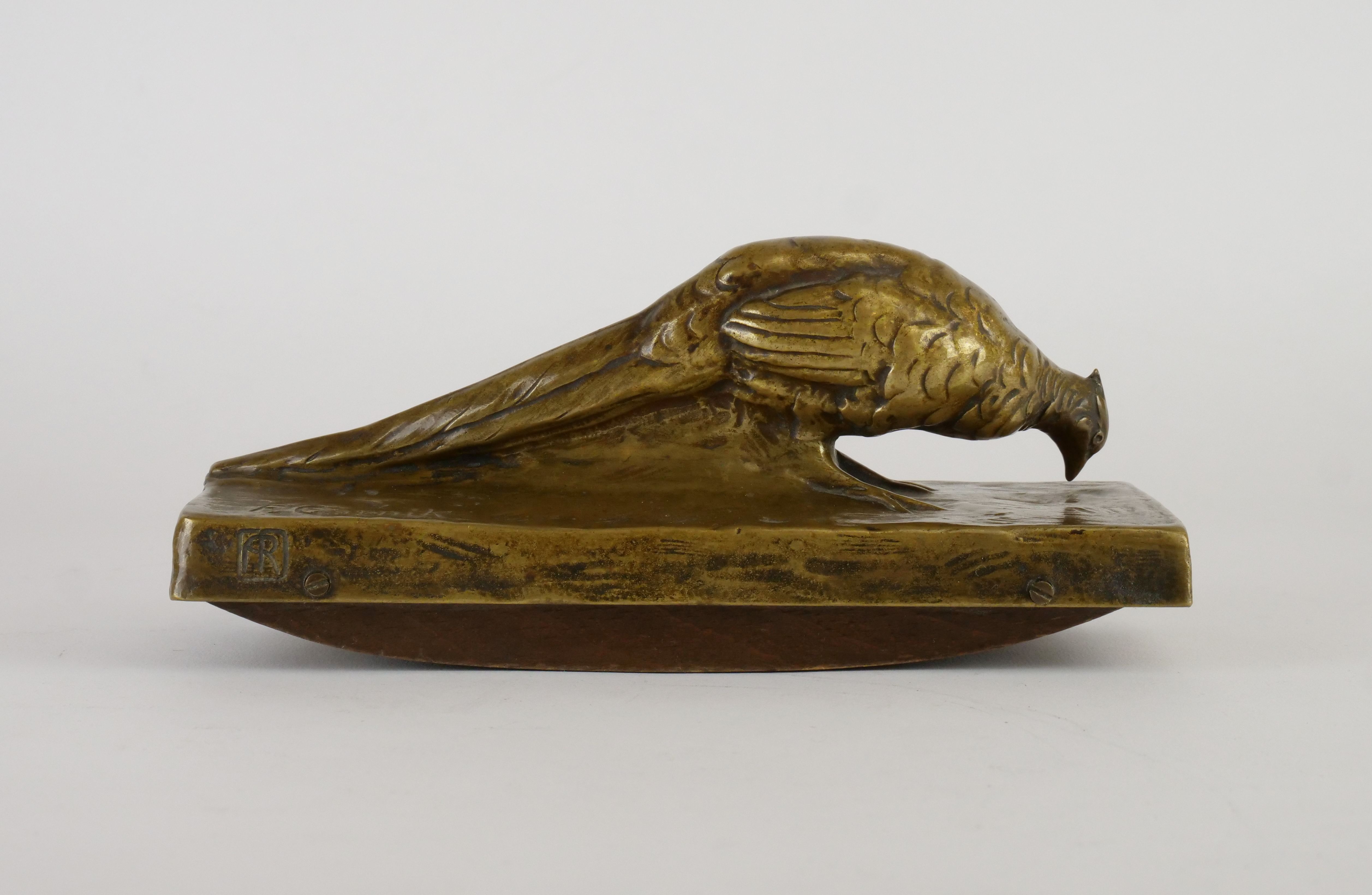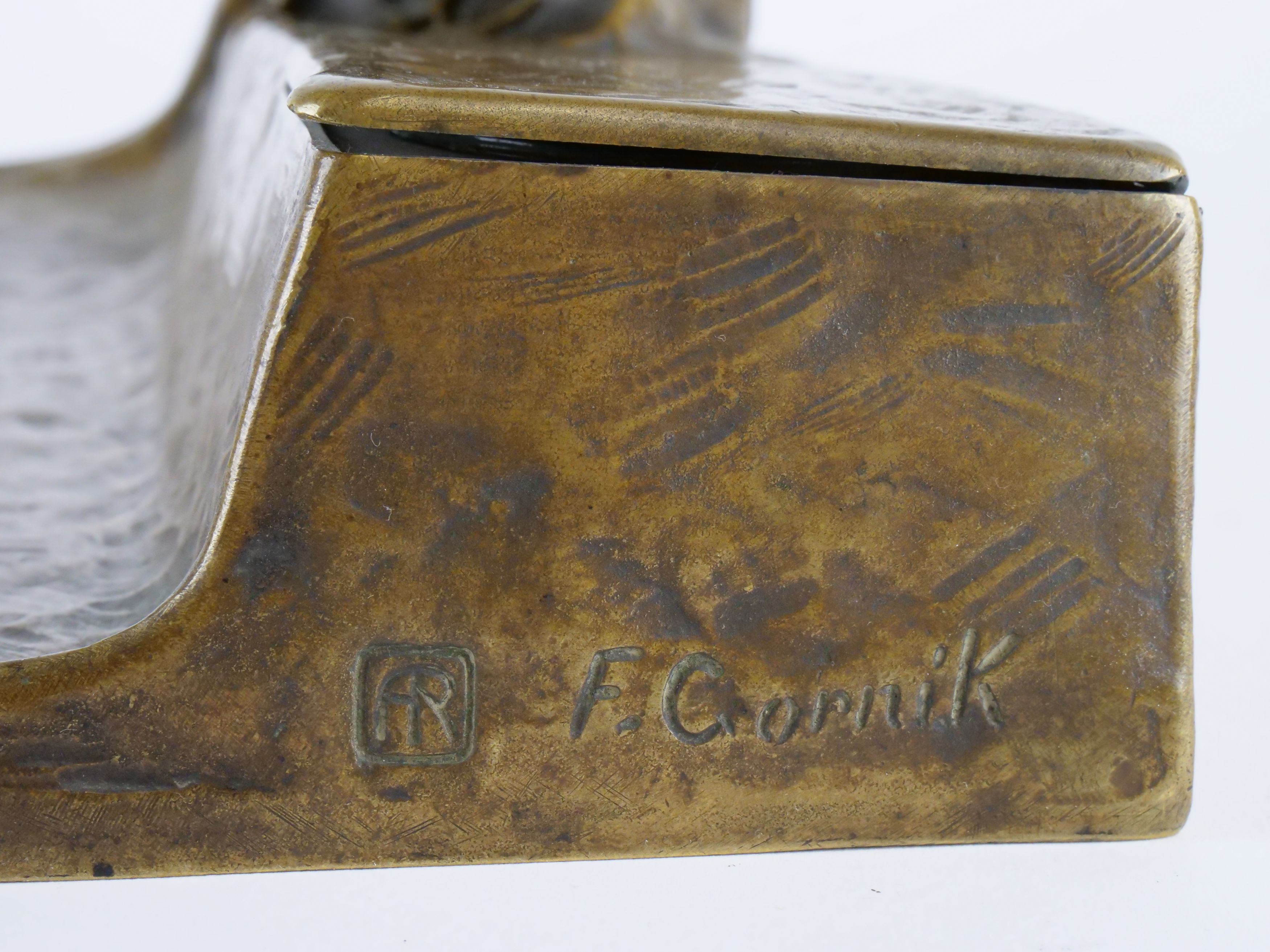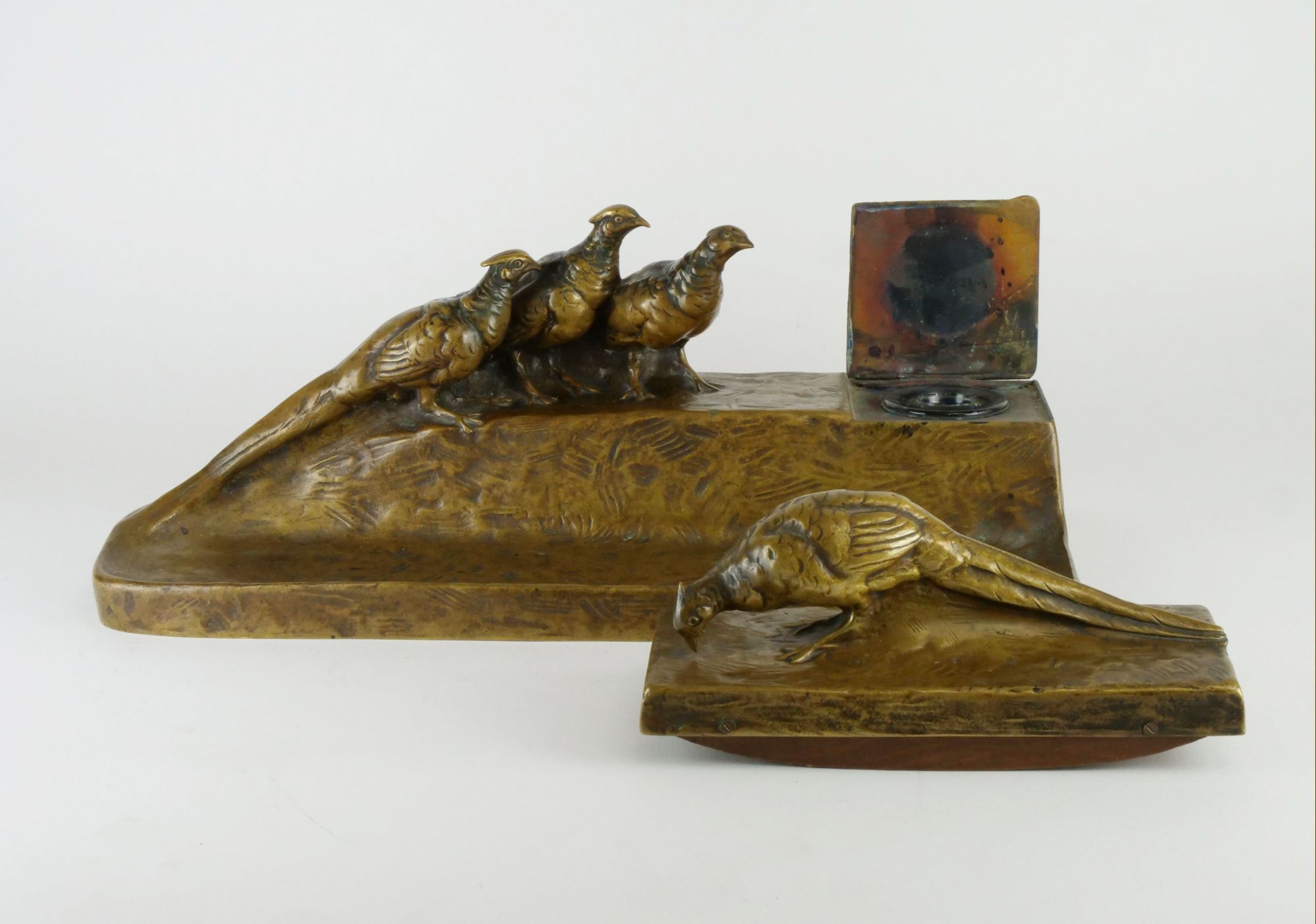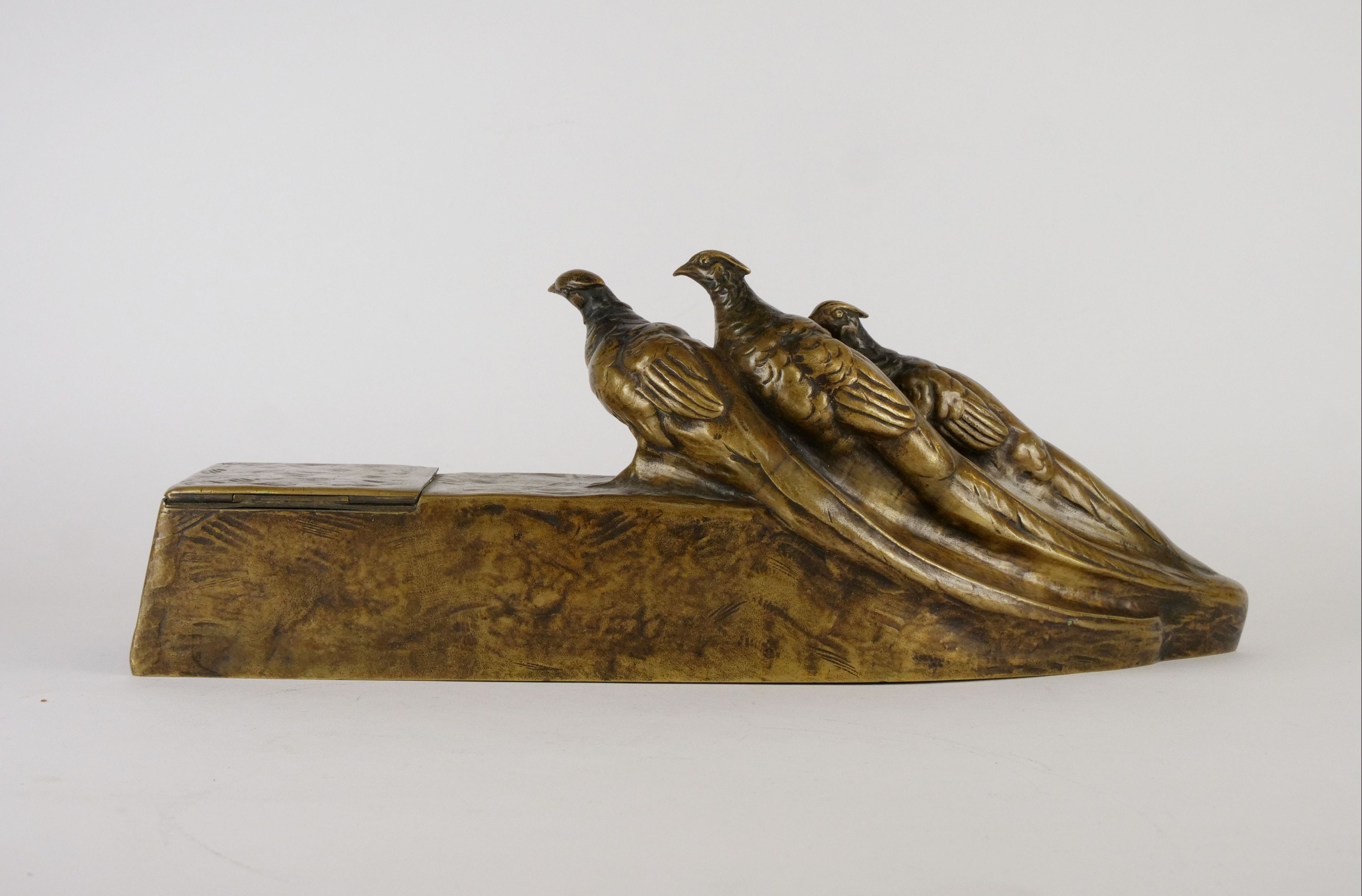 pozdně secesní psací souprava (2 ks) s loveckým námětem (bažanti), bronz patinovaný, výška figurálního kalamáře 14 cm, délka 37 cm, Rakousko, kolem r. 1915; signováno, značeno dílenskou značkou; autor designu rakouský sochař Friedrich Gornik (1877-1943), zakládající člen Korutanského uměleckého spolku (Kärntner Kunstverein); jeho práce jsou zastoupeny v mnoha muzejích, například v rakouském uměleckém muzeu Belvedere a ve Vojenském historickém muzeu ve Vídni (Heeresgeschichtliches Museum)