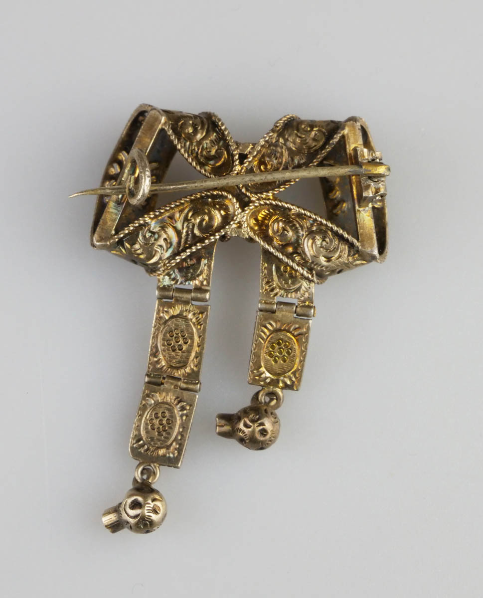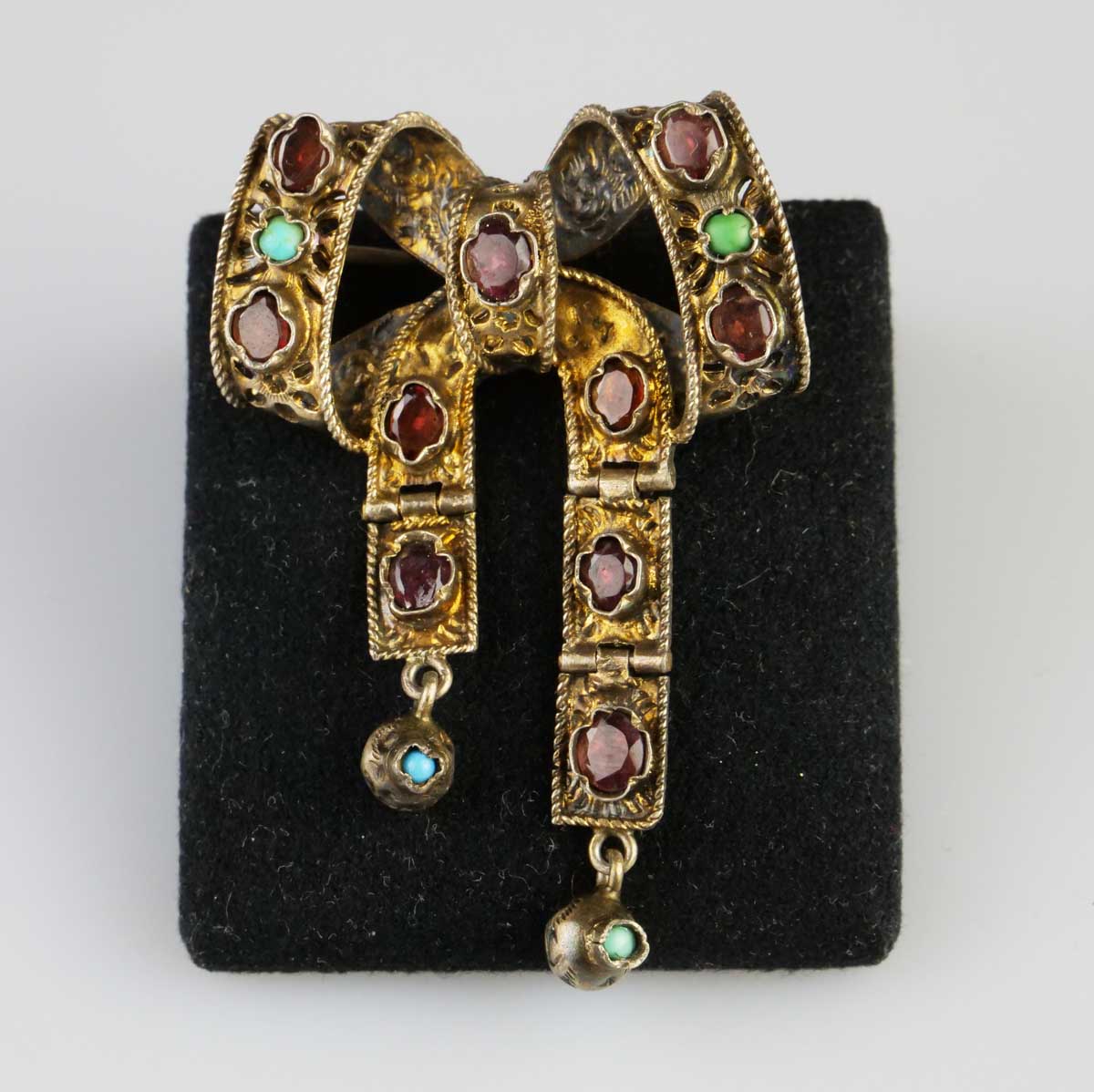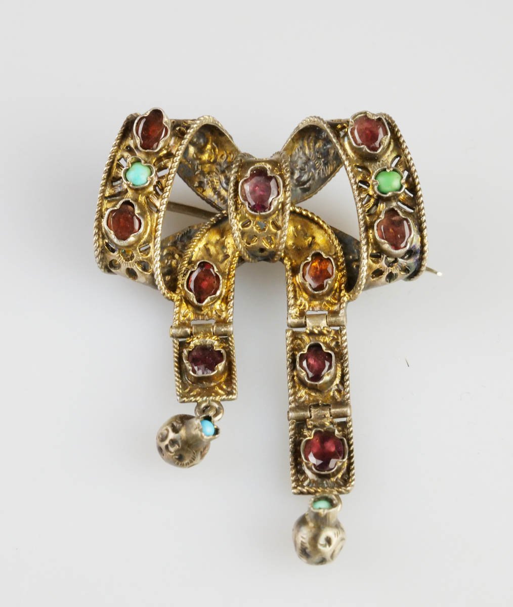 stříbrná brož ve tvaru mašle s tyrkysy a almandiny, Ag 8,90 g/800/1000, Rakousko-Uhersko, Sedmihradsko, kolem r. 1890; rozměry 5 x 3,5 cm; atest Puncovního úřadu