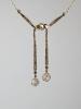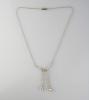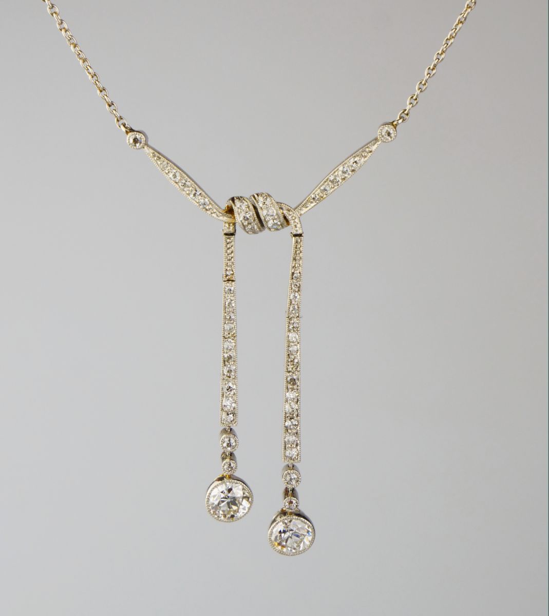 art deco platinový koliér s diamanty, efektní tvar zauzlované stuhy, Pt btto 9,36 g/900/000, celková hmotnost diamantů briliantového brusu je cca 1,6 ct, dva hlavní diamanty briliantového brusu o hmotnosti cca 0,5 + 0,5 ct, čistota SI3, barva I-J, střední Evropa, kolem r. 1925, délka řetízku 38 cm, závěs 5,5 x 3 cm; atest Puncovniho úřadu
