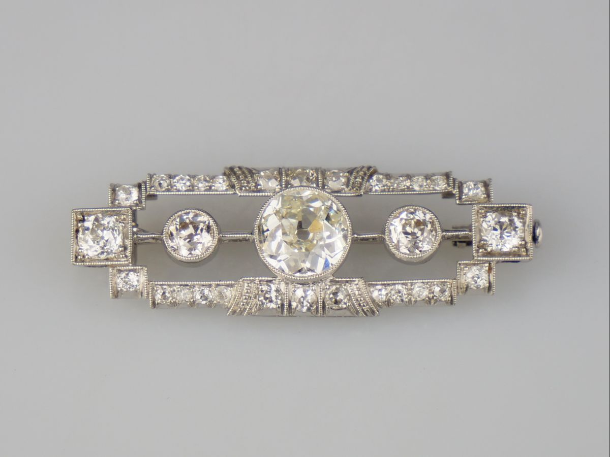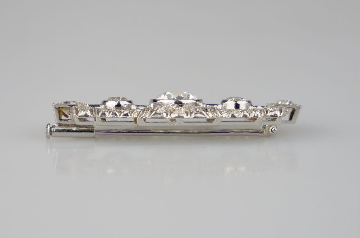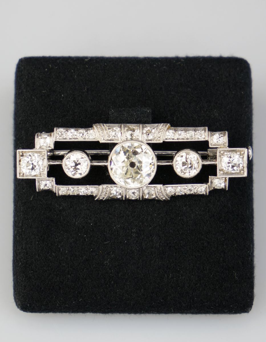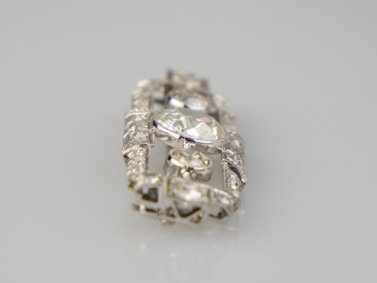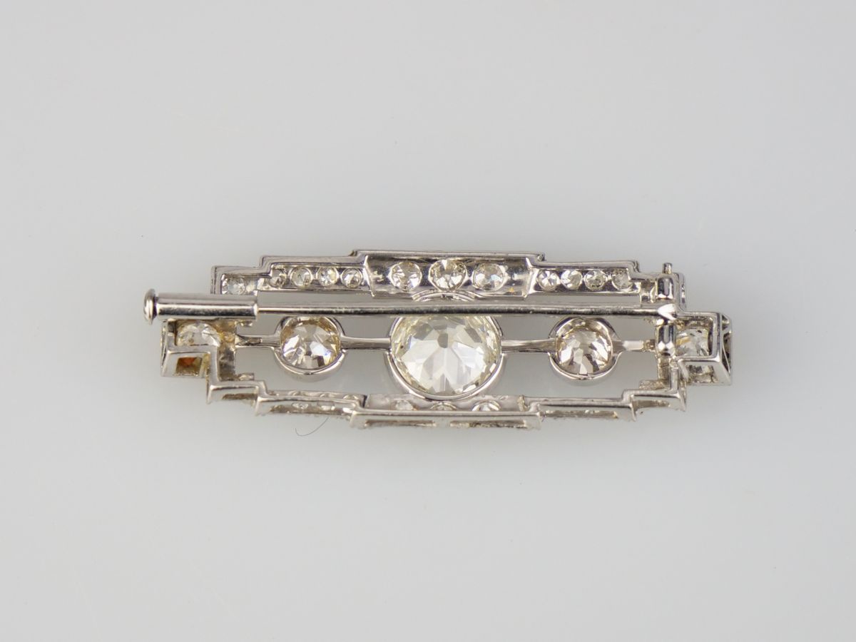 art deco brož z bílého zlata s diamanty starého briliantového brusu, Au btto 3,87 g/585/1000, centrální diamant 1,5 ct, čistota VVS2, dále jsou na broži diamanty o celkové hmotnosti 1,47 ct, Československo, kolem r. 1930, dobový punc (lvíček); délka 4,1 cm, šířka 0,7 cm; sběratelsky zajímavé