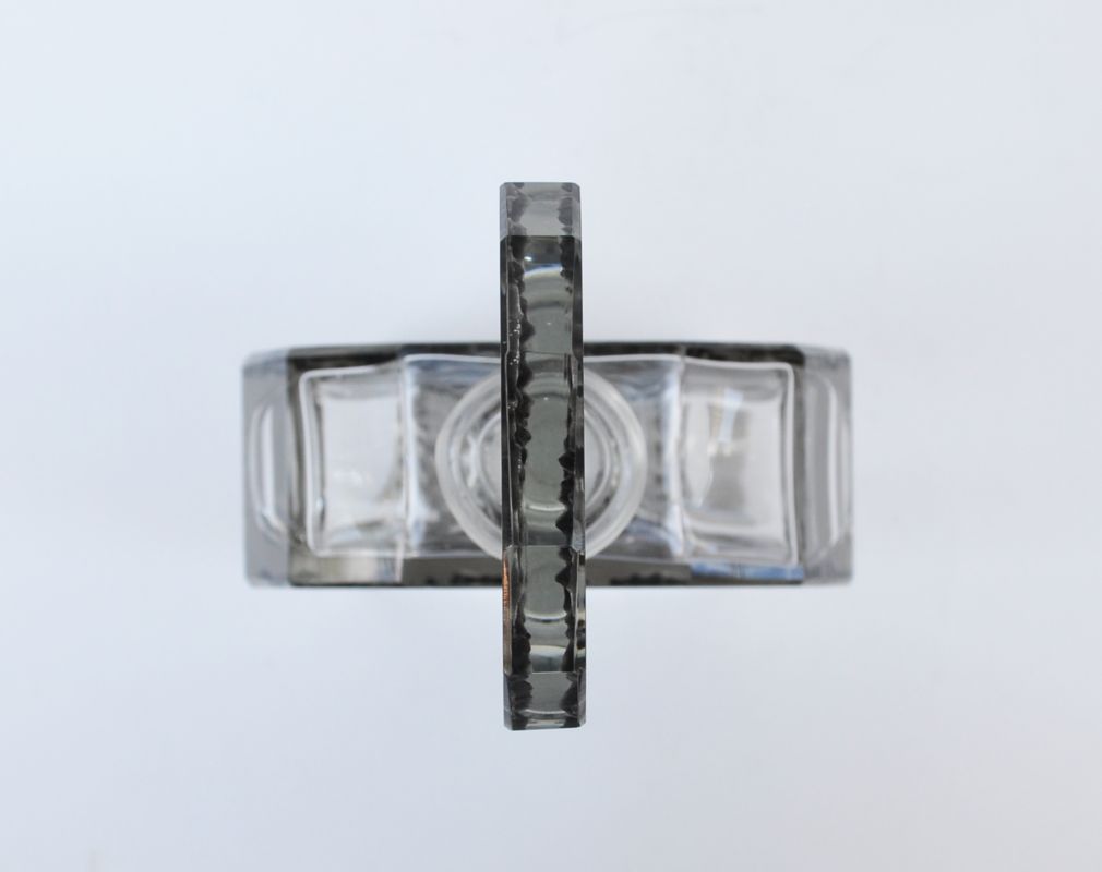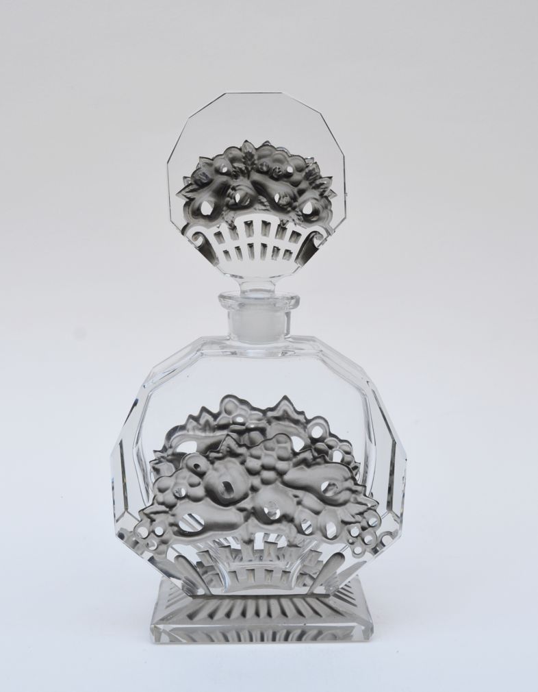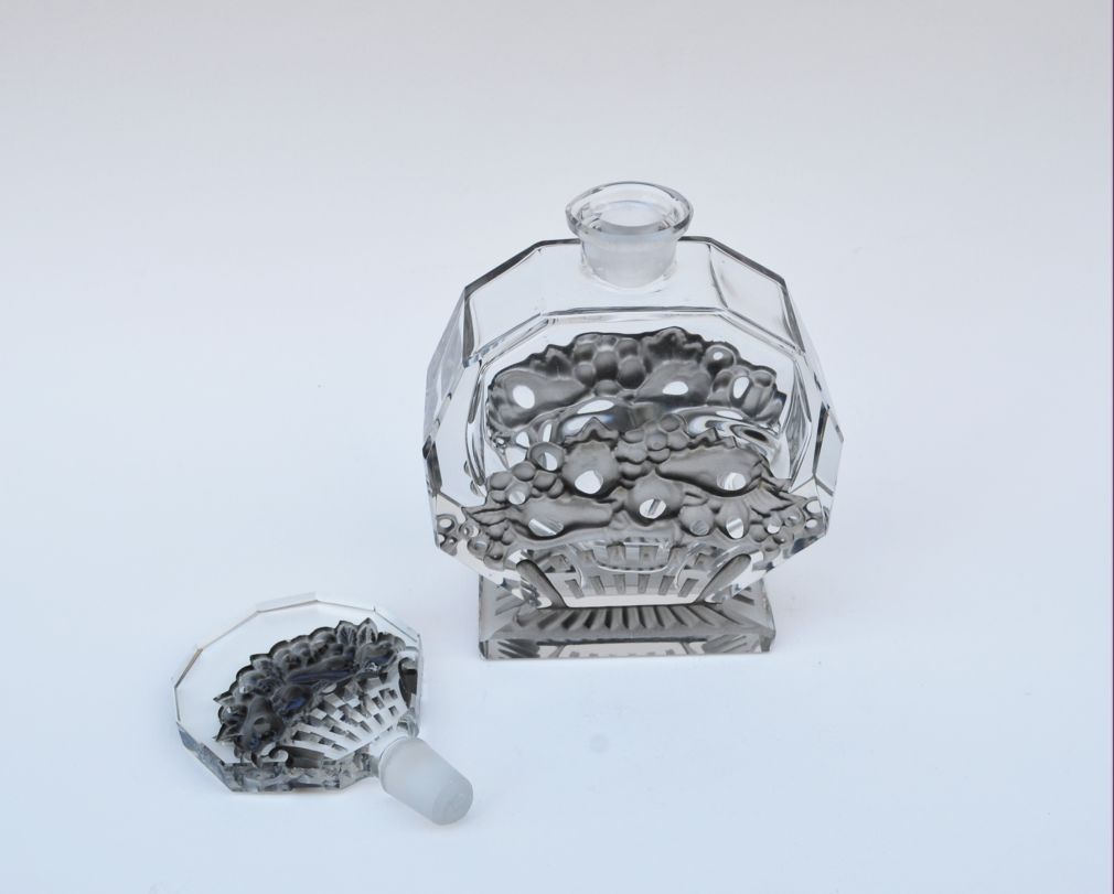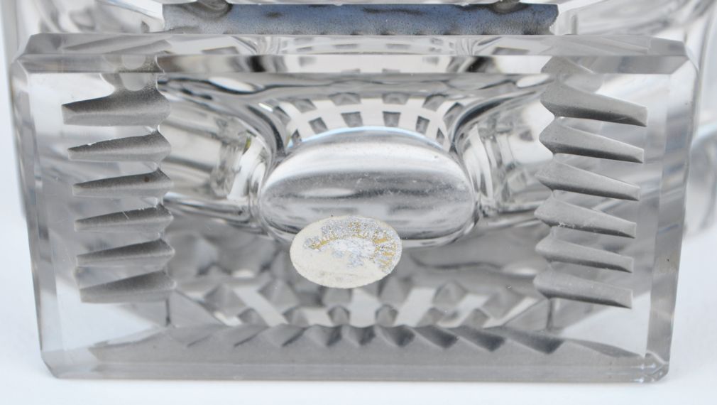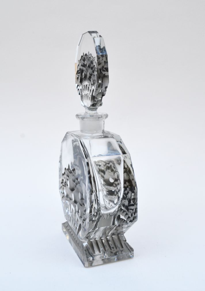 art deco likérová karafa, firma Bruno Posselt, Tanvald, lisované a broušené křišťálové sklo se stříkaným efektem; Československo, 1935; výška se zátkou 21,5 cm, bez zátky 13,5 cm, délka 11 cm, hloubka 4,5 cm