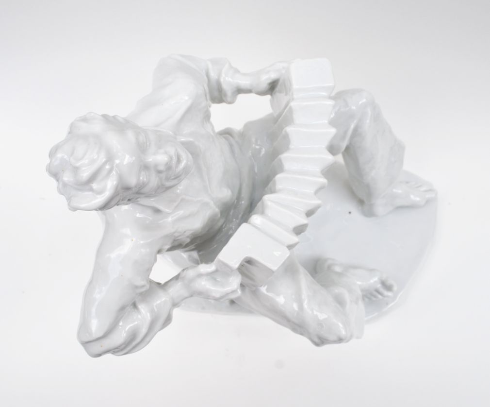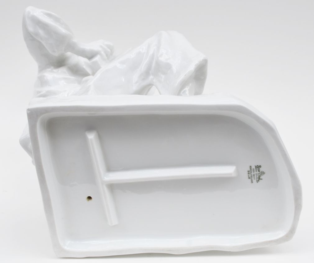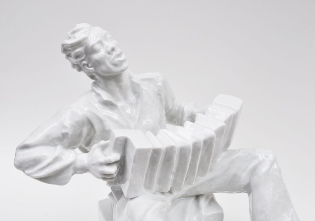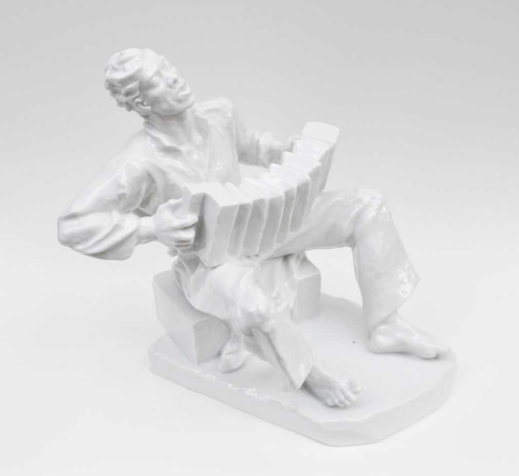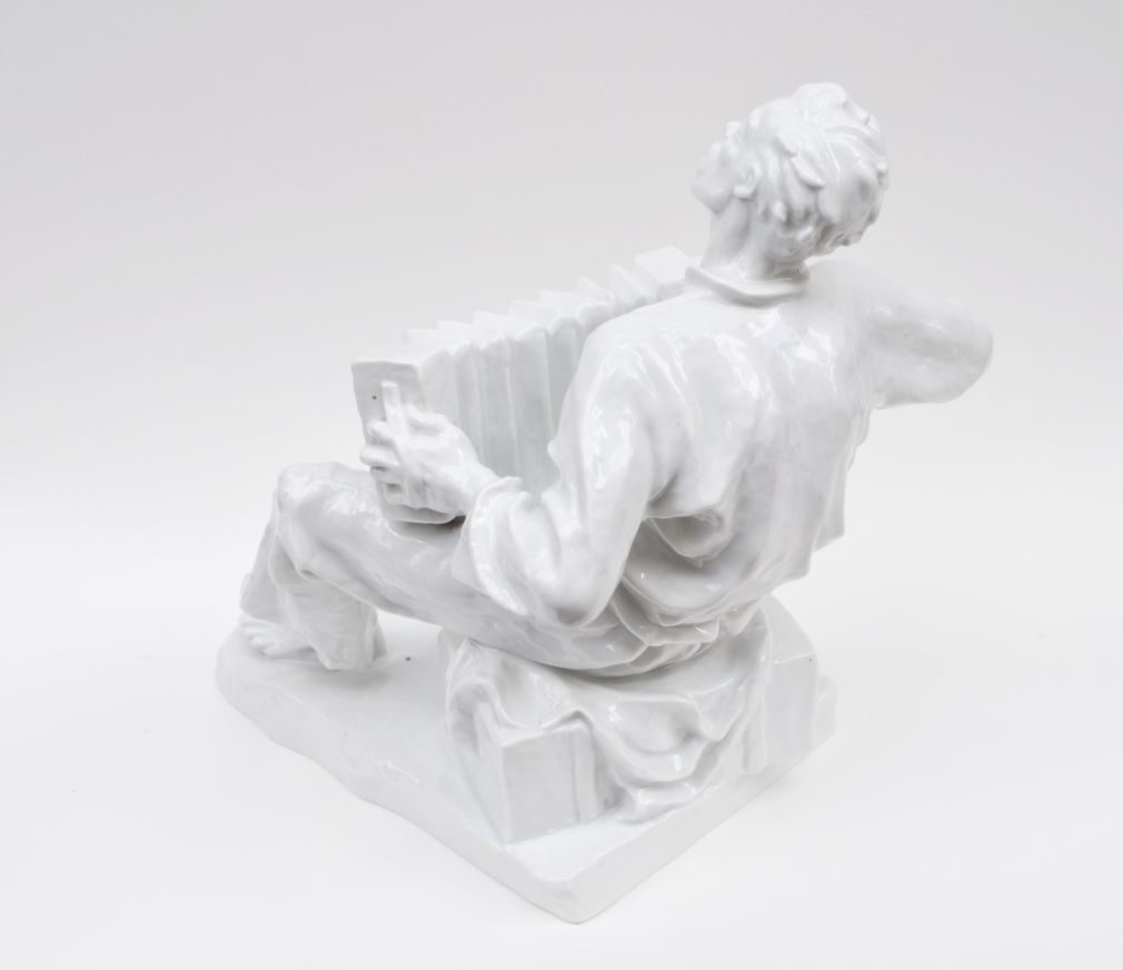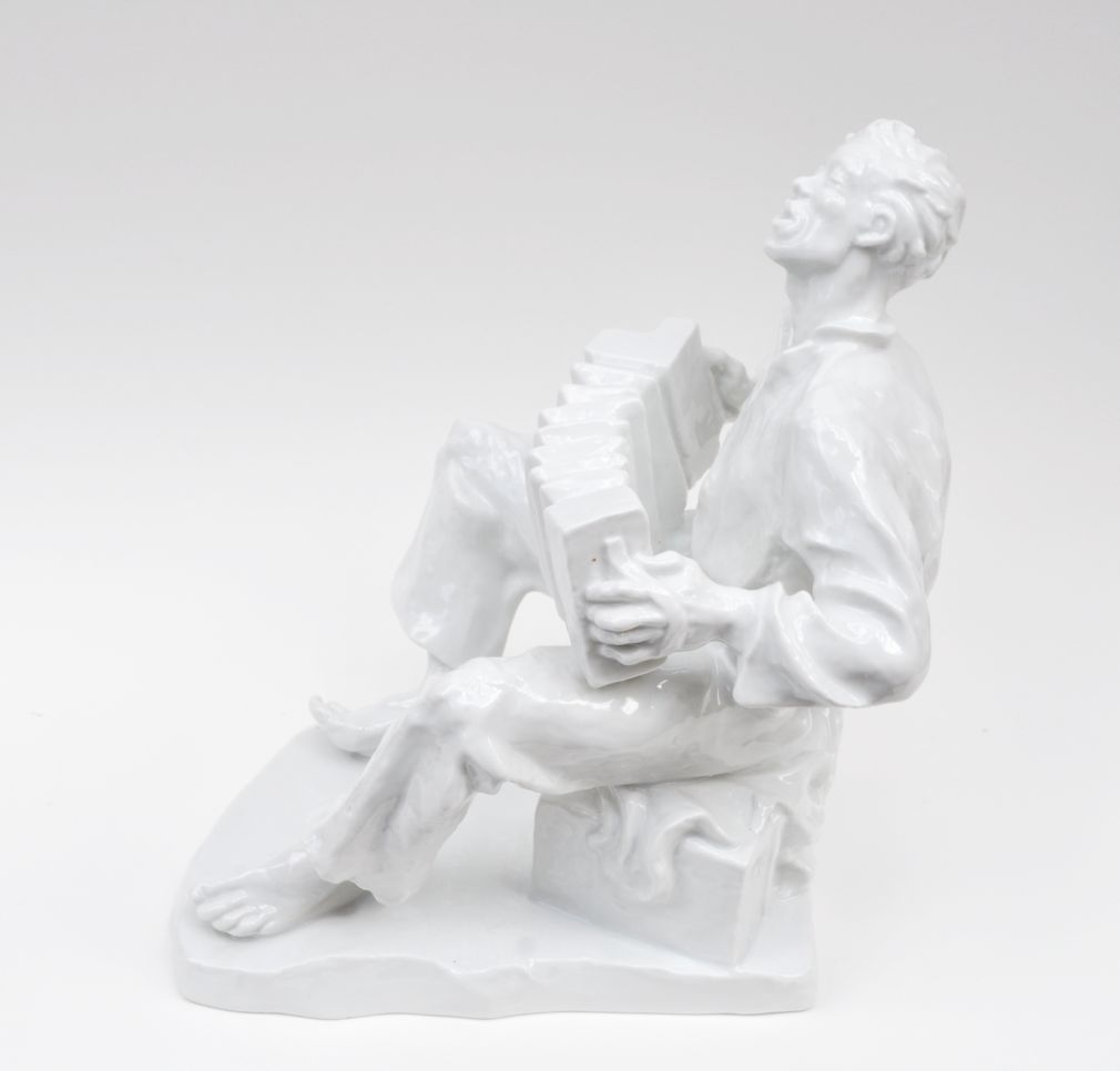 porcelánová figura harmonikáře, bílá glazura, značeno Rosenthal, Německo, modelérka Elisabeth Höfer-Kelling, datováno 1935, málo se vyskytující model; výška 26 cm, délka 21 cm, hloubka 20 cm