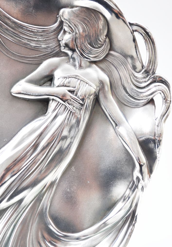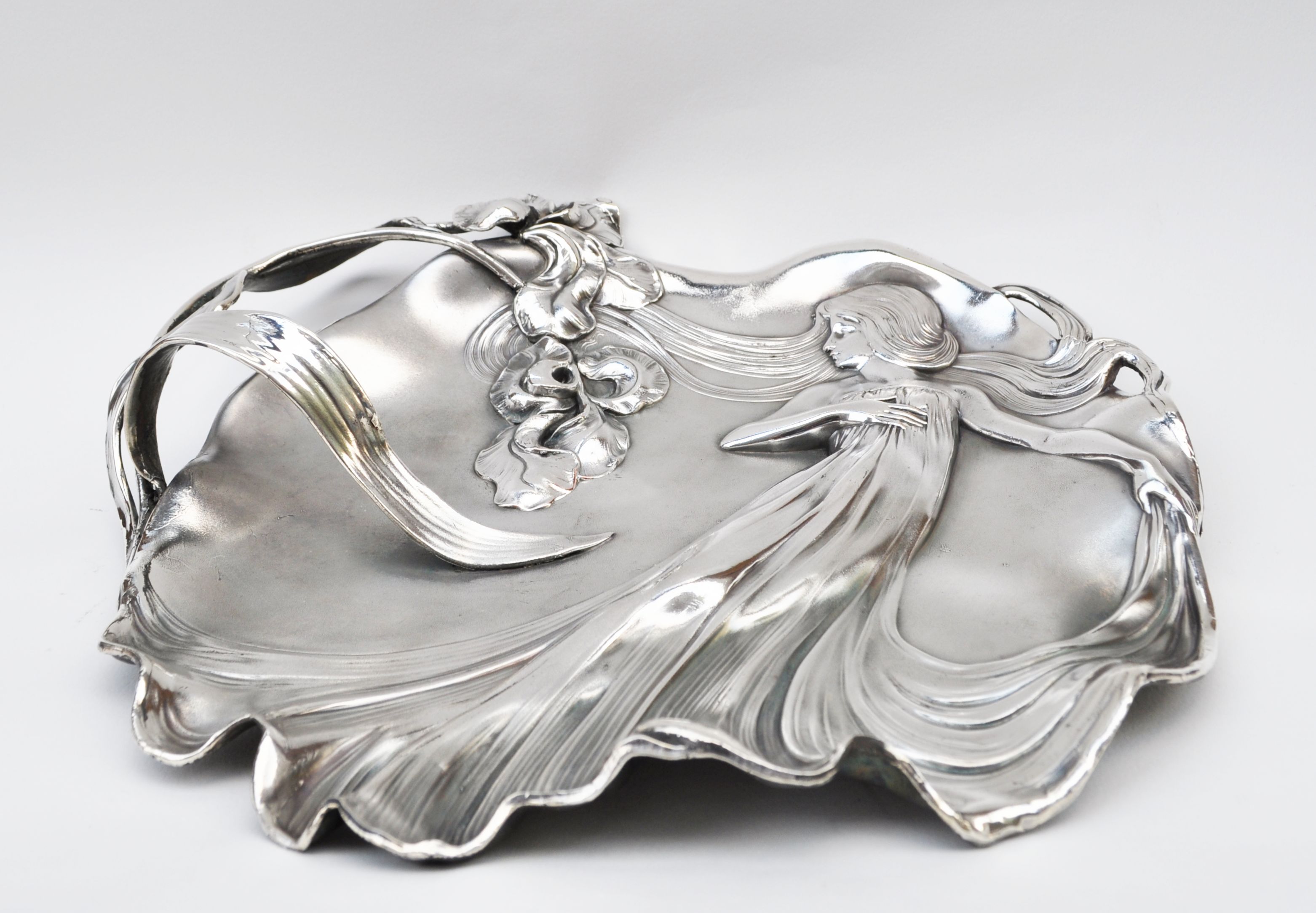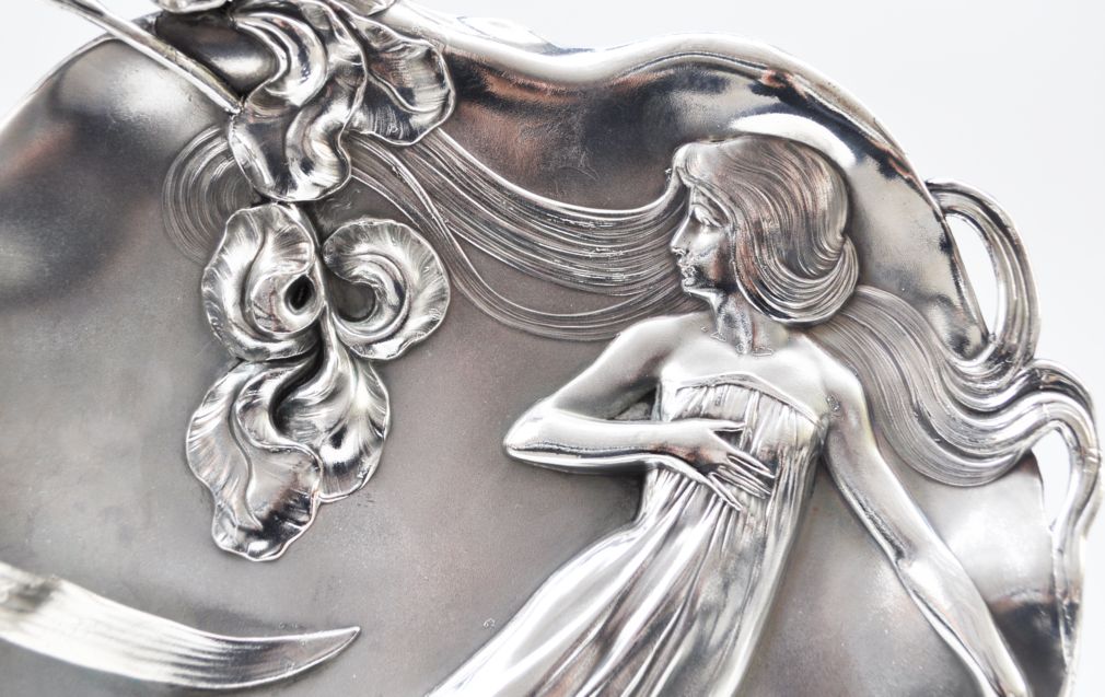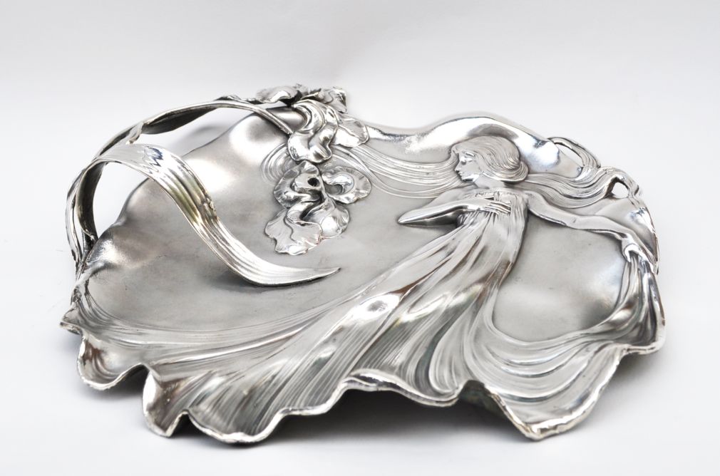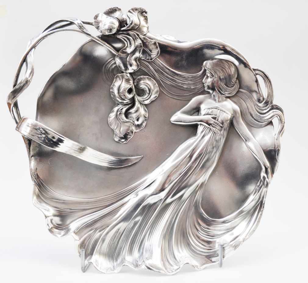 tác na vizitky a dopisy z postříbřeného kovu, vrcholně secesní provedení s výrazným figurálním motivem, značeno WMF (Württembergische Metallwarenfabrik), Německo - Geislingen, pod katalogovým číslem 290, kolem roku 1905; délka 31 cm, výška 29 cm