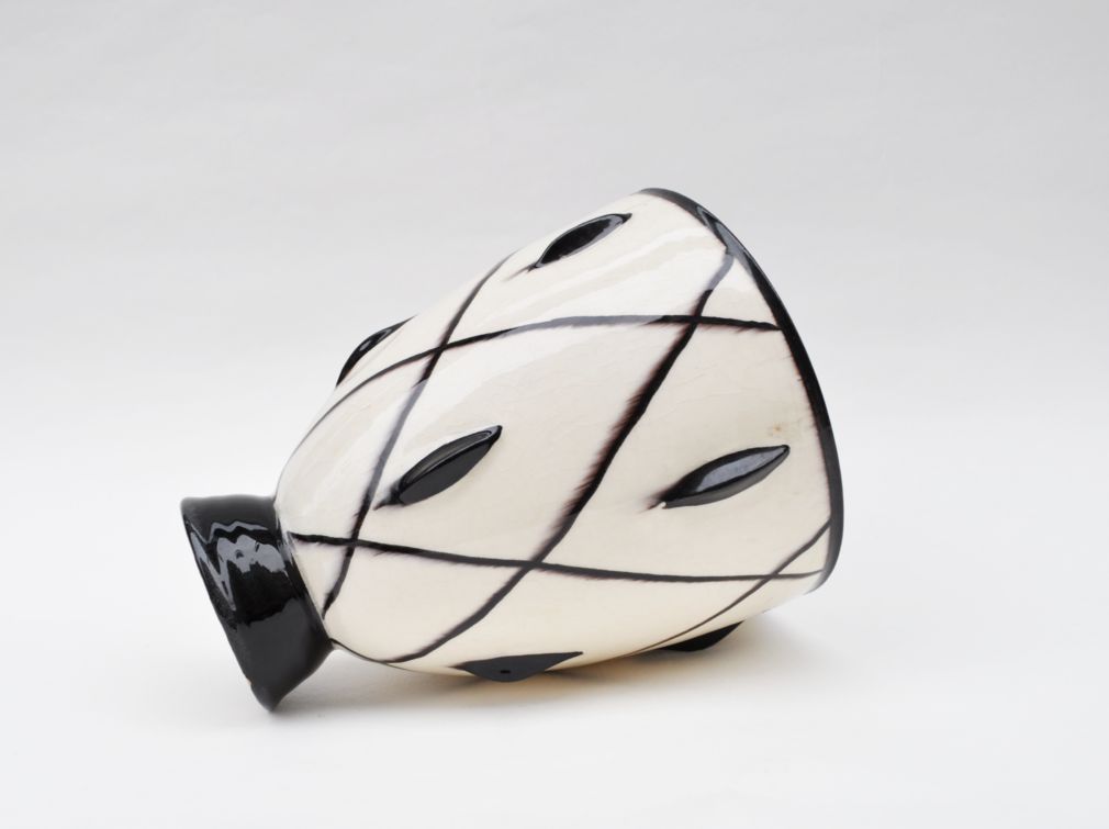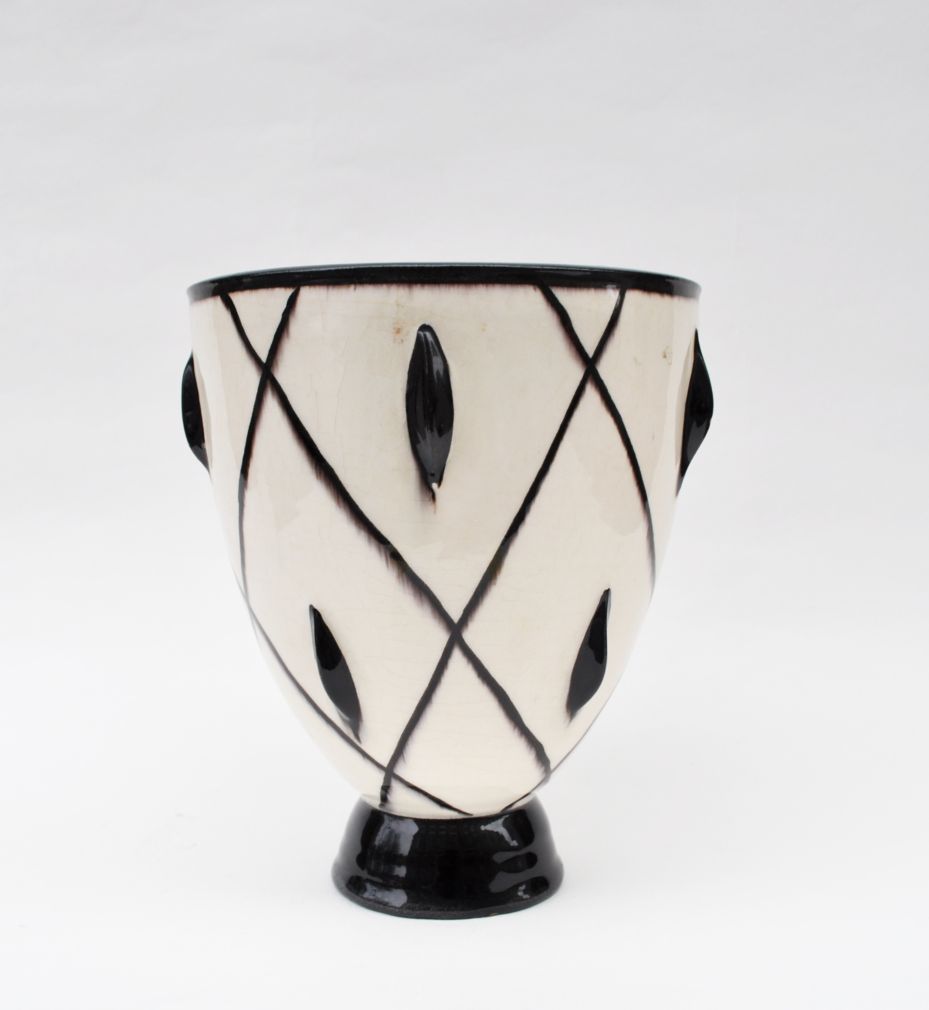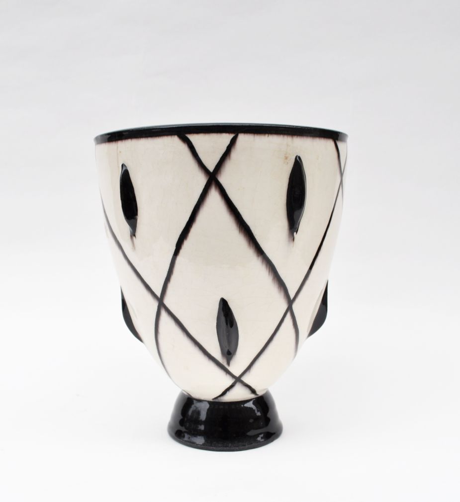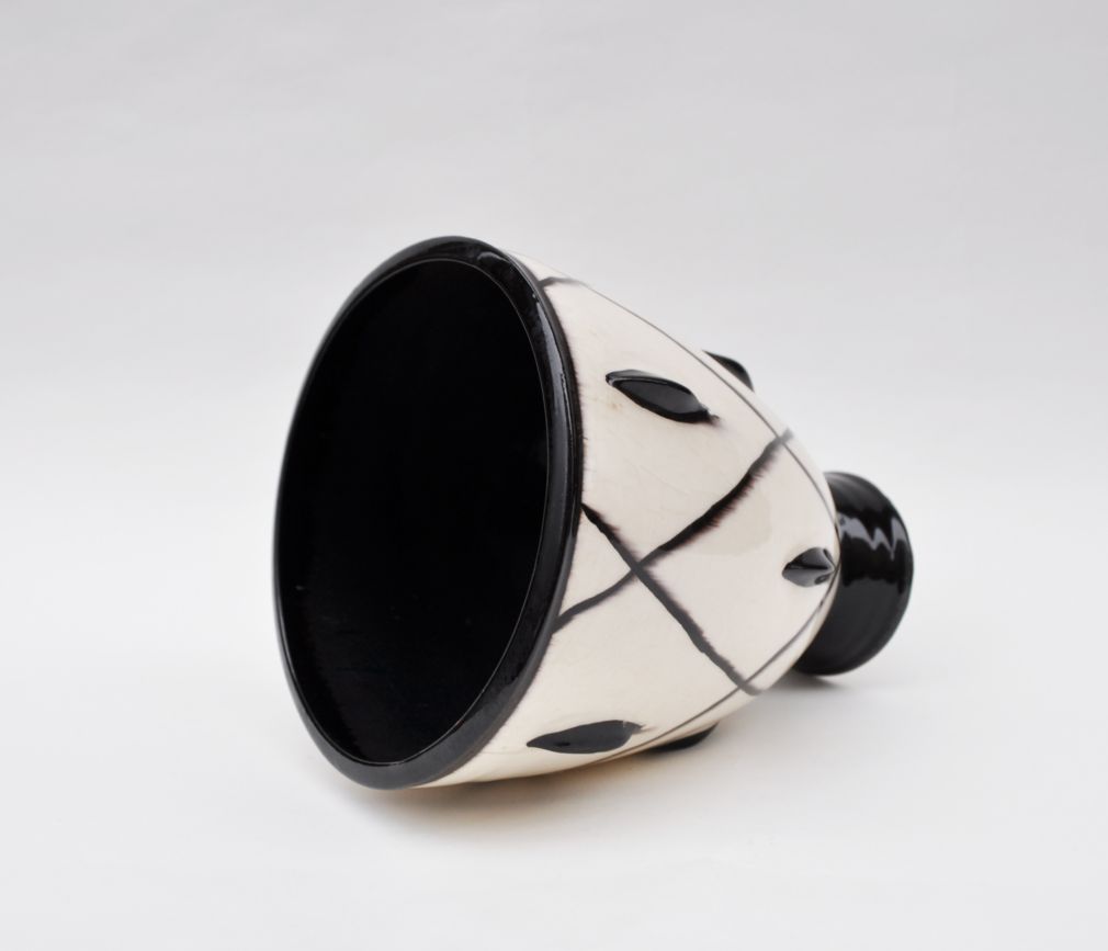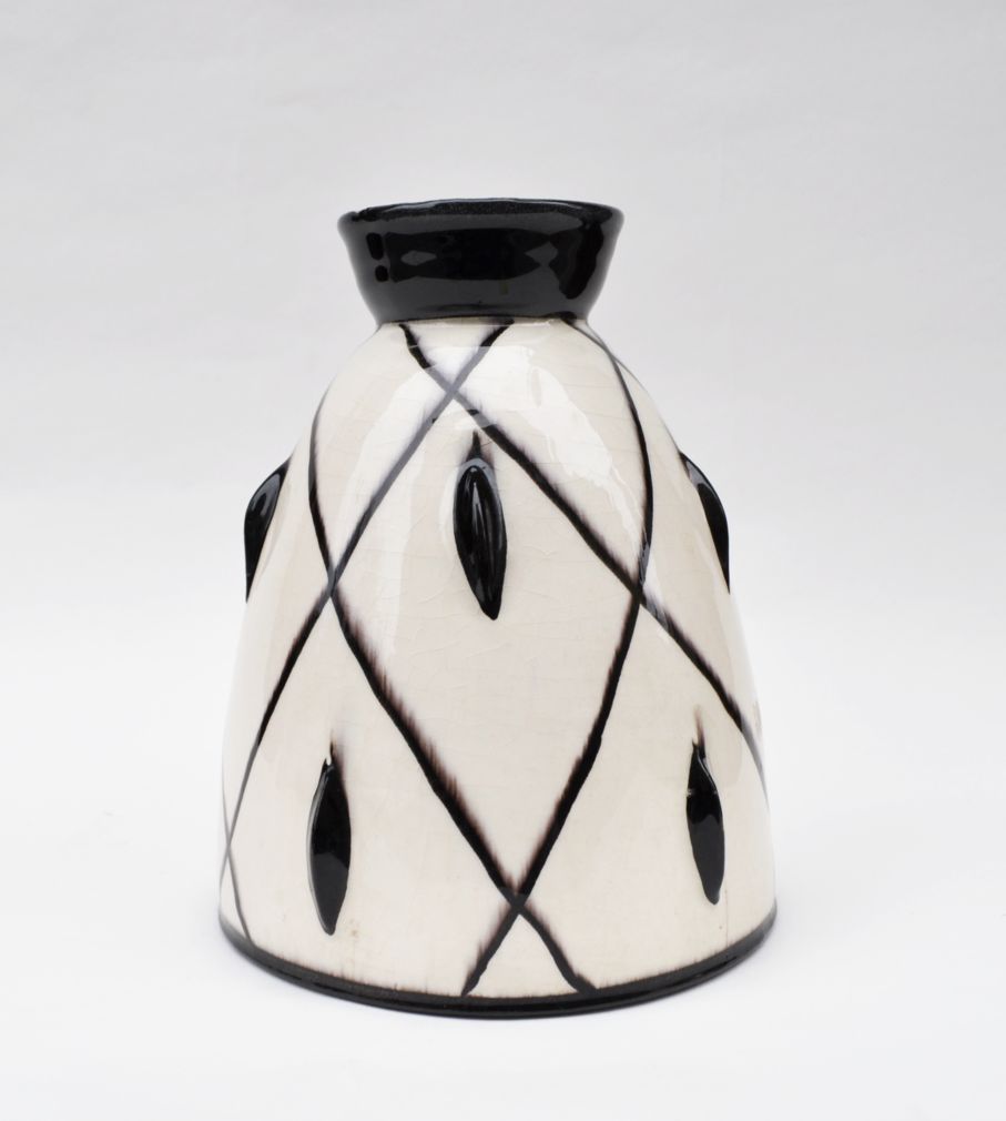 art deco kameninová váza kónického tvaru s černobílým dekorem, neznačeno, výrazný design, pravděpodobně Rakousko, okruh Wiener Werkstätte, kolem roku 1925; výška 16,5 cm, průměr 13 cm