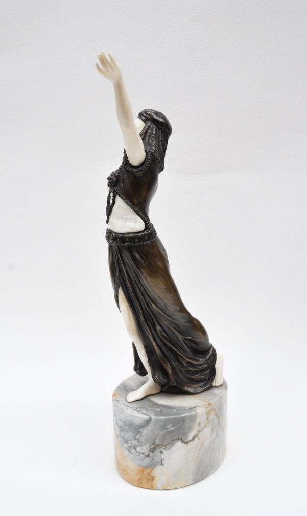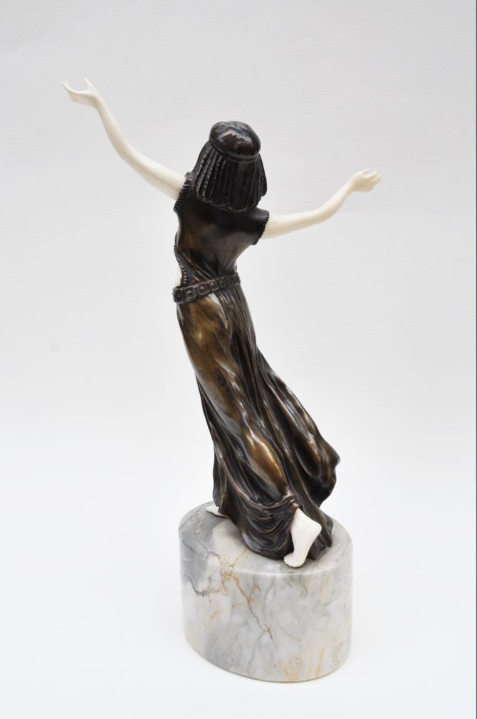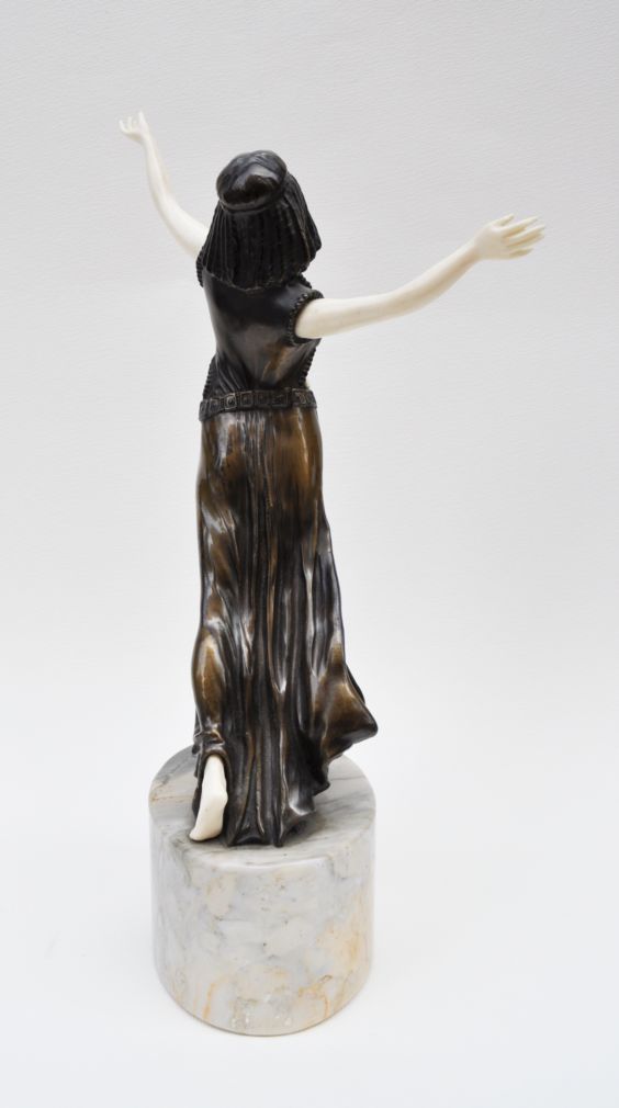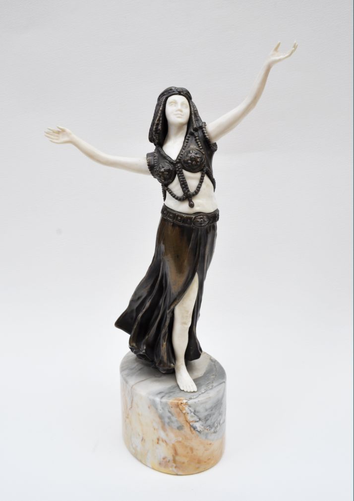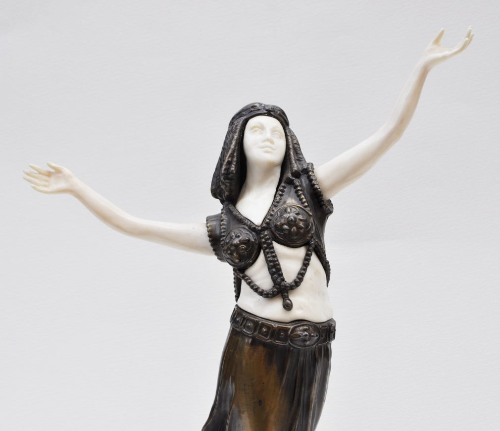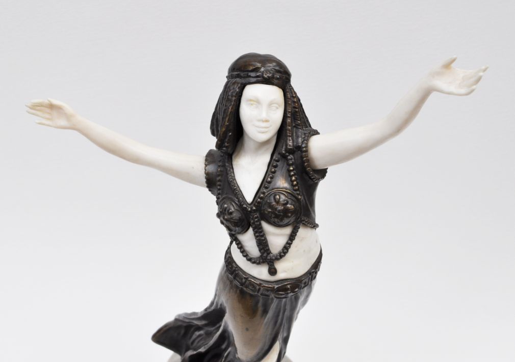 socha tančící Egypťanky z obecného kovu v kombinaci s kostí (není to slonovina), na kamenném podstavci, nesignováno, západní Evropa, kolem roku 1925; výška 32,4 cm