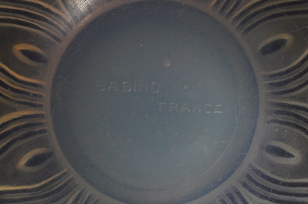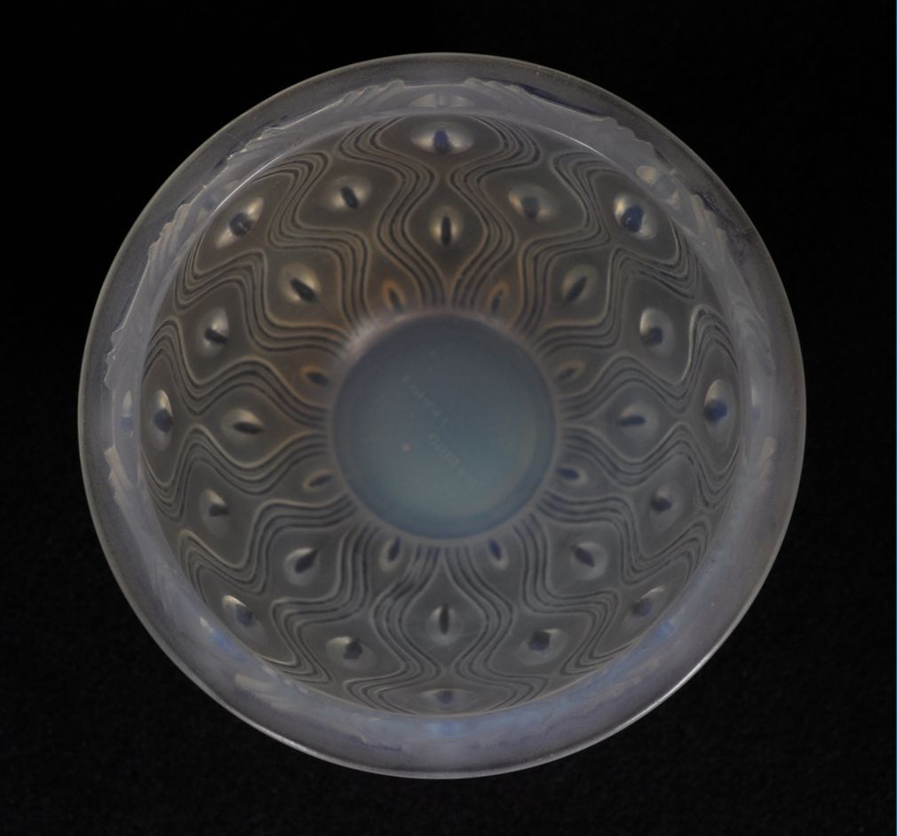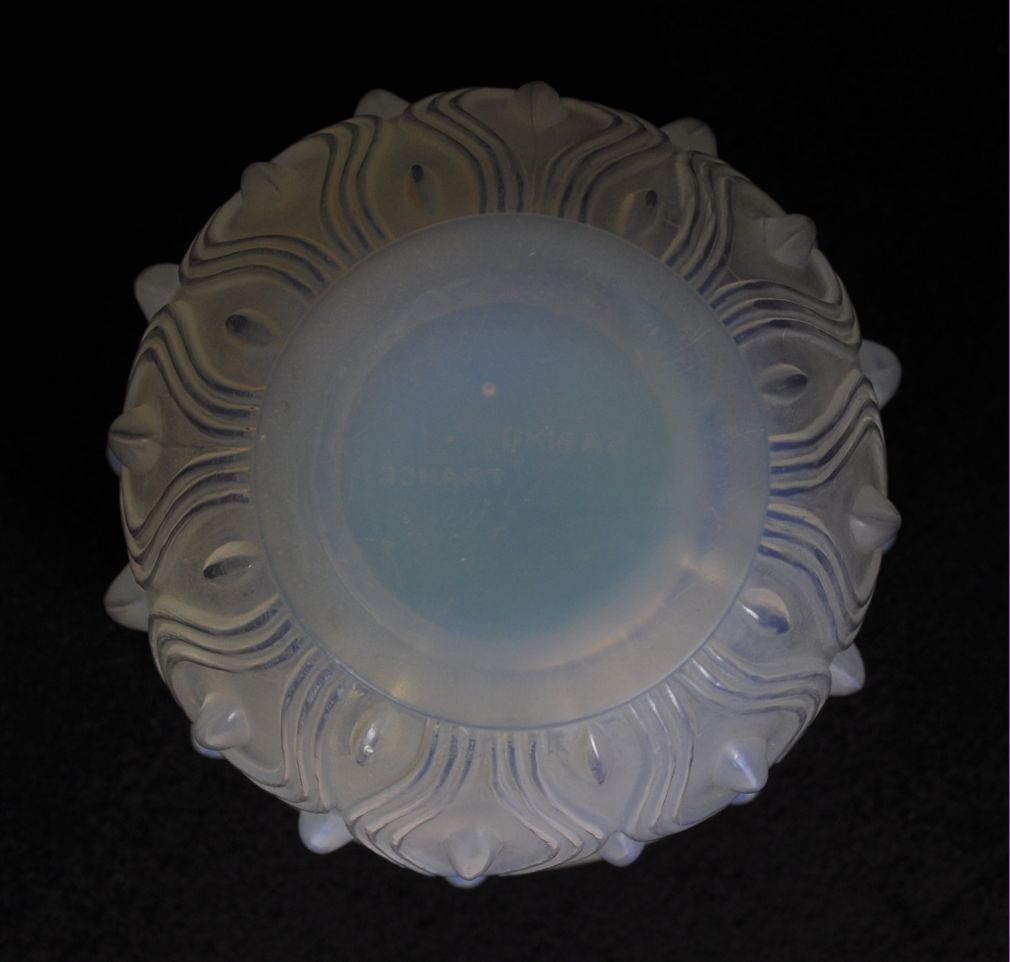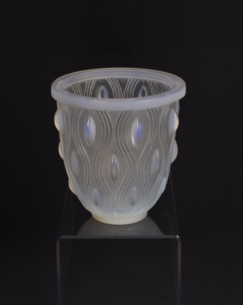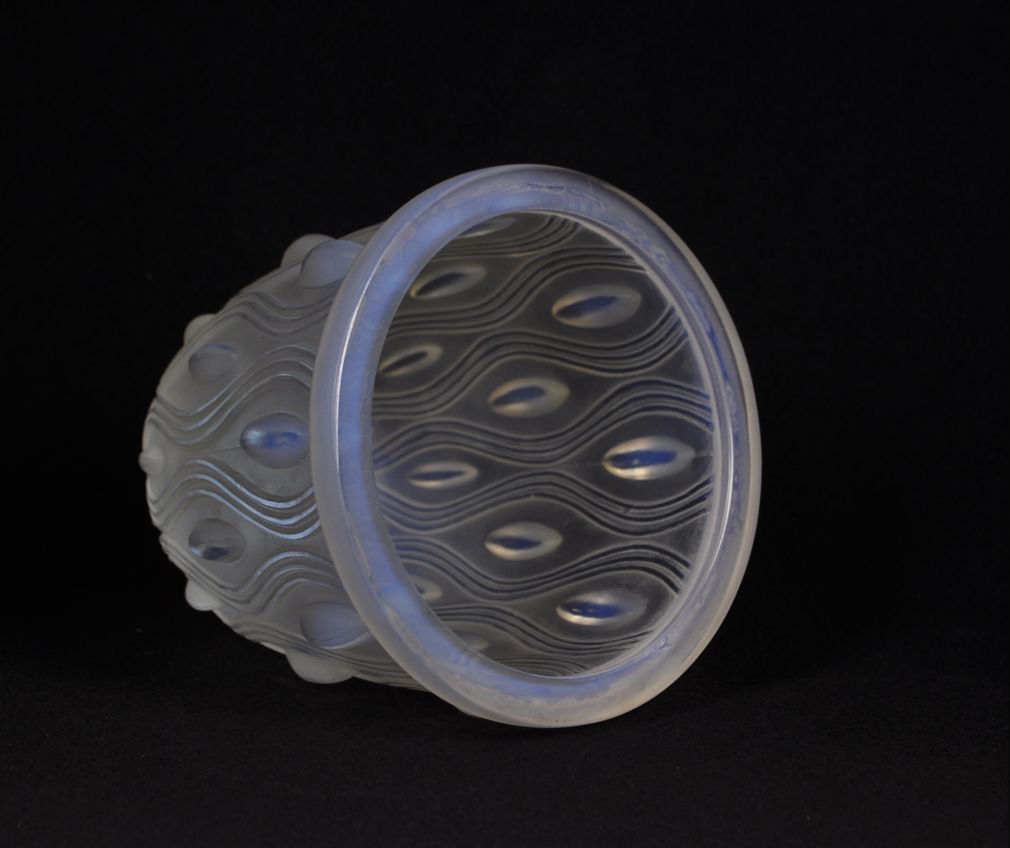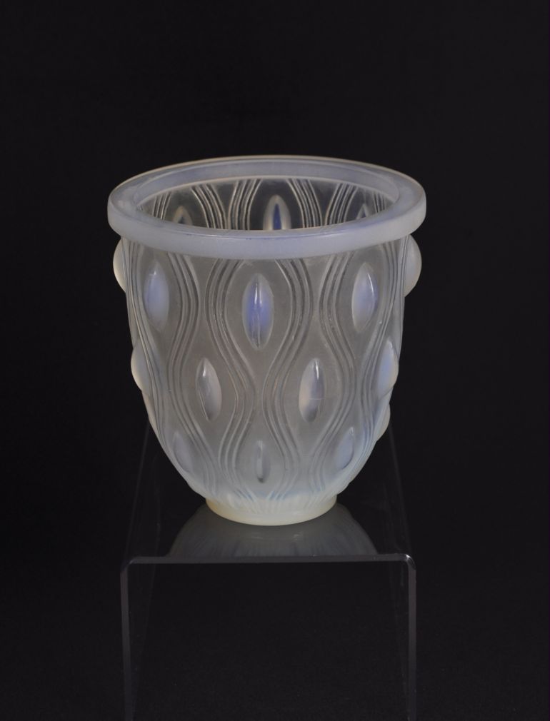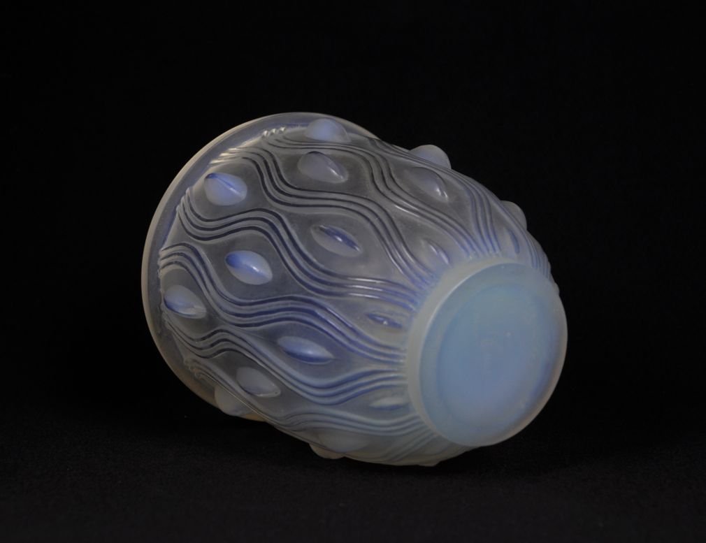 art deco váza z opálového skla, v katalogu pařížské sklárny Sabino uvedeno pod názvem ”Sinuosites et ovales” (zákruty a ovály), značeno Sabino France, kolem roku 1930; výška 14 cm, průměr 13,5 cm