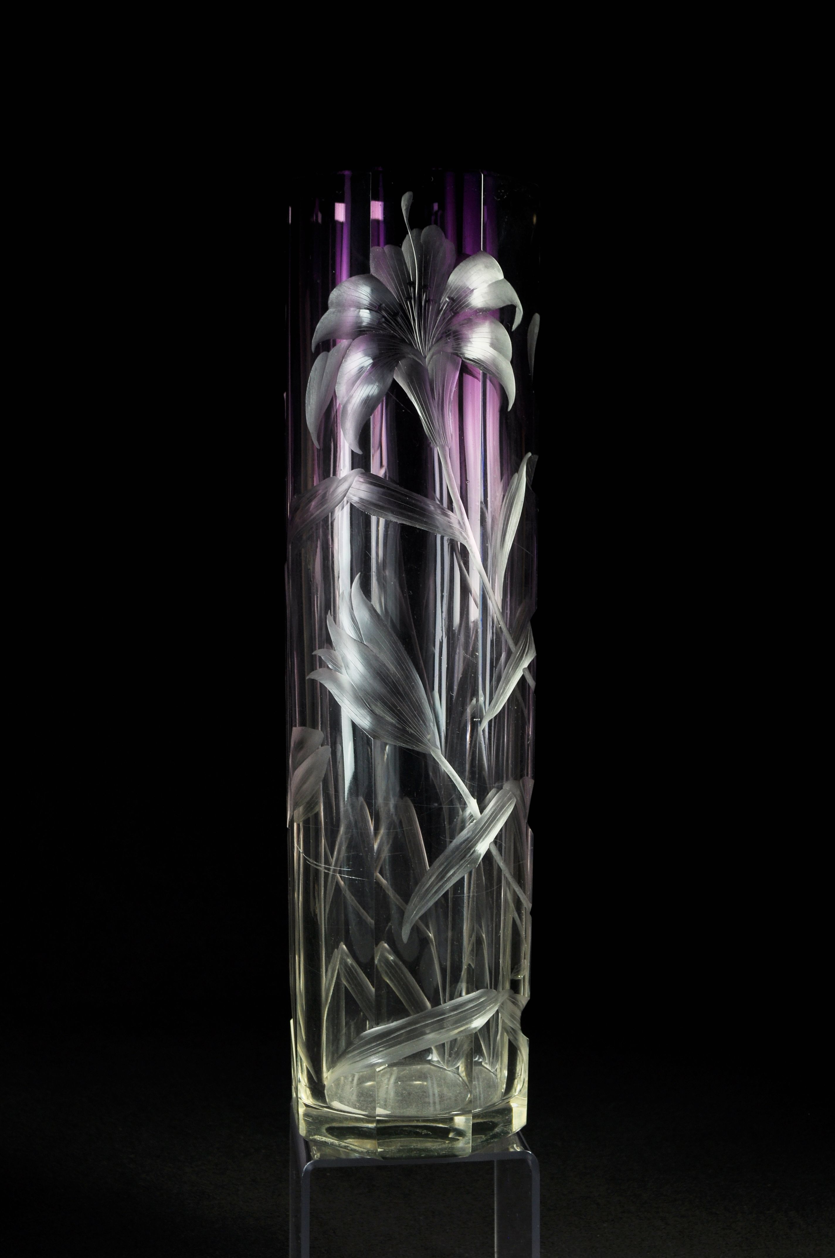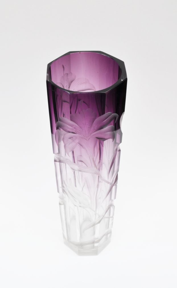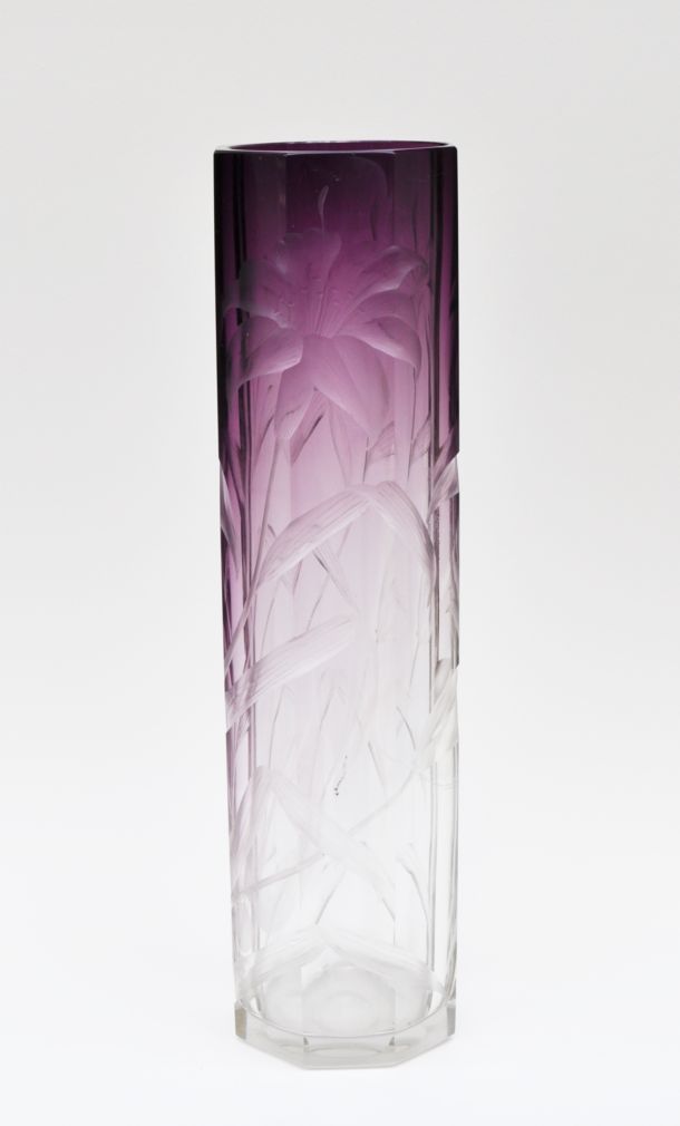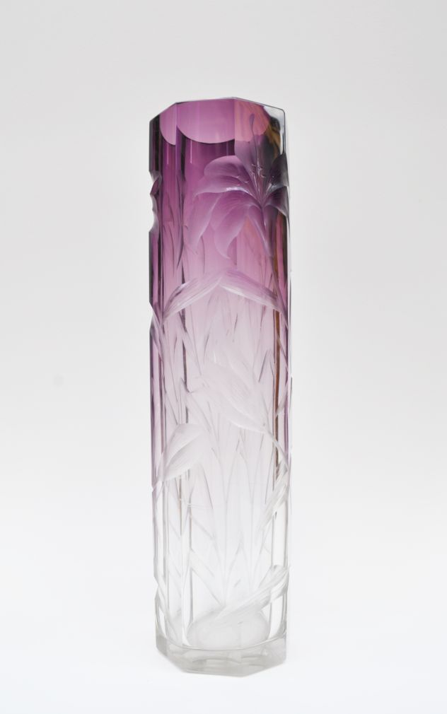 efektní vysoká váza z bezbarvého skla, uvnitř nahoře fialově sbíhaného, hranolový oktagonální brus, přes hrany hluboce řezaný bohatý dekor lilií (”Eckentief-Gravur”), průměr 9 cm, výška 35 cm; sklárna Moser Karlsbad, kolem r. 1915; značeno dobovou leptanou značkou; sběratelsky zajímavý kus ze secesního sortimentu sklárny