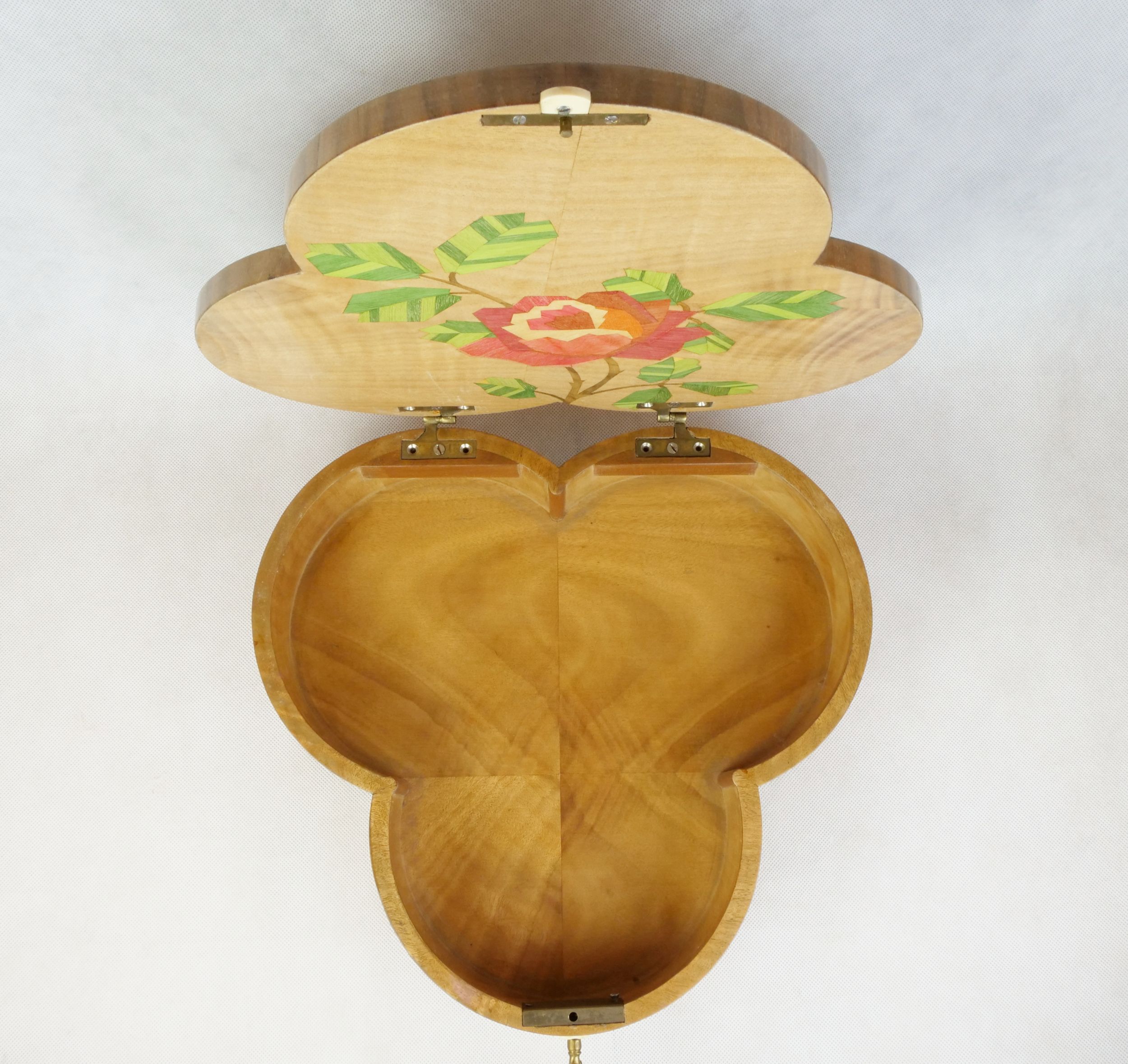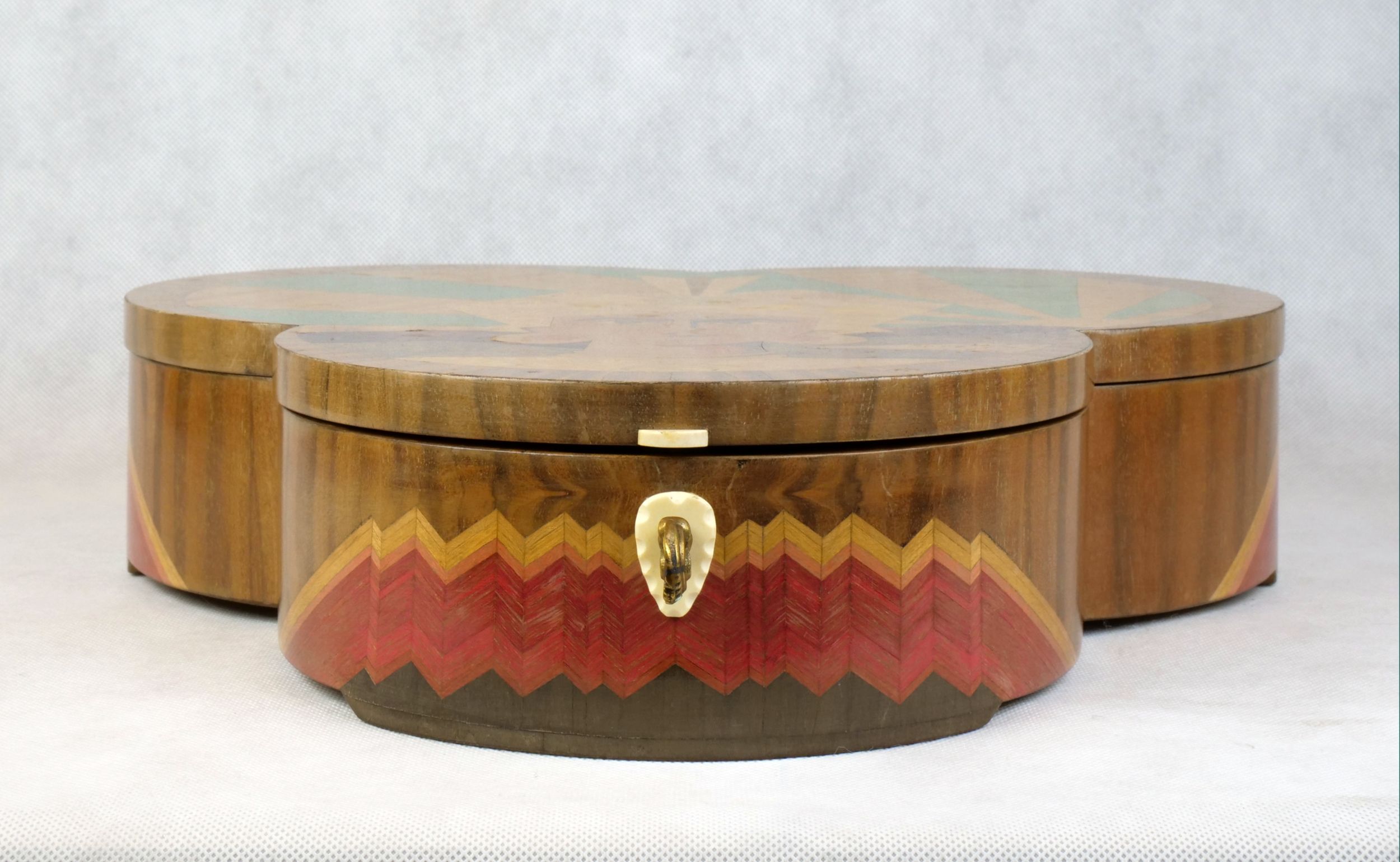 art deco kazeta (šperkovnice) z ořechového masivu, výtvarně působivé barevné intarzování, opravovaný zámek, stopy používání, jinak dobrý stav; západní Evropa, kolem roku 1925, šířka 33 cm, výška 8 cm