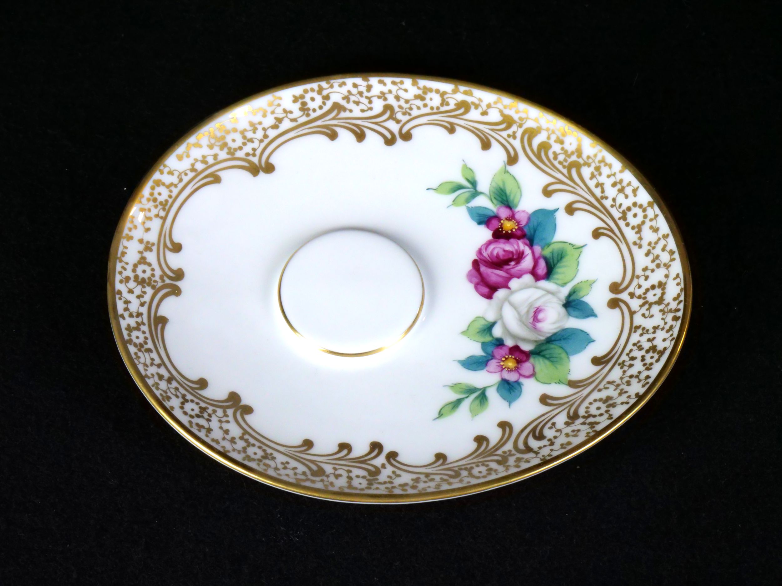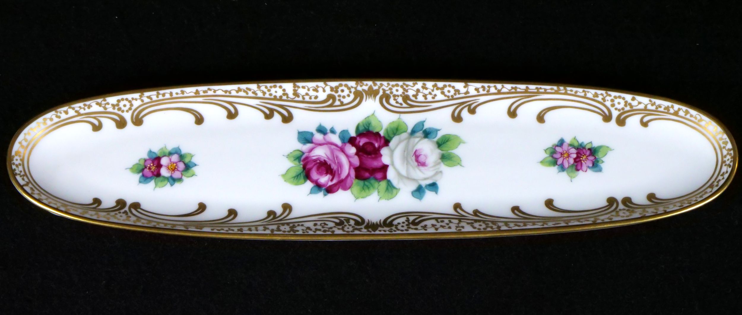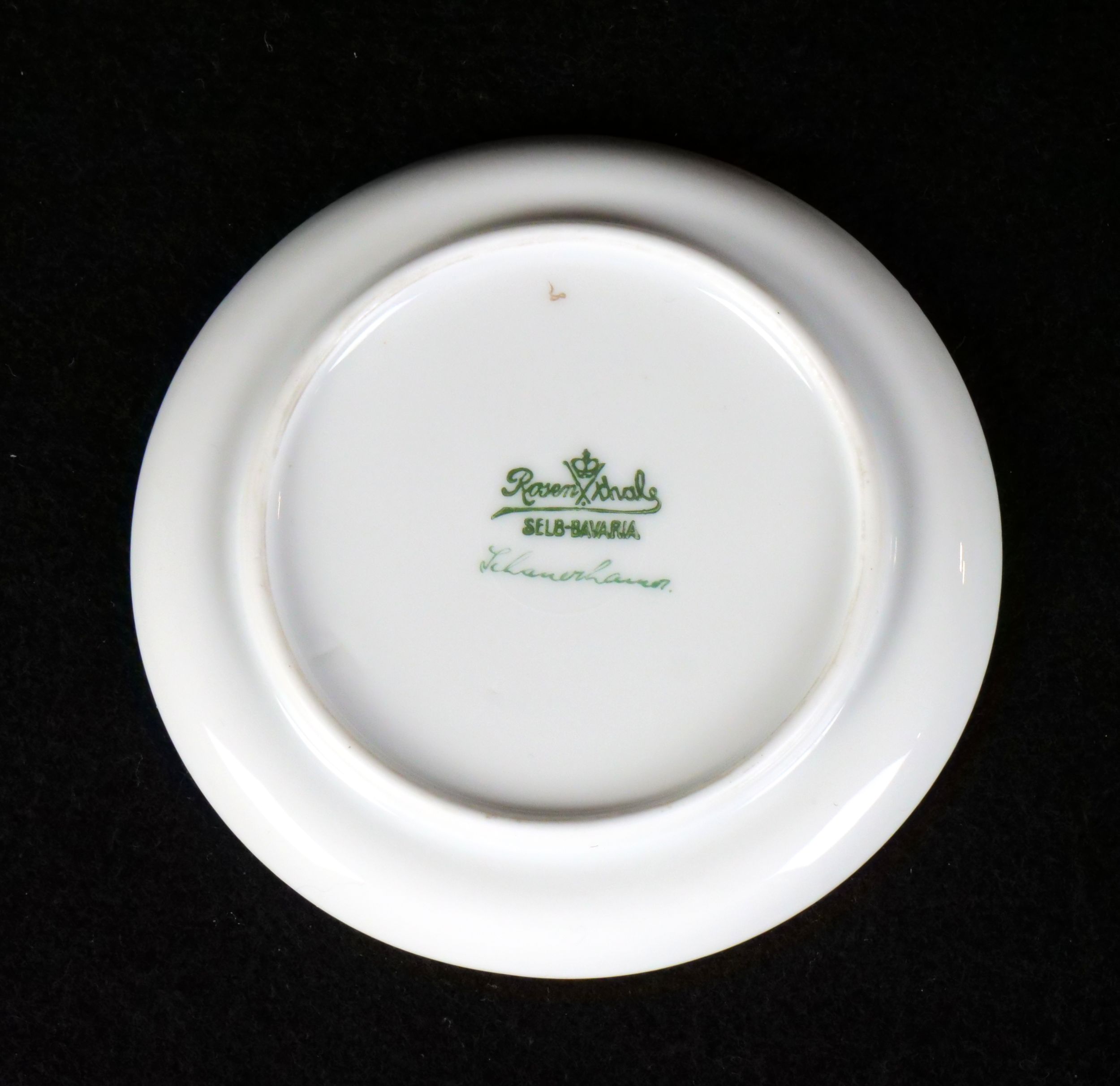 dámská stolní psací souprava značky Rosenthal, 4 kusy - kalamář s podmiskou, miska na pera, miska na drobnosti a kolíbka na vysoušení inkoustu, výroční značení k 50. výročí vzniku porcelánky, Německo 1929; délka misky na pera 24,5 cm, výška vysoušecí kolíbky 6,5 cm; sběratelsky zajímavé