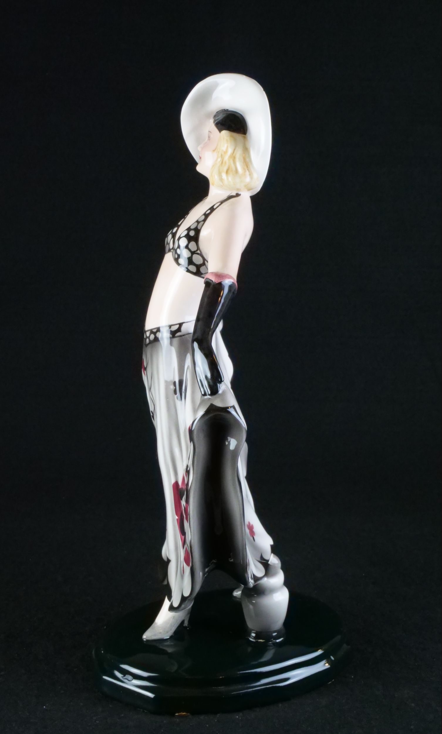kameninová figura dívky, vyrobila vídeňská manufaktura Goldscheider, model 6757, modelér Stephan Dakon, Rakousko, 30. léta 20. století, značeno, signováno, publikováno ve firemním katalogu; výška 34 cm, šířka 25 cm