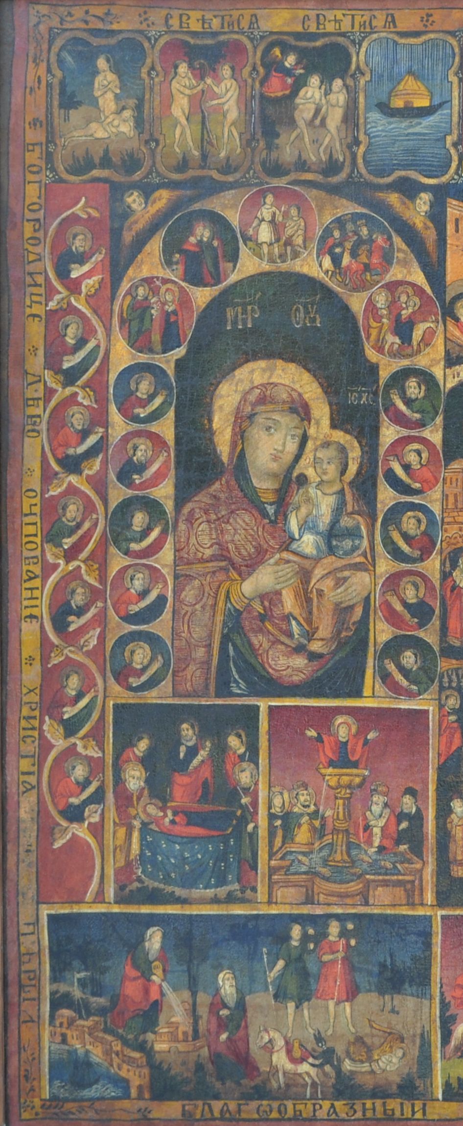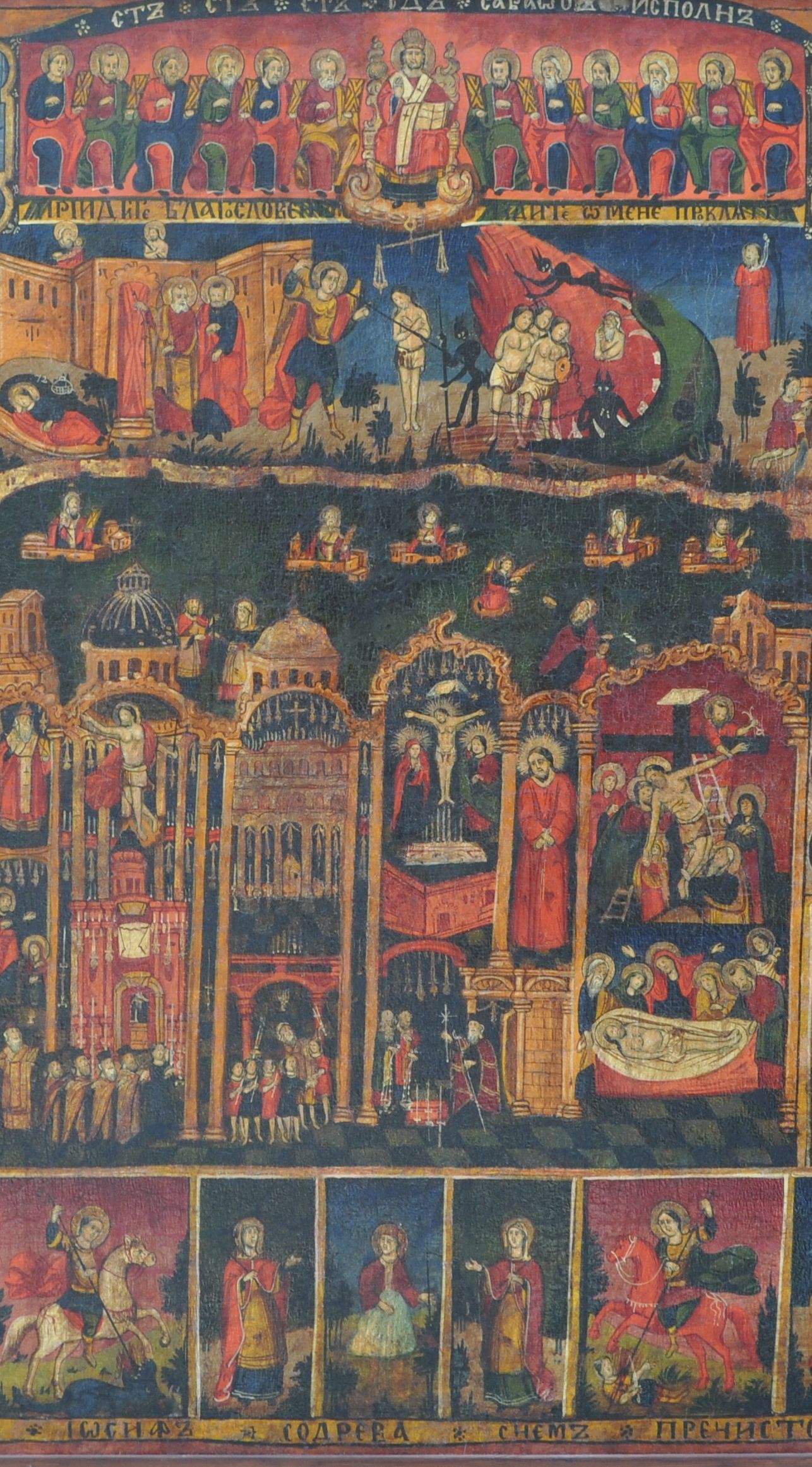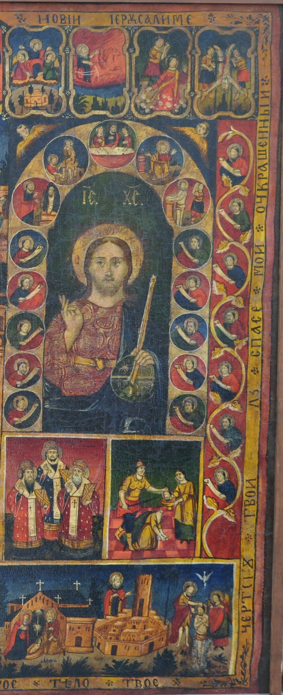olej na plátně v ikonopisném pojetí, rozdělený jako ikonostas s hlavními postavami Krista Pantokratora (Krista Soudce) a Bohorodičky (Hodégetrie), s apoštoly a proroky a s výjevy ze Starého a především Nového zákona, rozměrné plátno s šířkou 172 cm a výškou 127 cm, oblast Haliče (západní Ukrajina), 1. polovina 19. století; odborně restaurováno; znalecký posudek, osvědčení NPÚ k trvalému vývozu