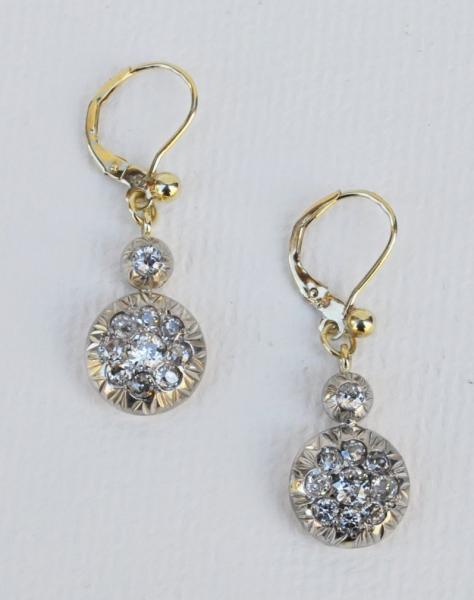 zlaté náušnice s diamanty briliantového brusu, Au btto 4,30g/585/000, diamanty o celkové hmotnosti 1,08 ct, barva F-G, čistota VS-Si, diamanty zasazené do stříbra (Ag 925/000), západní Evropa, pozdější české puncovní značení pro zlato a stříbro, 80. léta 20. století; délka 3,5 cm; přiložen znalecký posudek