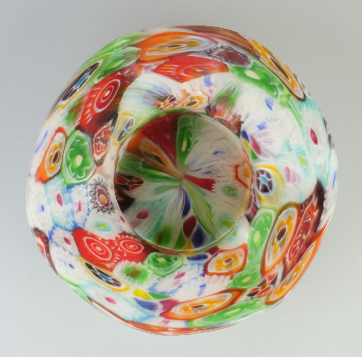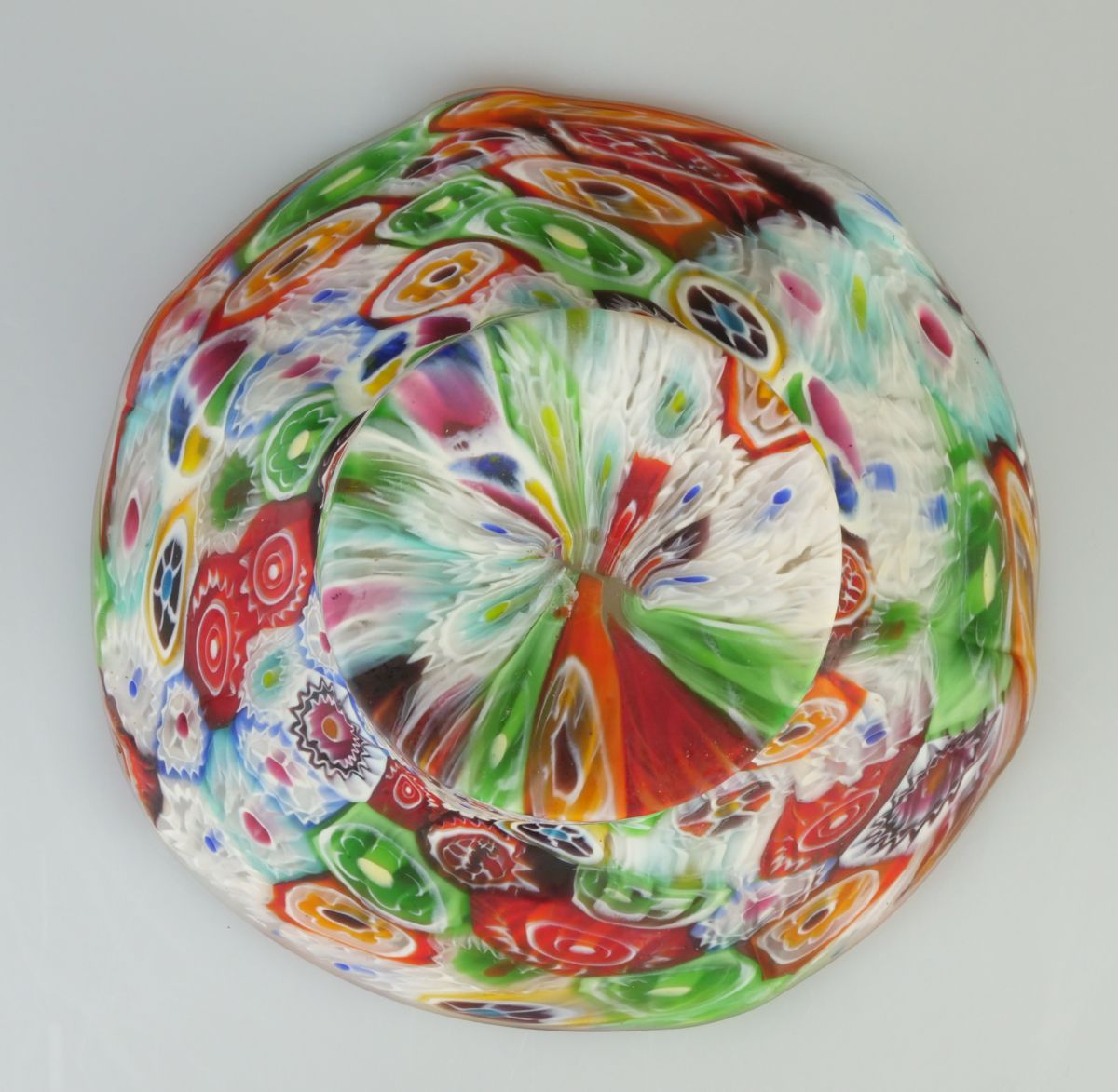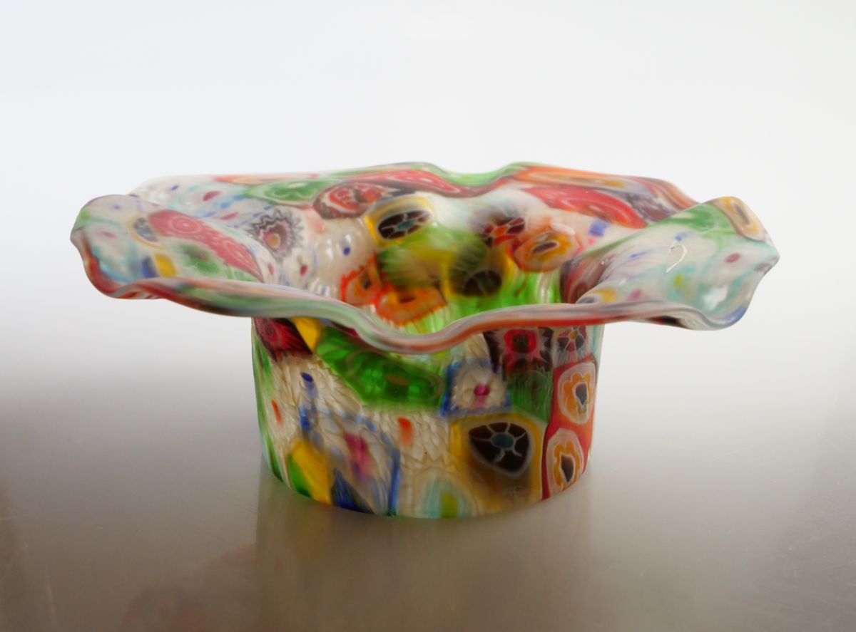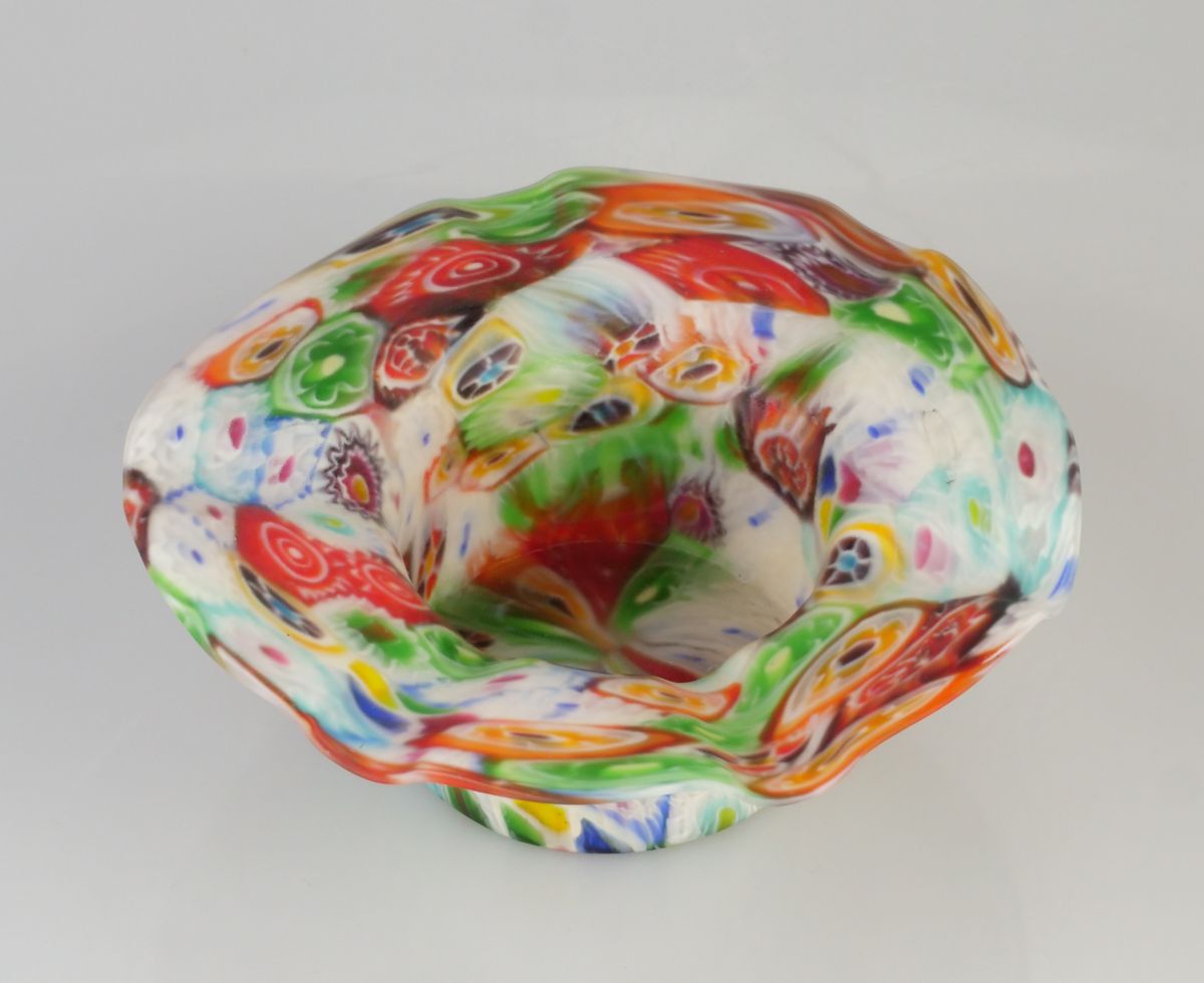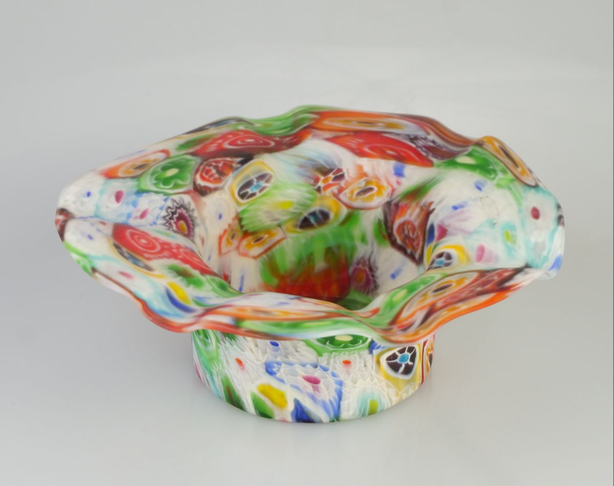 skleněná miska v pestrobarevném dekoru millefiori, Itálie, Murano, kolem r. 1930, průměr 13,5 cm, výška 5 cm