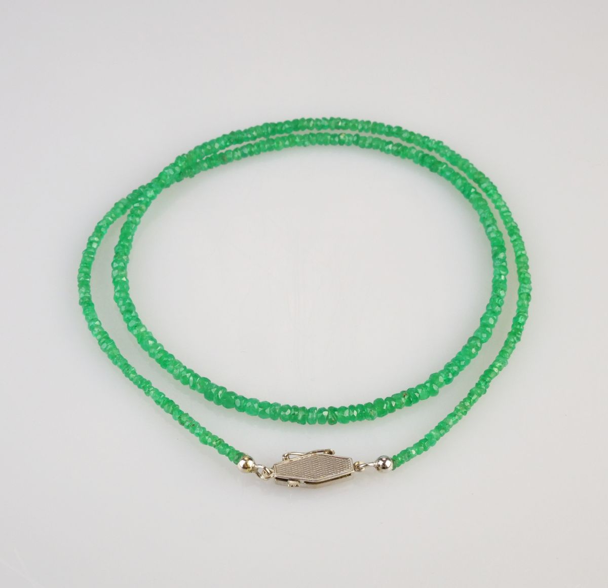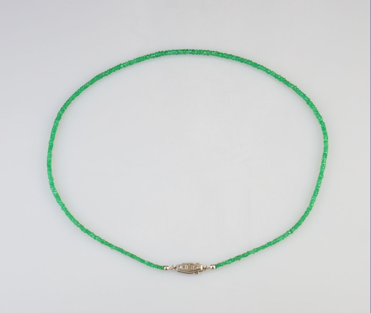 náhrdelník z broušených kolumbijských smaragdových korálků, ozdobný zlatý uzávěr s leukosafíry, Au btto 6,22g/585/000, délka 47,5 cm, puncováno, Československo kolem roku 1930
