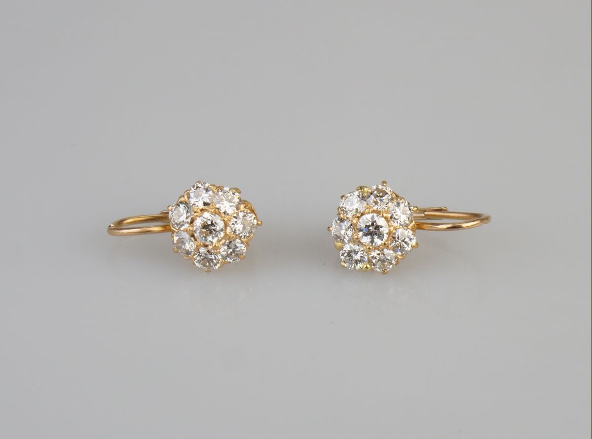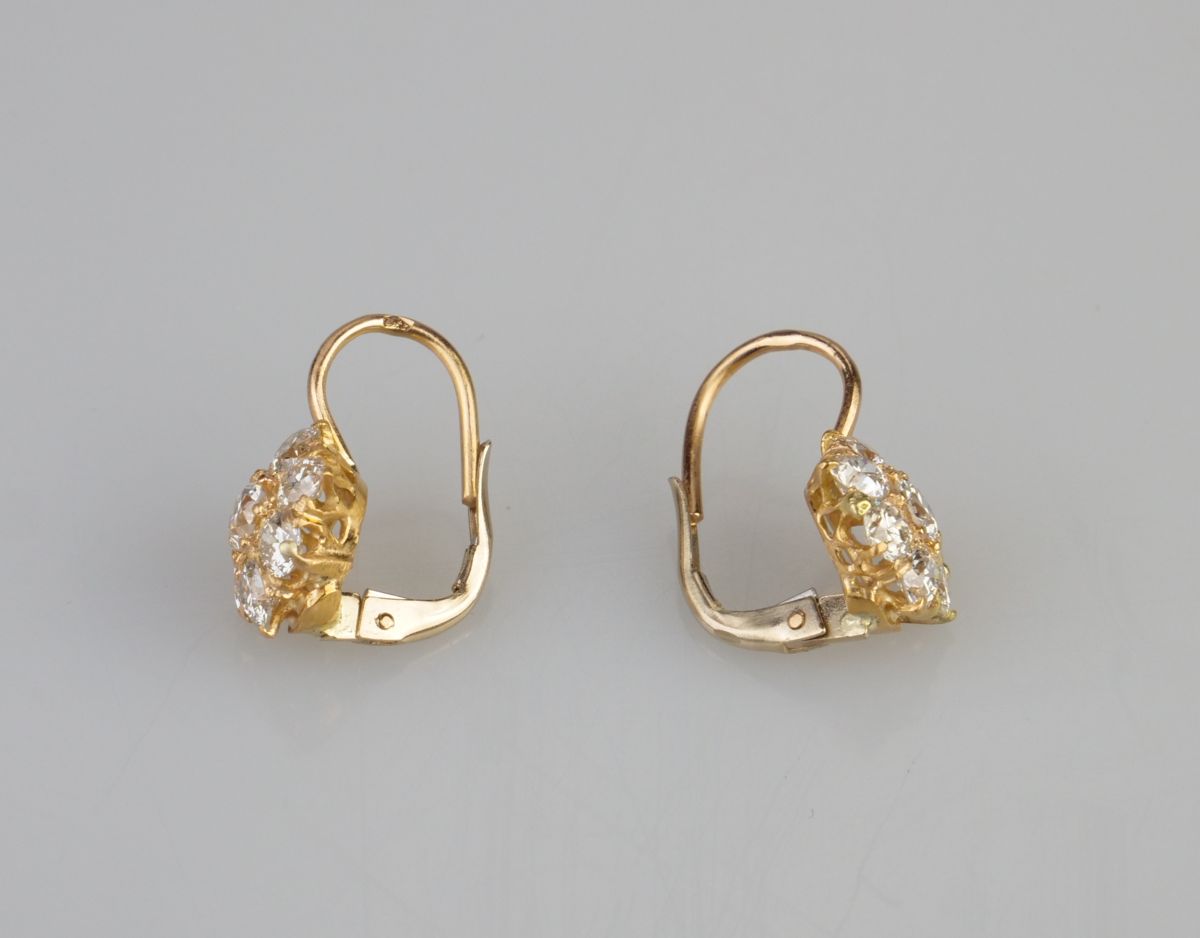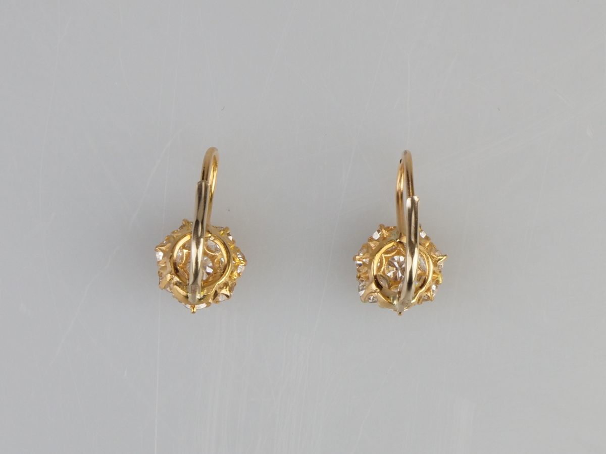 náušnice ze žlutého zlata s diamanty briliantového brusu, Au btto 2,12 g/750/000, diamanty o celkové hmotnosti cca 1,2 ct, západní Evropa, kolem r. 1950, pozdější český punc; délka 1,5 cm
